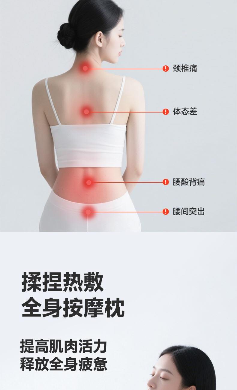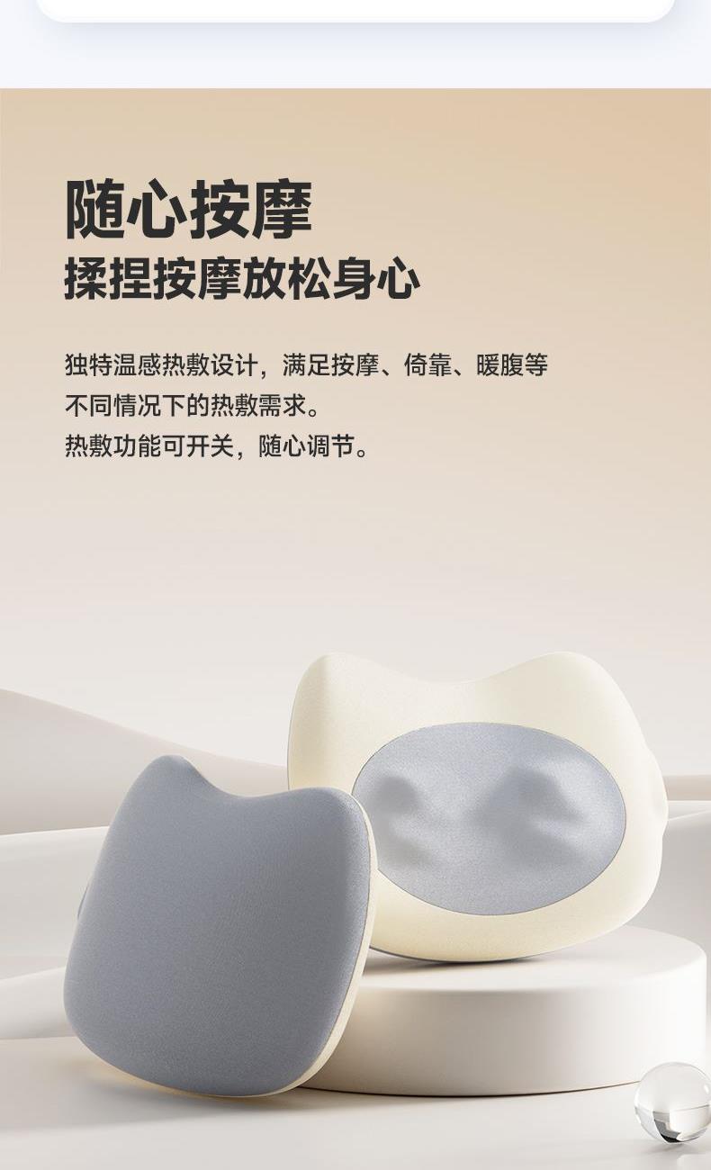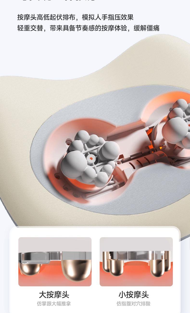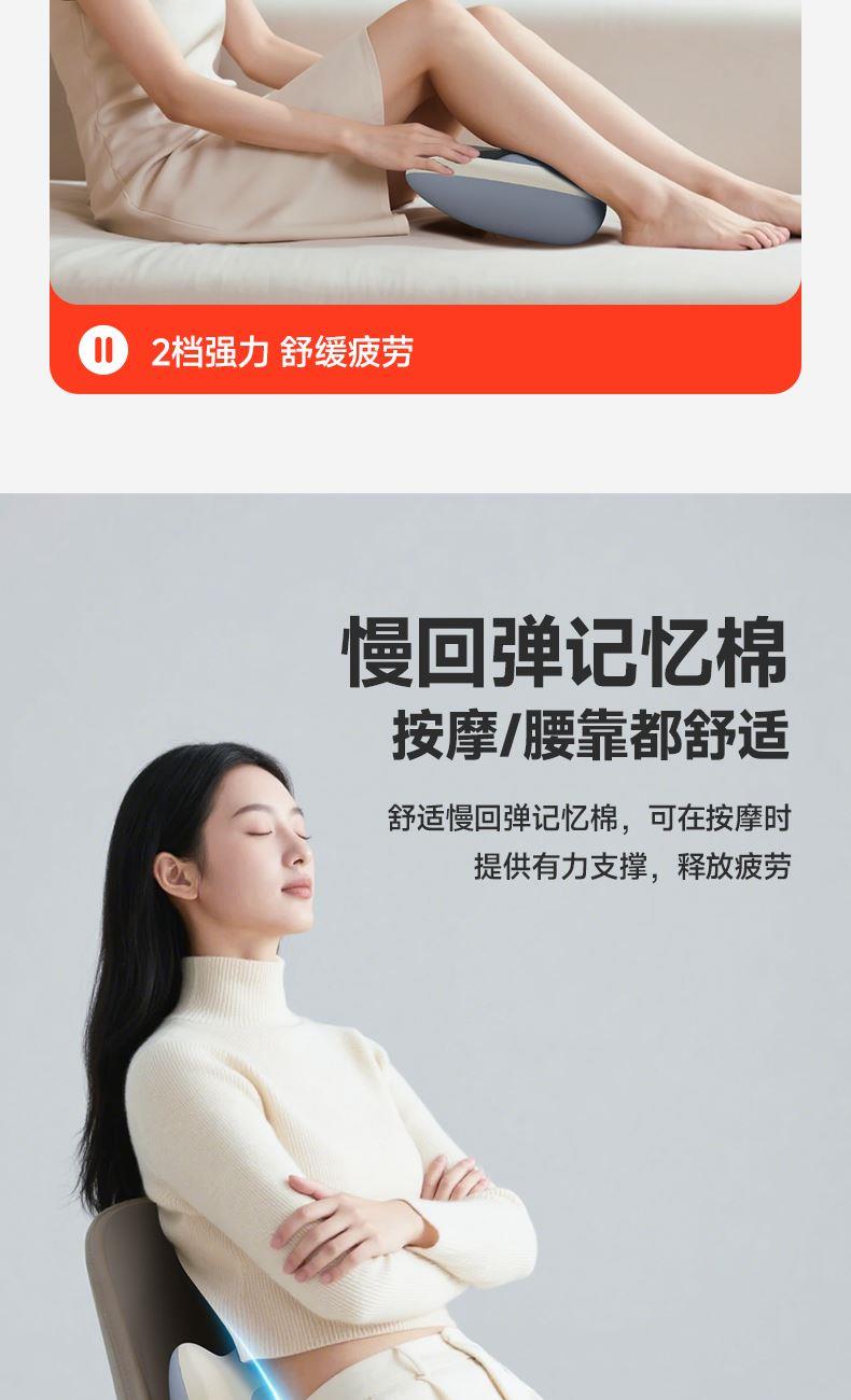按摩腰靠2合一、全身多部位按摩 揉捏热敷,真人手法按摩、舒缓强劲双模式切换 每头十球,一共20个按摩球,立体按摩 慢回弹记忆棉、热敷按键,一键开关 额定功率:9W 净重/毛重:1.63g; 充电方式:Type-C, 包装尺寸:390*250*150mm 包装方式:彩邮外