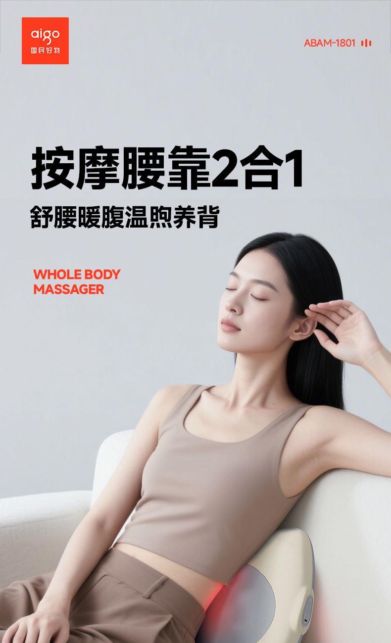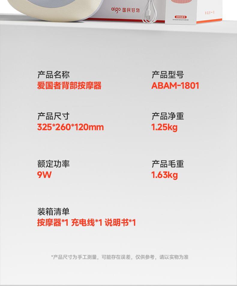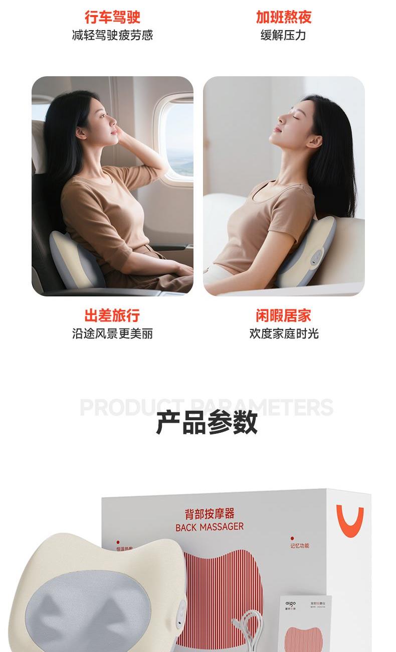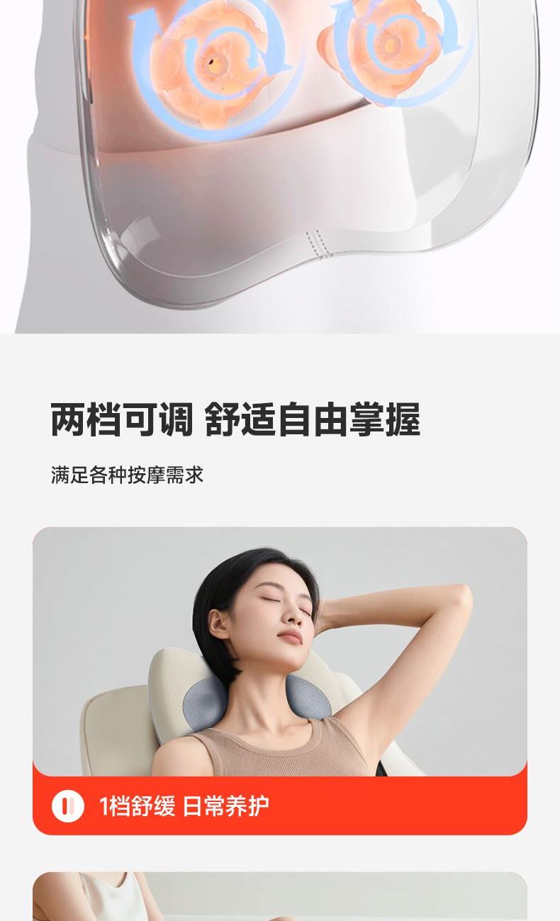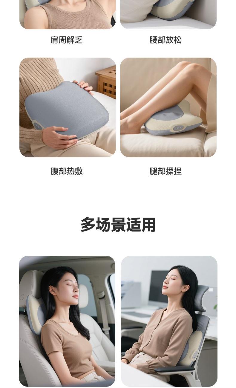 按摩腰靠2合一、全身多部位按摩 揉捏热敷,真人手法按摩、舒缓强劲双模式切换 每头十球,一共20个按摩球,立体按摩 慢回弹记忆棉、热敷按键,一键开关 额定功率:9W 净重/毛重:1.63g; 充电方式:Type-C, 包装尺寸:390*250*150mm 包装方式:彩邮外