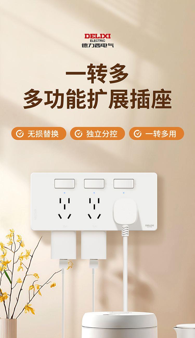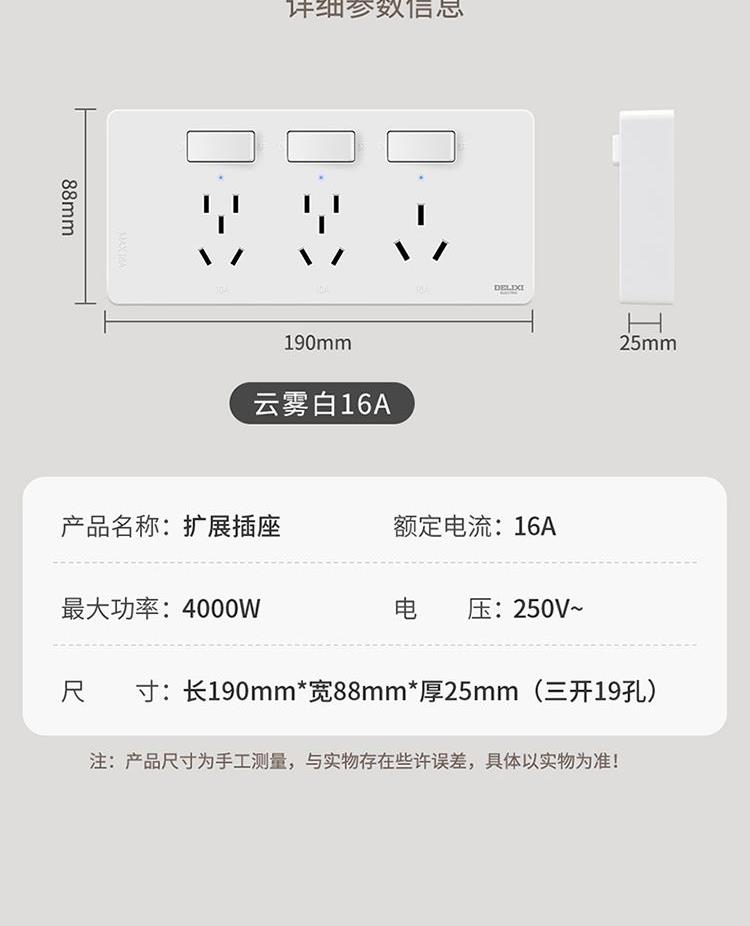 产品:德力西电气 DETC系列十六孔插座10A+三孔插座16A 品 牌:德力西电气 产品型号:DETC-X16S1(W) 产品颜色:云雾白 额定电流:16A 额定电压:250V 插座尺寸:190*88*25mm 产品位数:一位三孔(16A)、两位五孔、三位两孔、无线(需要自行接线)
