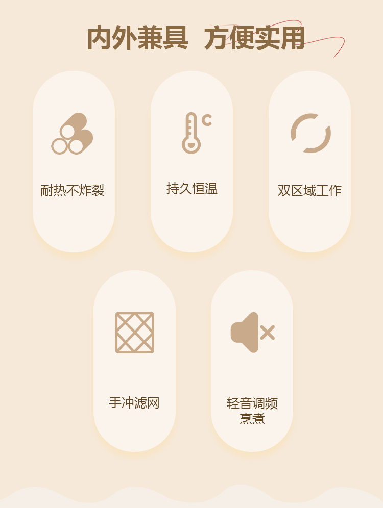 产品参数: 额定电压:220V~ 额定频率:50Hz 额定功率:800W 额定容量:0.9L 净重:1.3Kg 毛重:1.7Kg 整箱净重:13.6Kg 整箱毛重:14.8Kg 彩盒尺寸:340*235*225mm 外箱尺寸:695*485*468mm 产品卖点: 60度恒温暖杯设计,暖饮温养更滋润 手冲滤网,入口齿留香 自动变频技术,留存食物精华养分 养生壶、恒温杯垫、手冲咖啡滤网、茶饮杯四合一功能, 满足不同口味需求 静音调频烹煮,不打扰工作、休息 60秒提壶记忆 每次倒水不操心