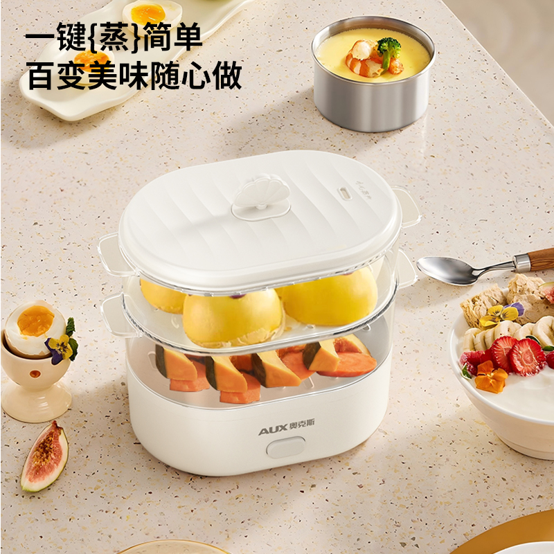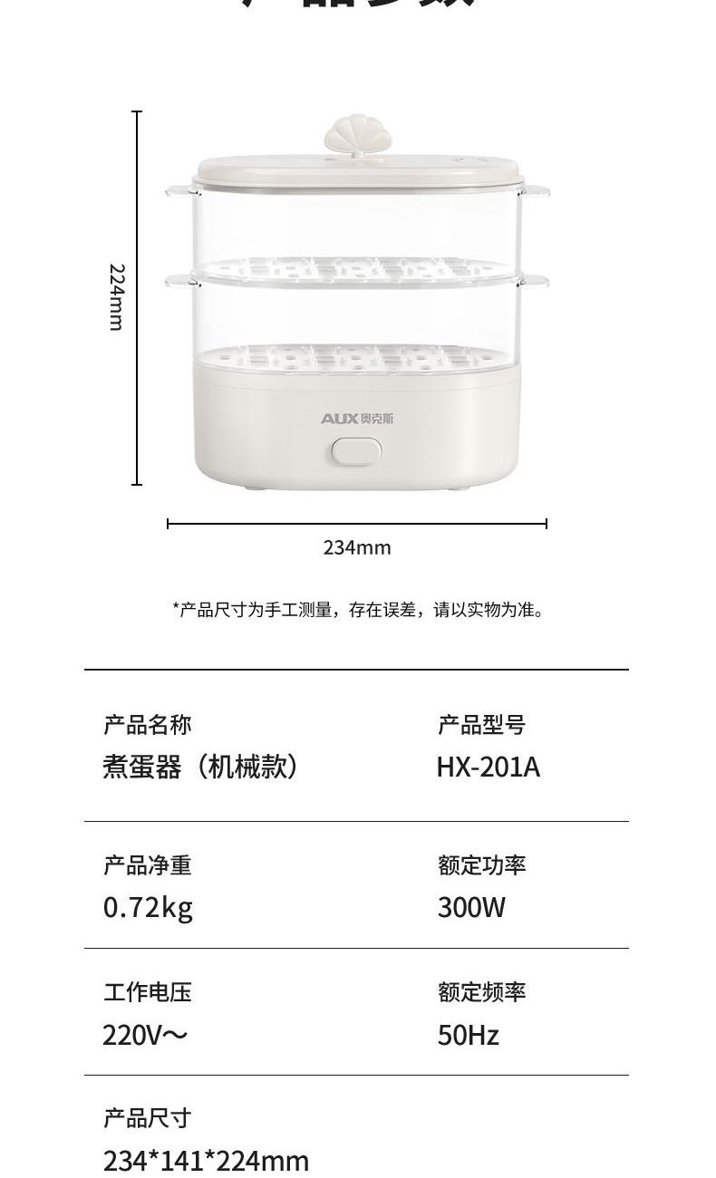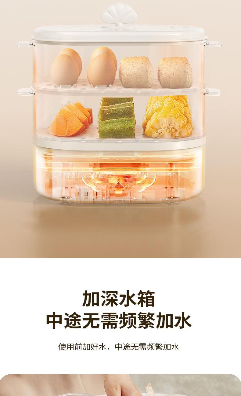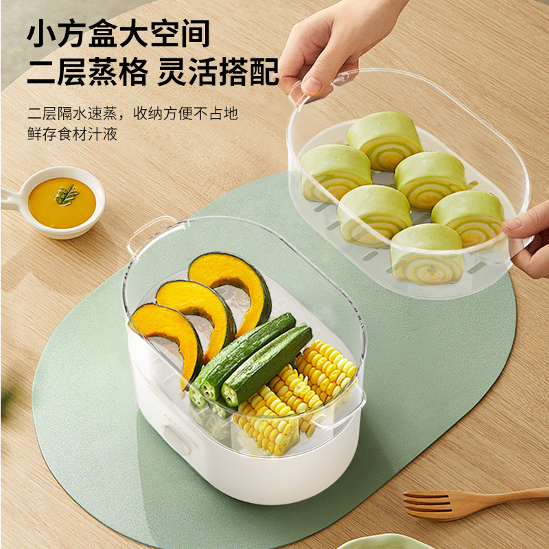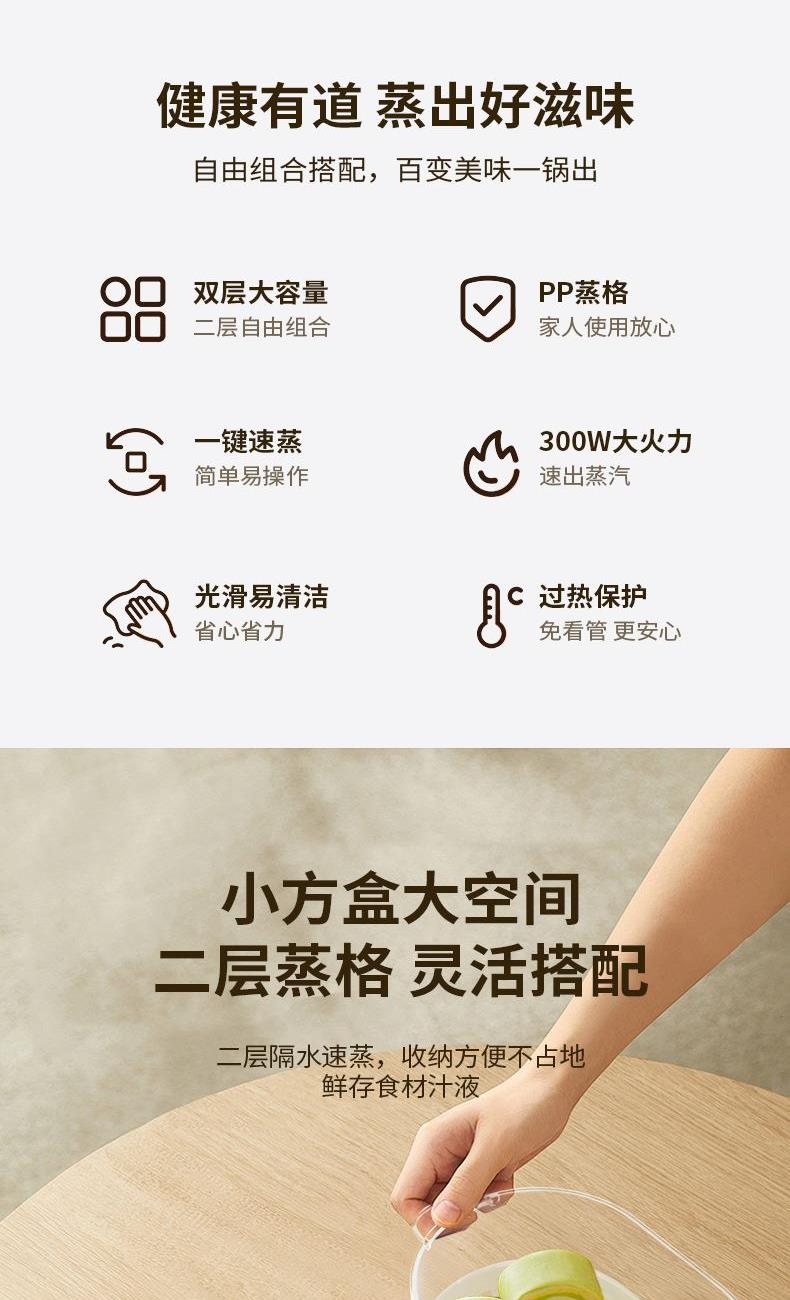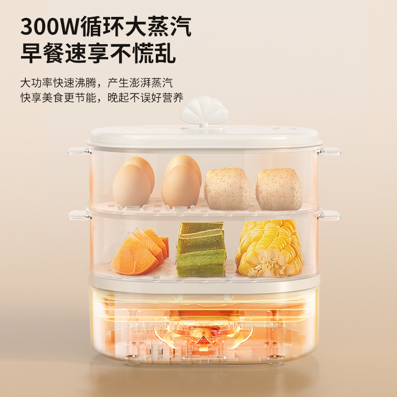 额定电压:220V~ 额定功率:300W 额定频率:50Hz 材质:易清洗发热底盘:食品级pp,可视化层架:食品级PC,三角护套、电源线 单双层可切换,发挥空间足 扩容方圆蒸笼,体积虽小容量大 300W大火力,360°循环速蒸速熟 冷凝水回流设计,包子不再湿哒哒 双耳提手蒸方便,轻轻松松端上桌