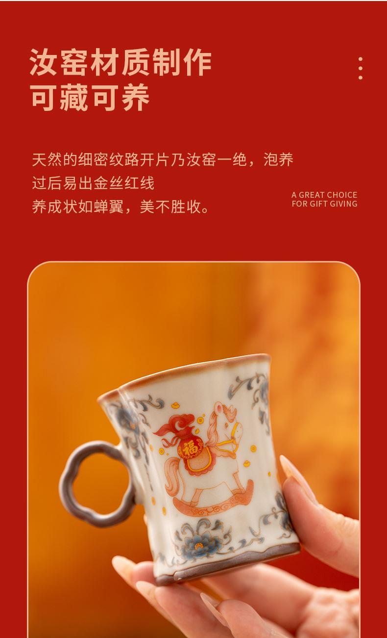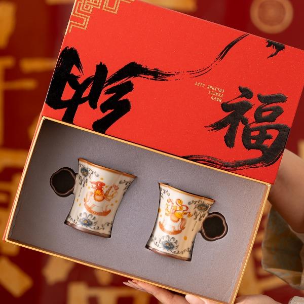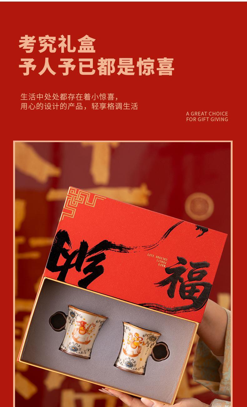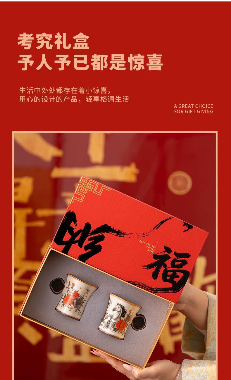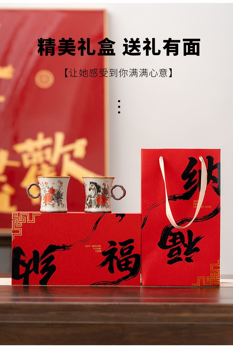 配 制: 2杯 1礼盒 手提袋 材质:汝黄瓷 规格:8.8*7.3cm 容量:90ml 推荐说明:正面马上有钱,反面马上有福。亚黄汝瓷,玛瑙入釉,蝉翼开片,家有千财万贯,不如汝窑一片。技术新品。画面堆料技术,富有立体浮雕质感,真实感强。杯身开片,可养瓷。
