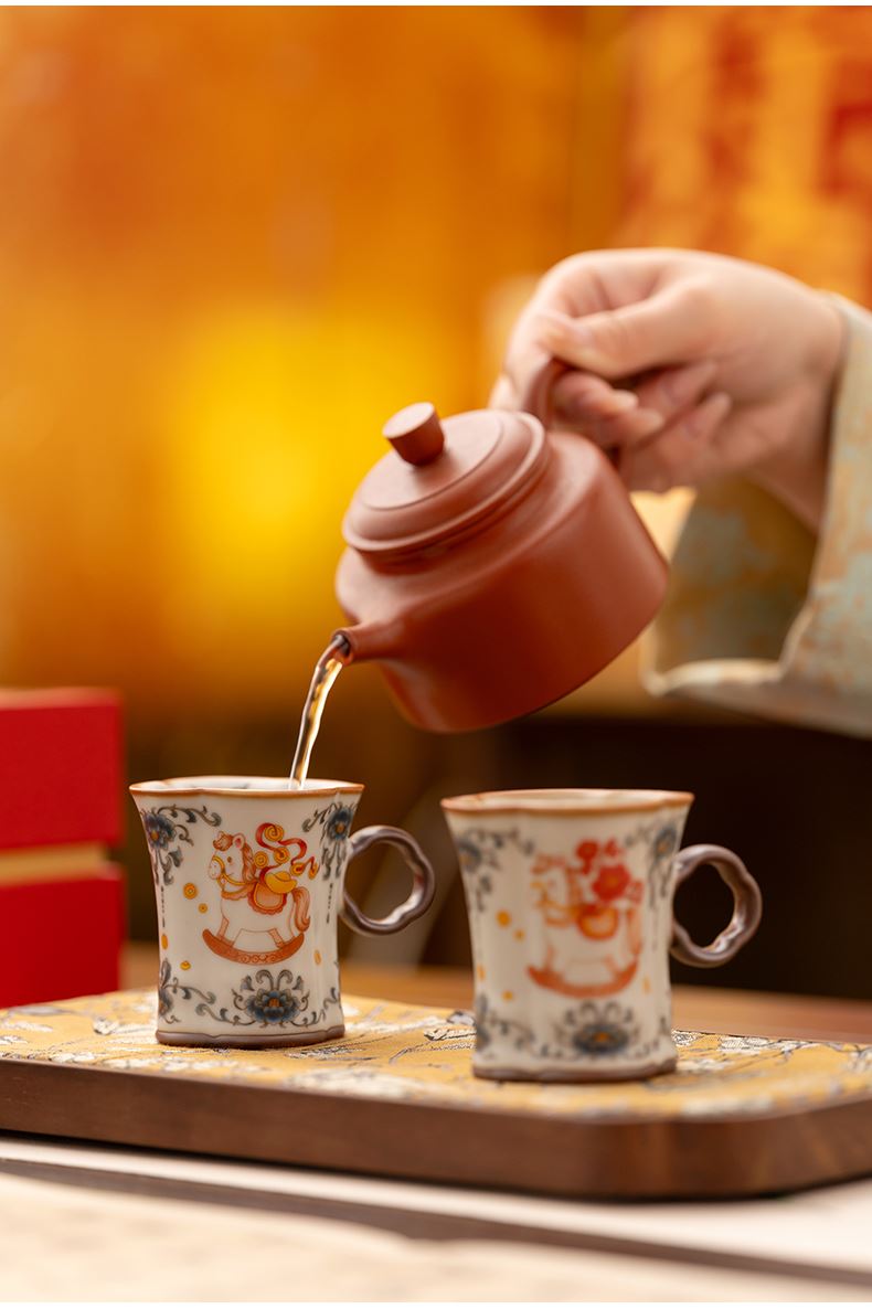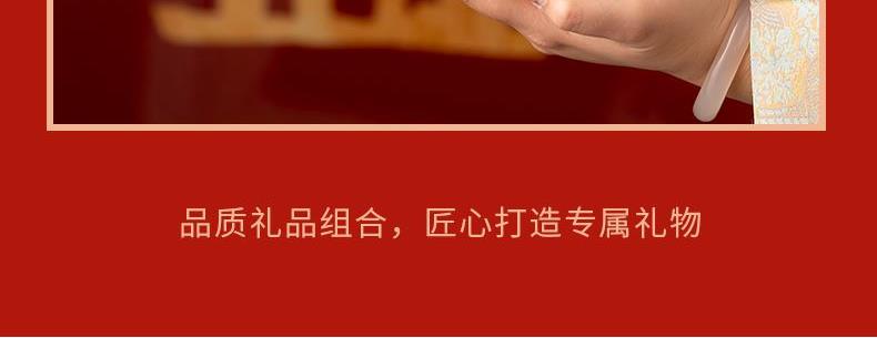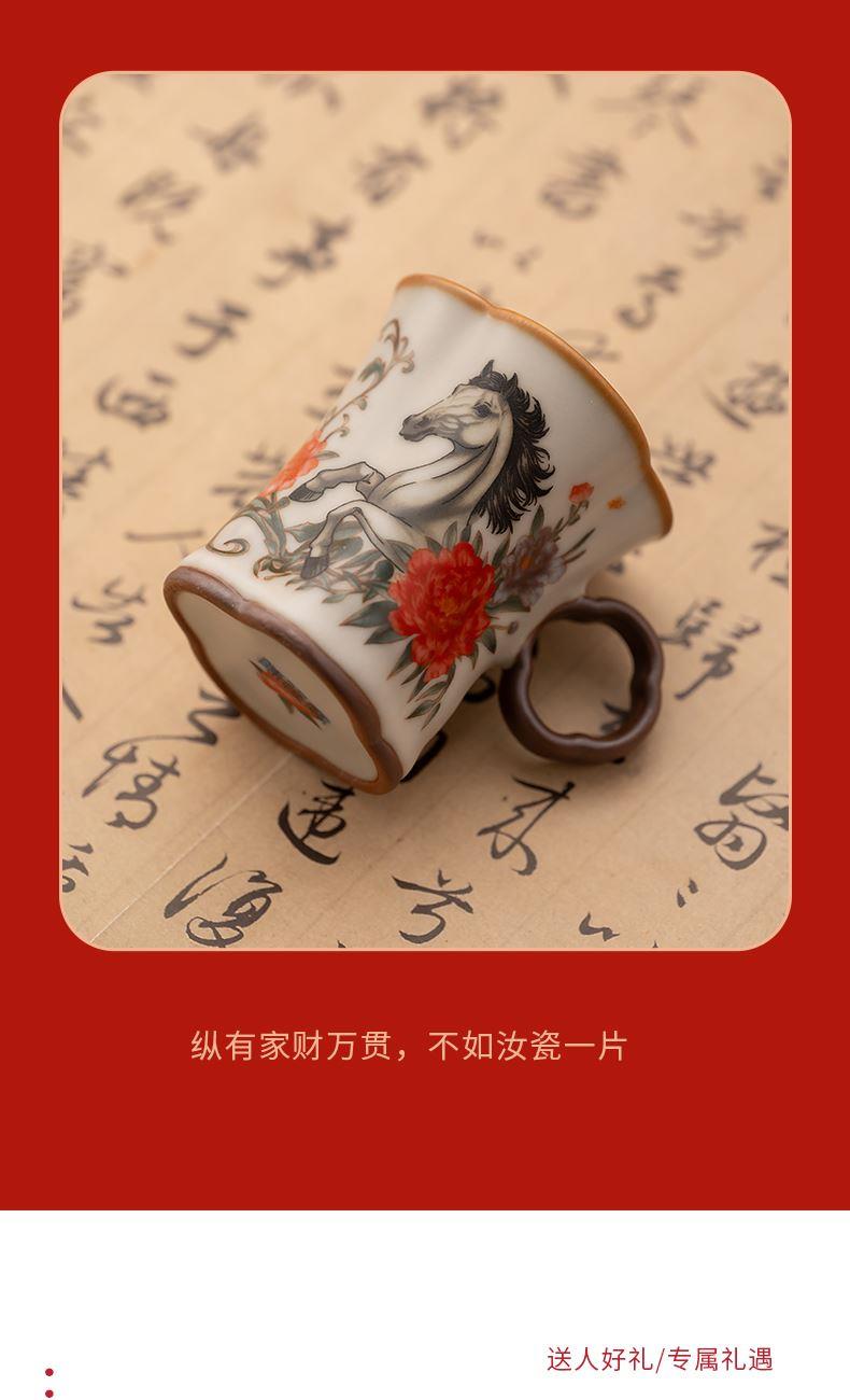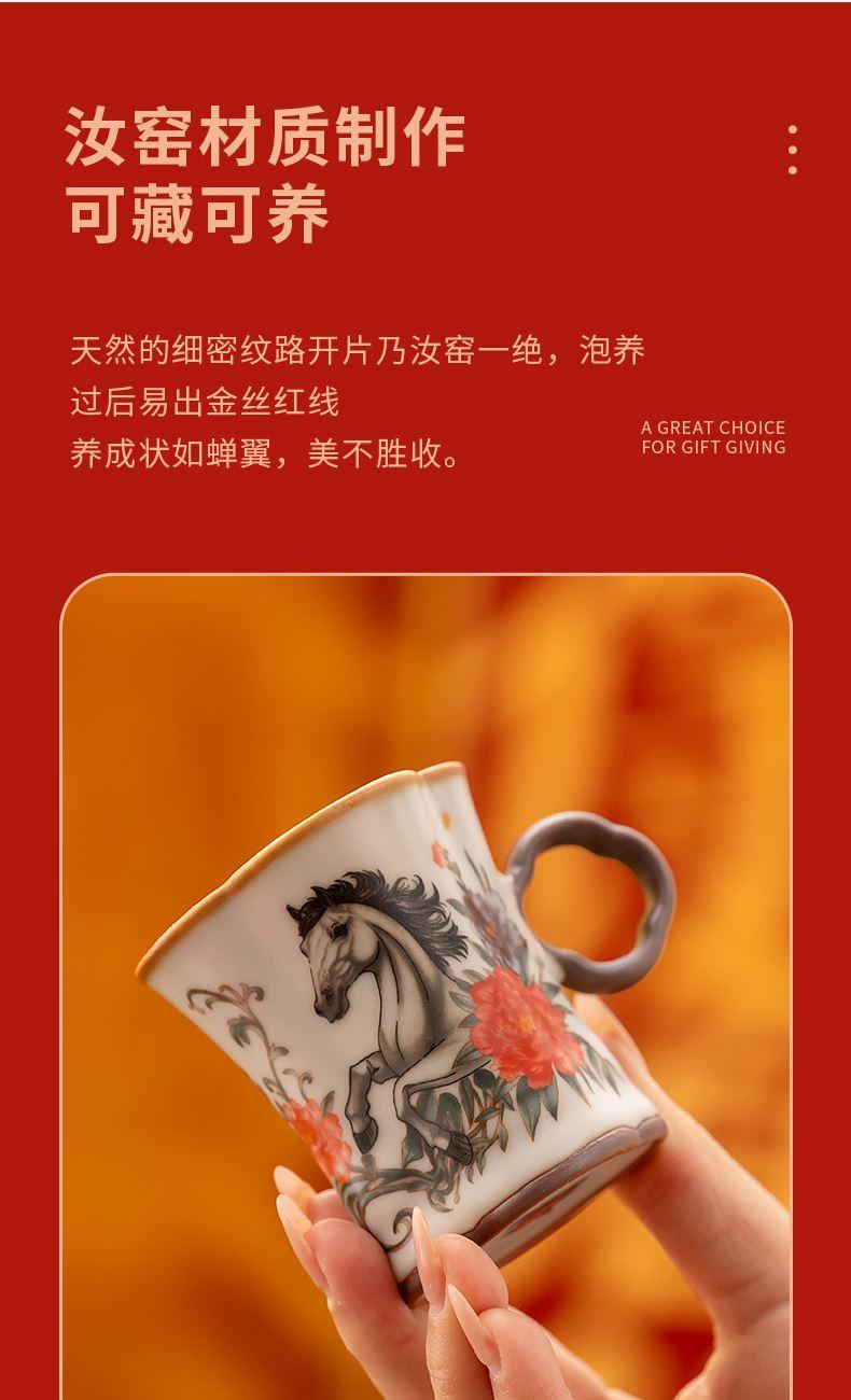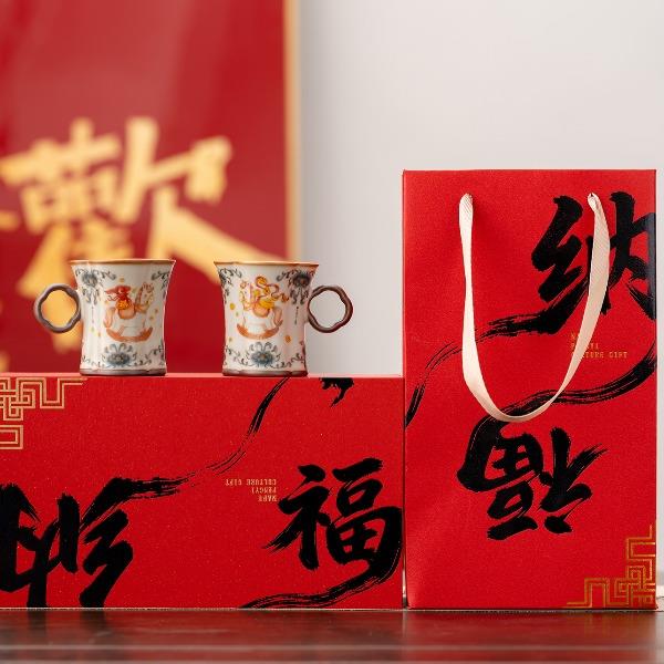配 制: 2杯 1礼盒 手提袋 材质:汝黄瓷 规格:8.8*7.3cm 容量:90ml 推荐说明:正面马上有钱,反面马上有福。亚黄汝瓷,玛瑙入釉,蝉翼开片,家有千财万贯,不如汝窑一片。技术新品。画面堆料技术,富有立体浮雕质感,真实感强。杯身开片,可养瓷。