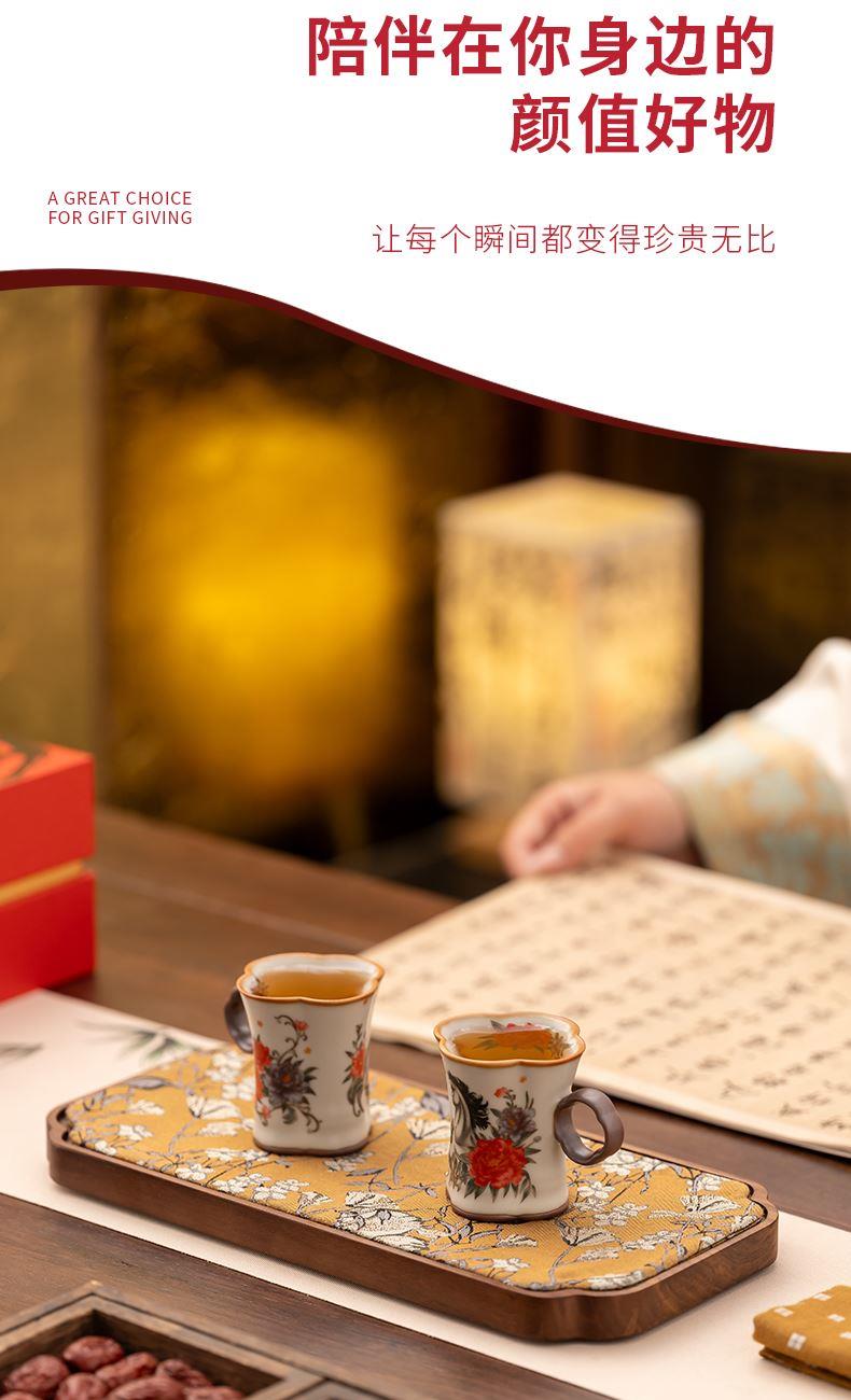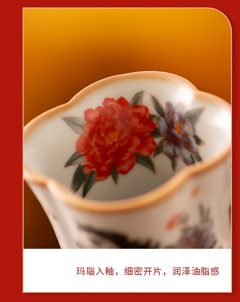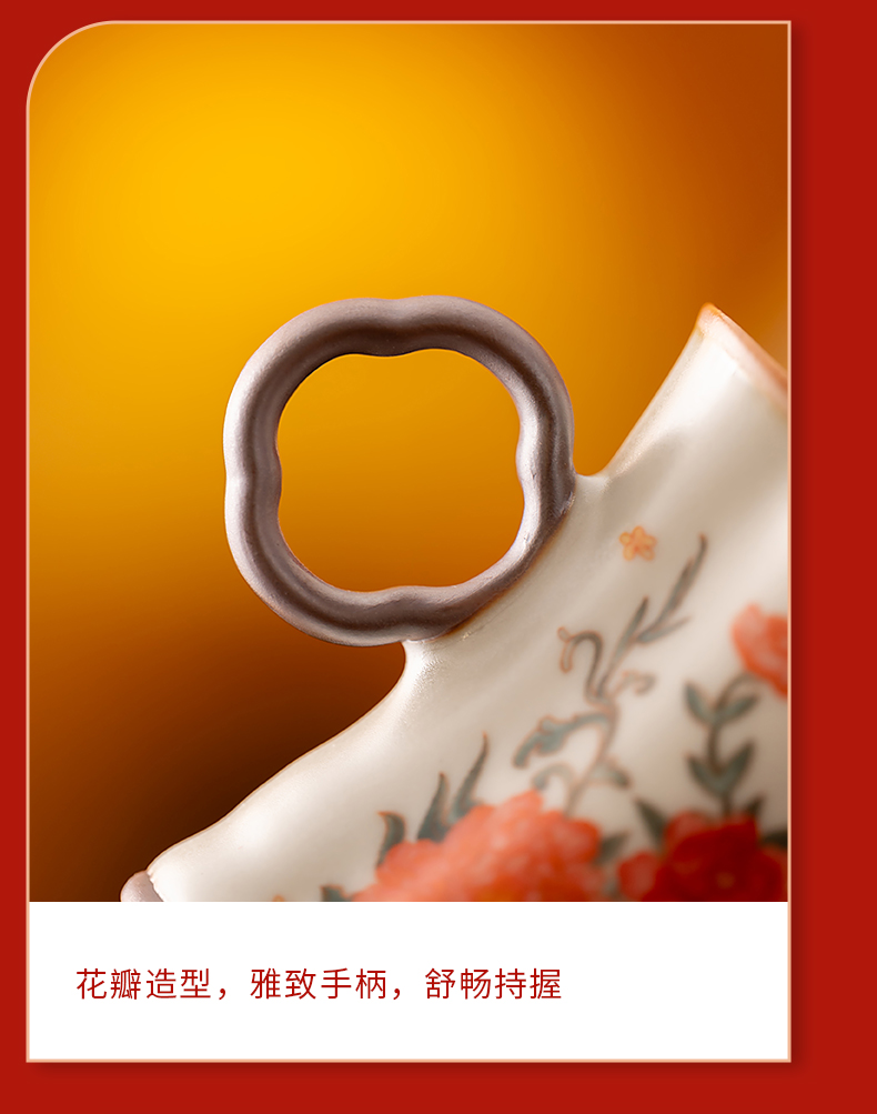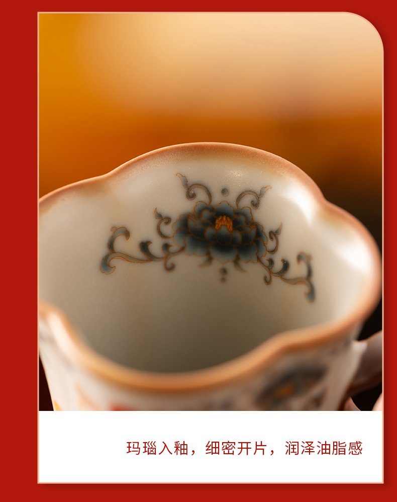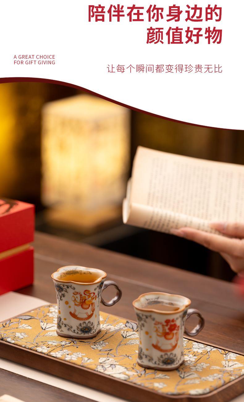 配 制: 2杯 1礼盒 手提袋 材质:汝黄瓷 规格:8.8*7.3cm 容量:90ml 推荐说明:正面马上有钱,反面马上有福。亚黄汝瓷,玛瑙入釉,蝉翼开片,家有千财万贯,不如汝窑一片。技术新品。画面堆料技术,富有立体浮雕质感,真实感强。杯身开片,可养瓷。