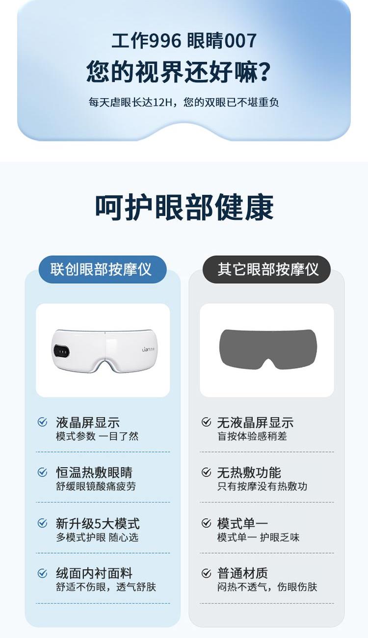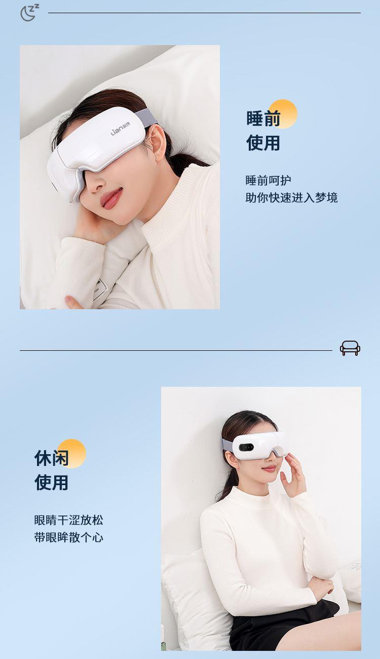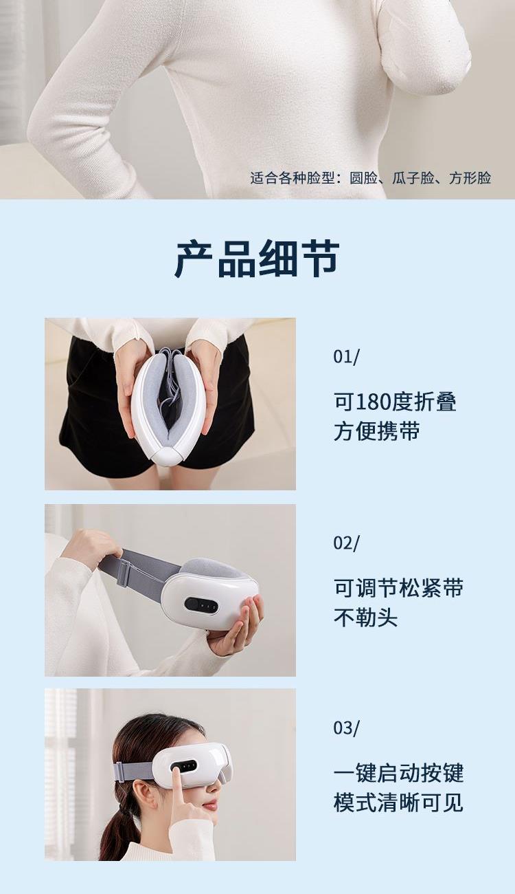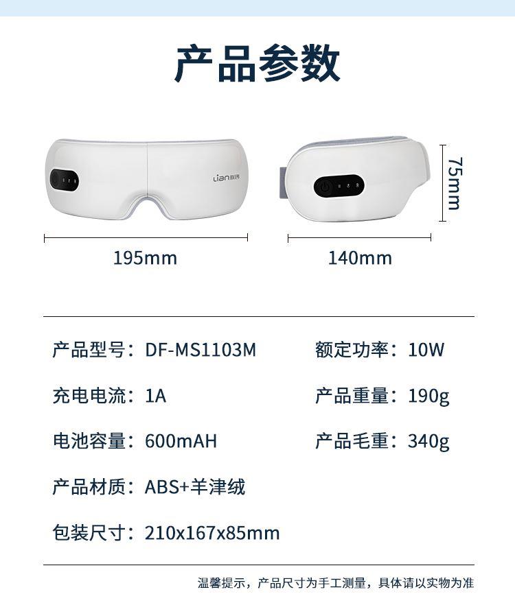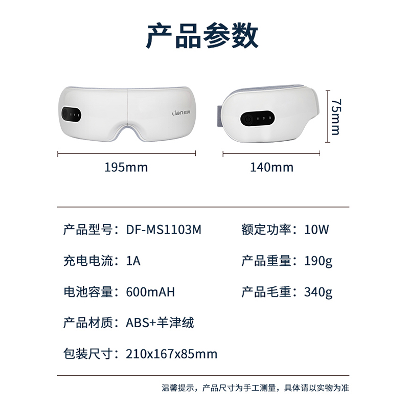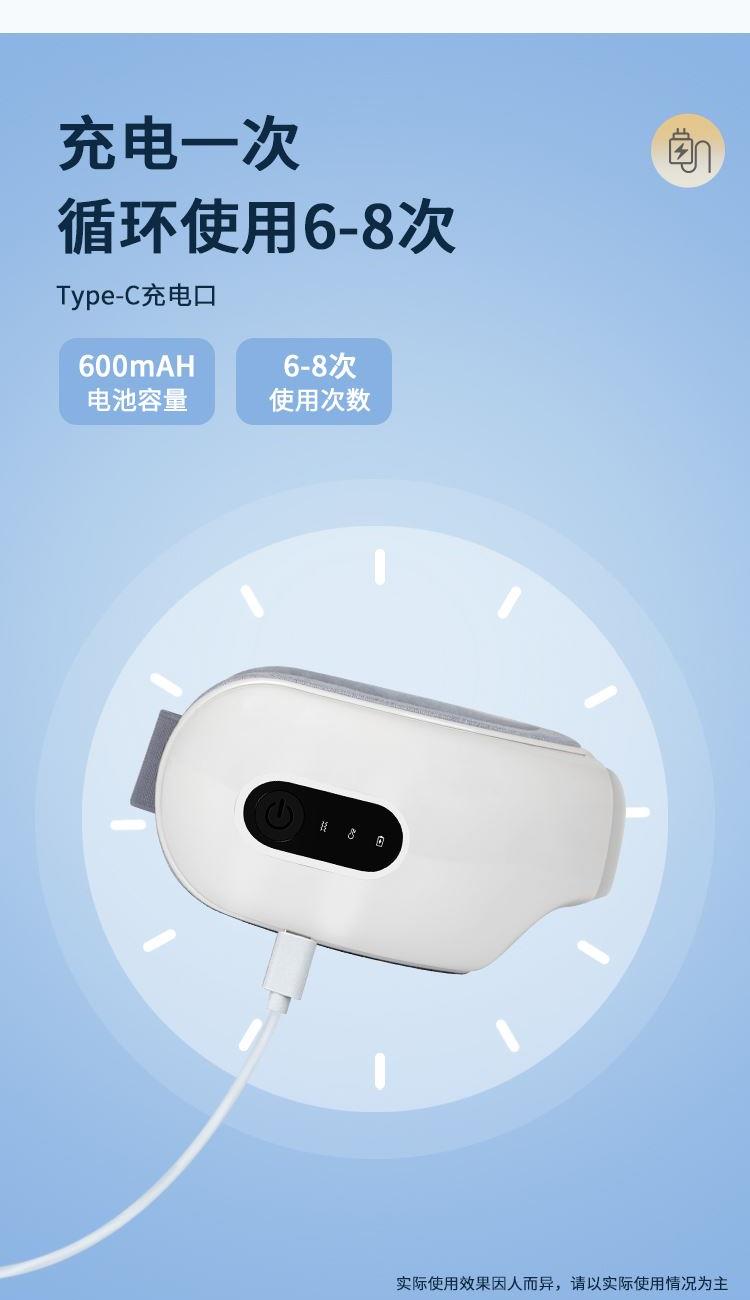 产品参数 充电电压:5V 充电电流:1A 额定功率:10W 电池规格:3.7V/600mAh 产品净重:0.19kg 产品毛重:0.34kg 彩盒尺寸:210×167×85mm 产品特点 1、液晶屏显示,模式参数,一目了然; 2、恒温热敷眼睛,舒缓眼睛酸痛疲劳干涩; 3、安全柔软的羊津绒材质; 4、一键启动,操作简单; 5、可180度折叠设计,携带更方便。