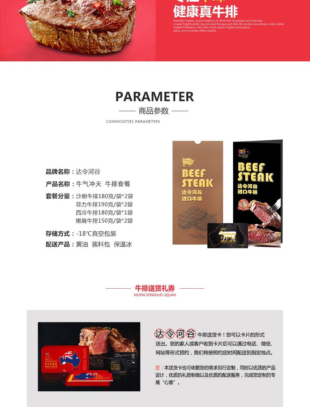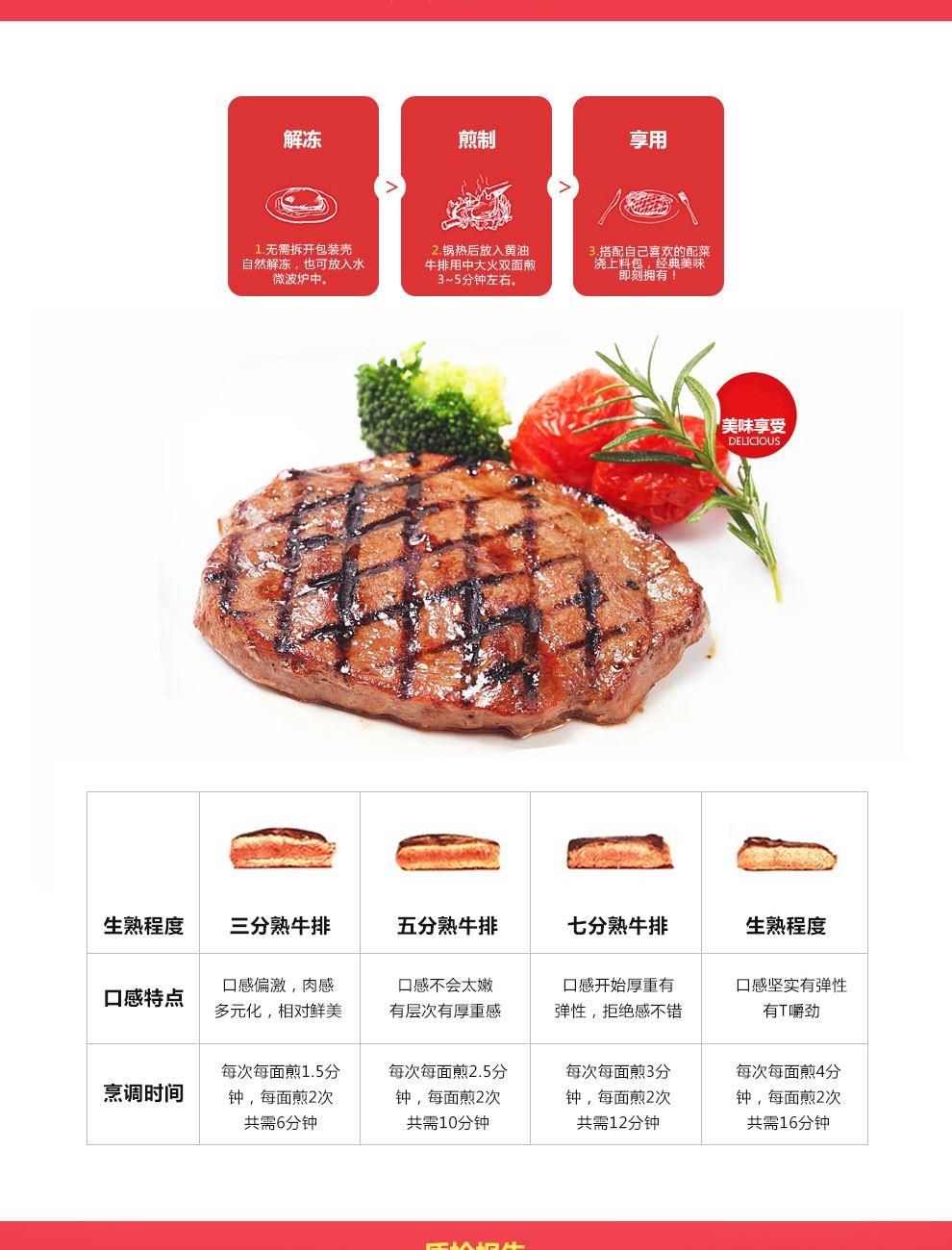 内配: 菲力牛排190g/袋*2袋 沙朗牛排180g/袋*2袋 西冷牛排180g/袋*1袋 嫩肩牛排150g/袋*2袋 赠品:酱料包、黄油、保温冰袋