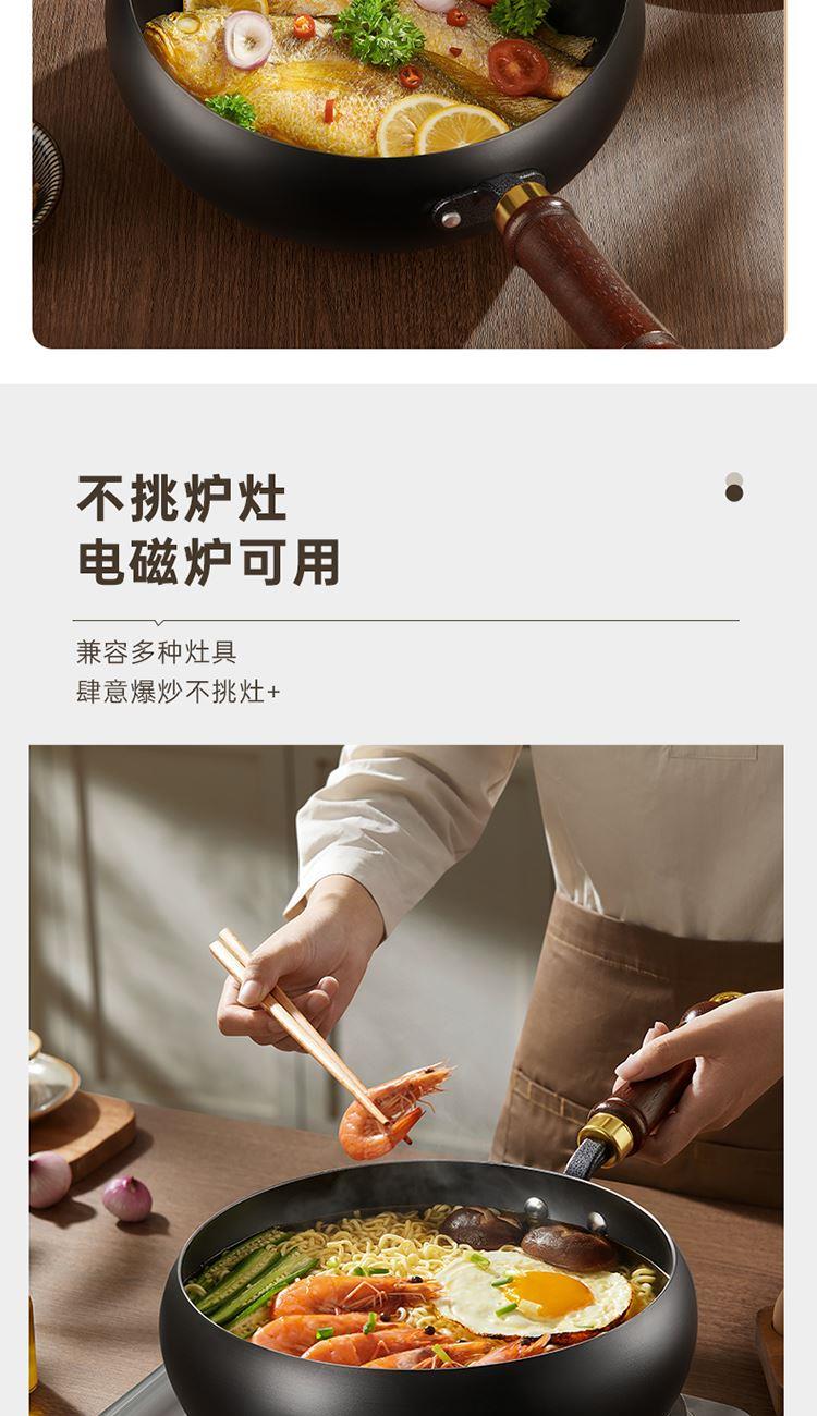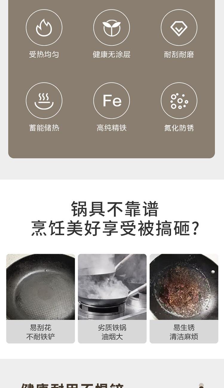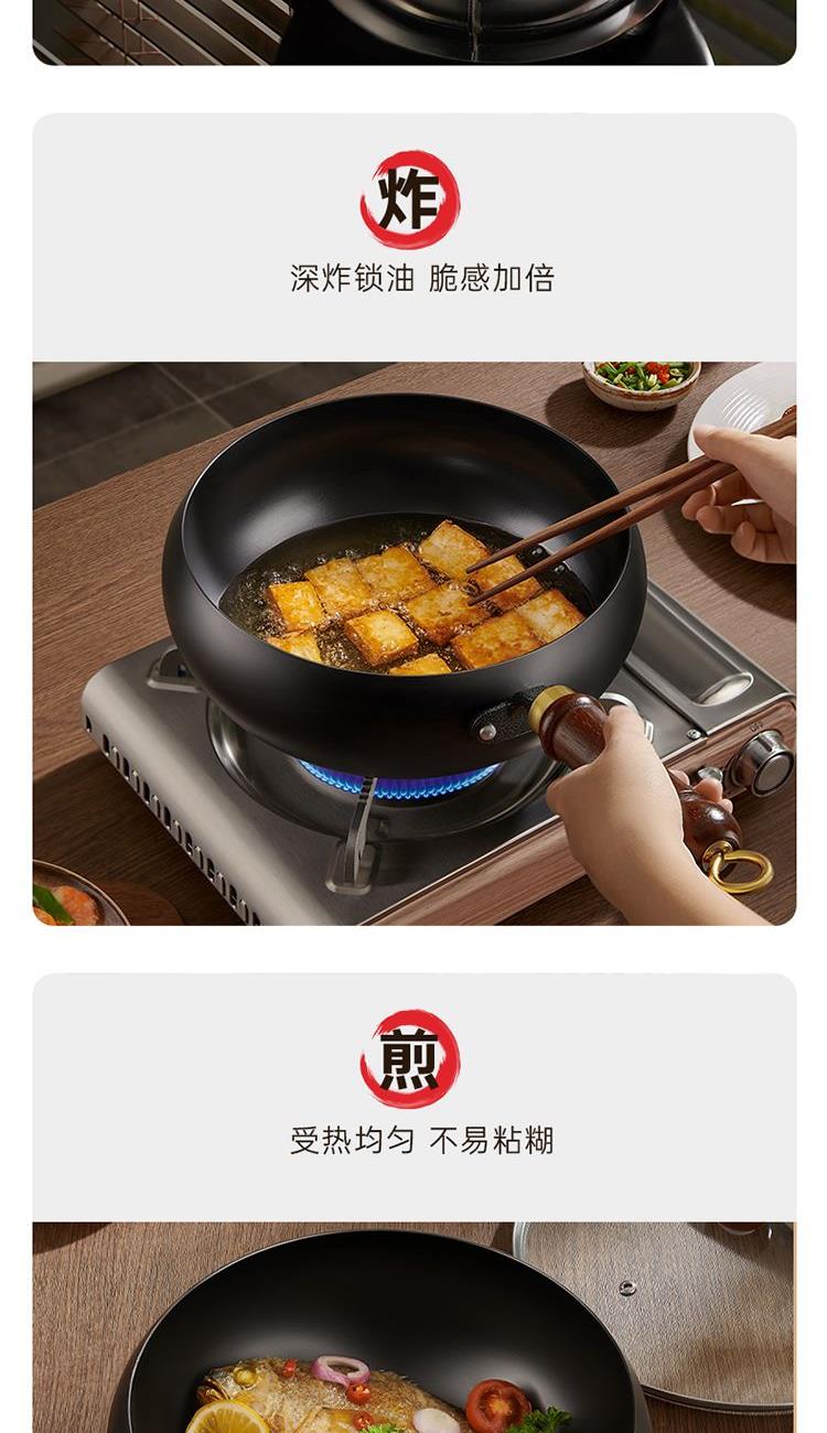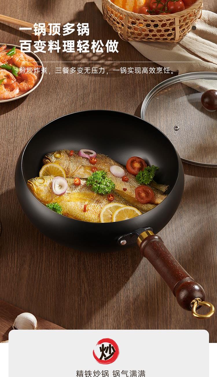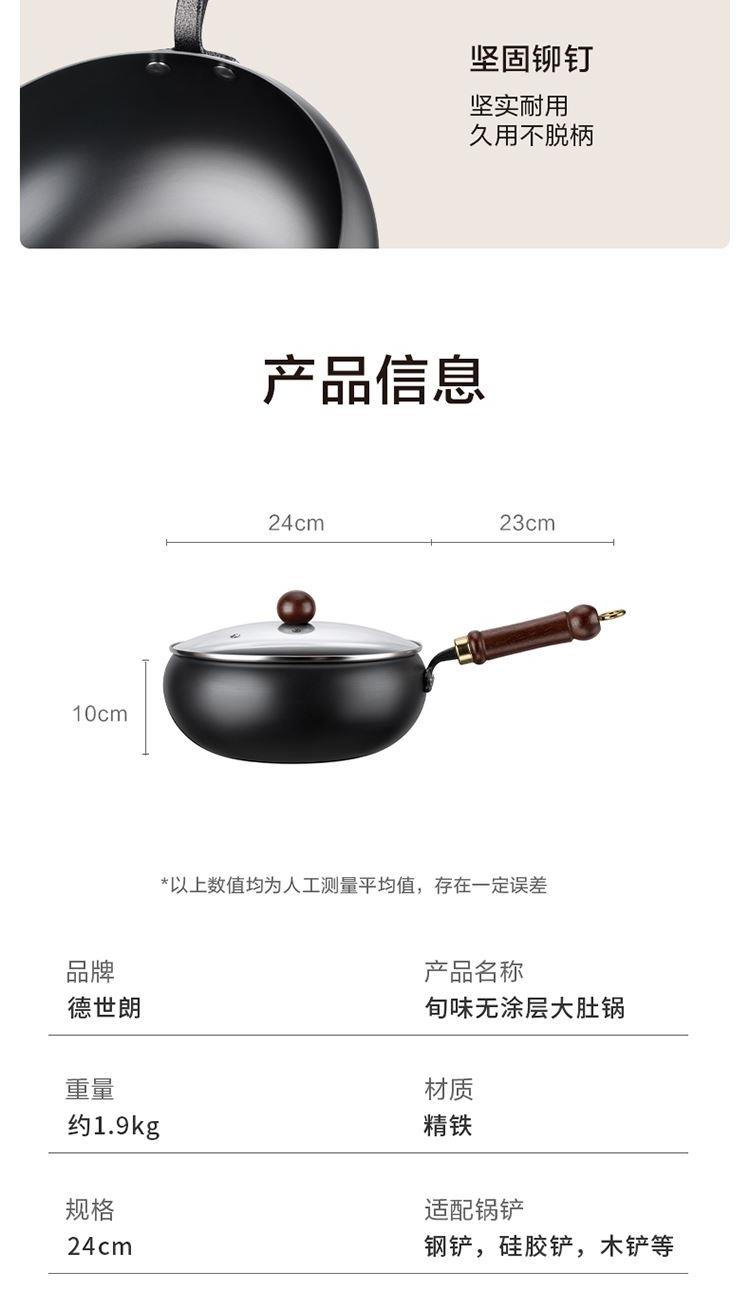 产品配置:24cm 产品材质:精铁 包装方式:彩盒+邮购盒 1、精铁材质制造,传热更快,受热均匀,节能环保;; 2、人性化高强度钢化玻璃盖,持久耐用,烹饪美味一目了然; 3、深层氮化工艺,无涂层,健康安全,可放心使用,让您烹饪更轻松; 4、隔热防烫木质手柄,符合人体工程学,使用舒适自然; 5、金属铲子、钢丝球都可使用,安全简便,美观大方。