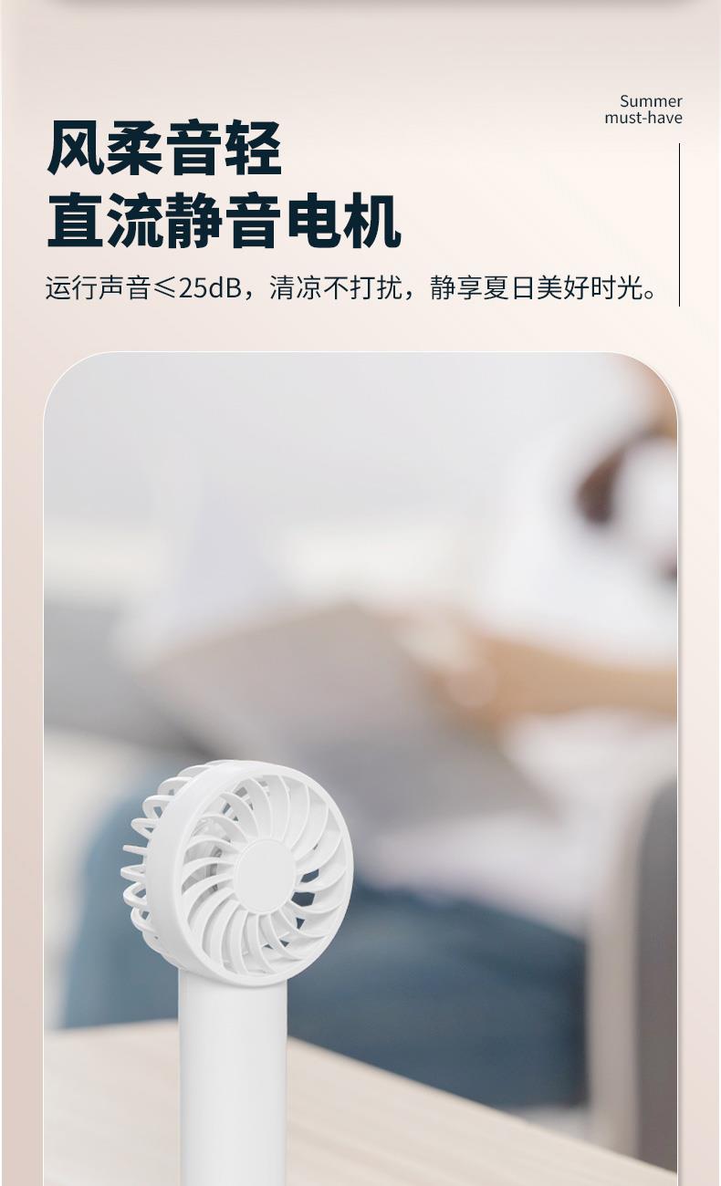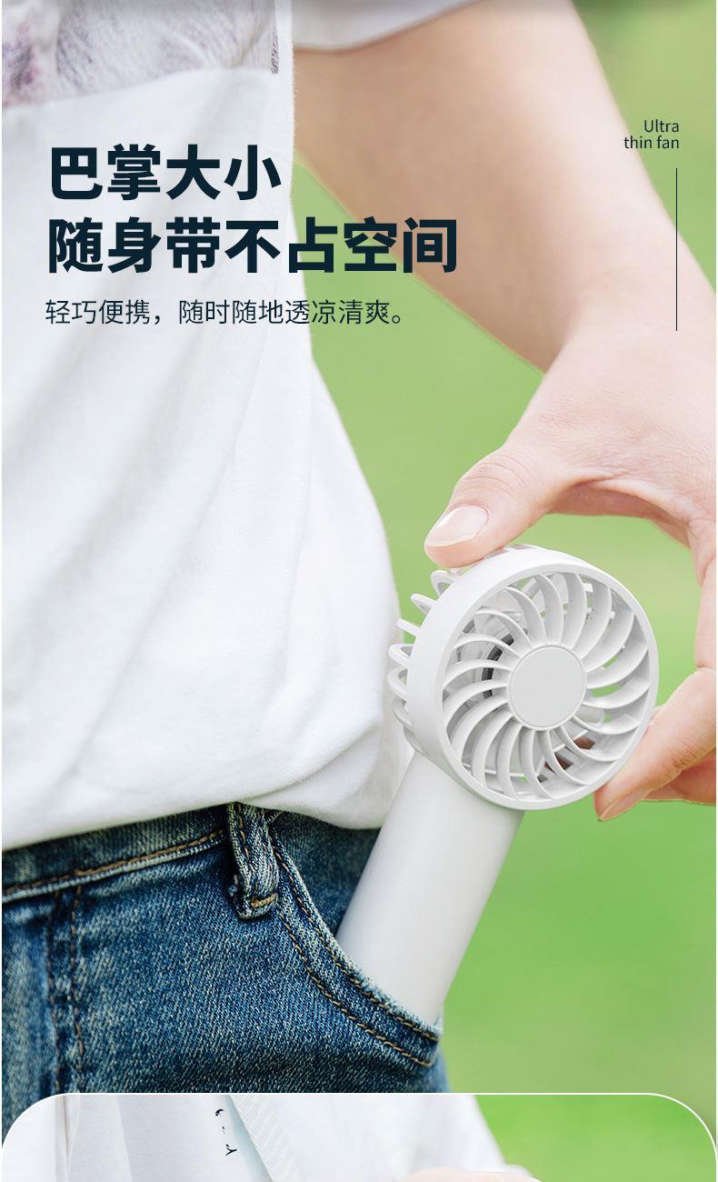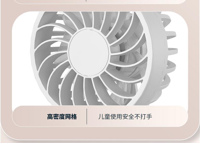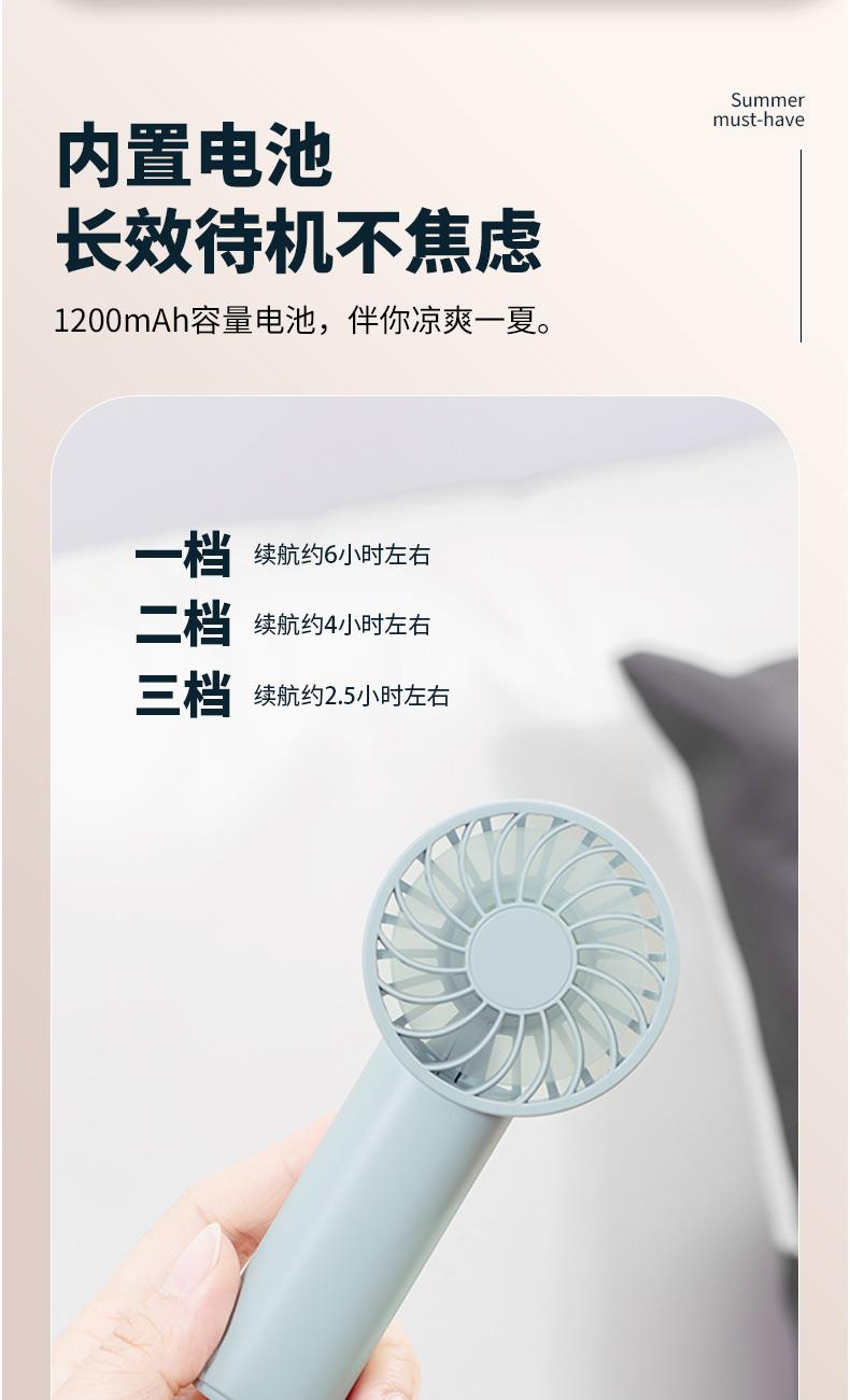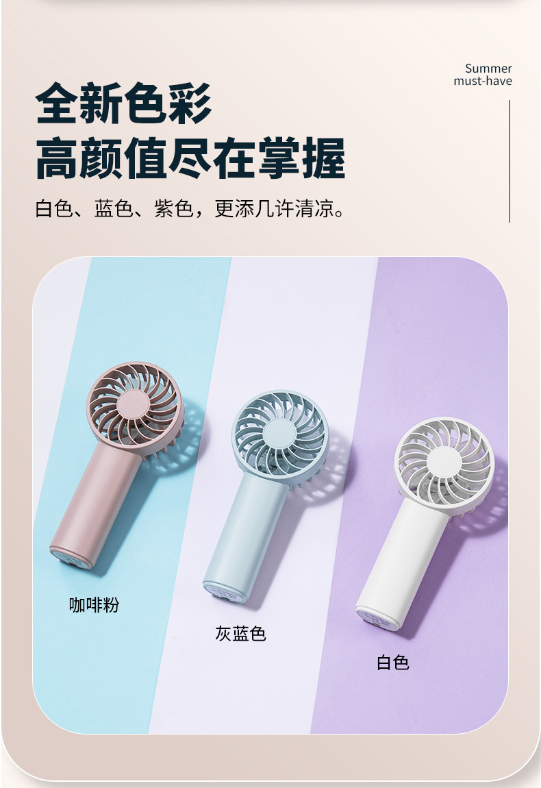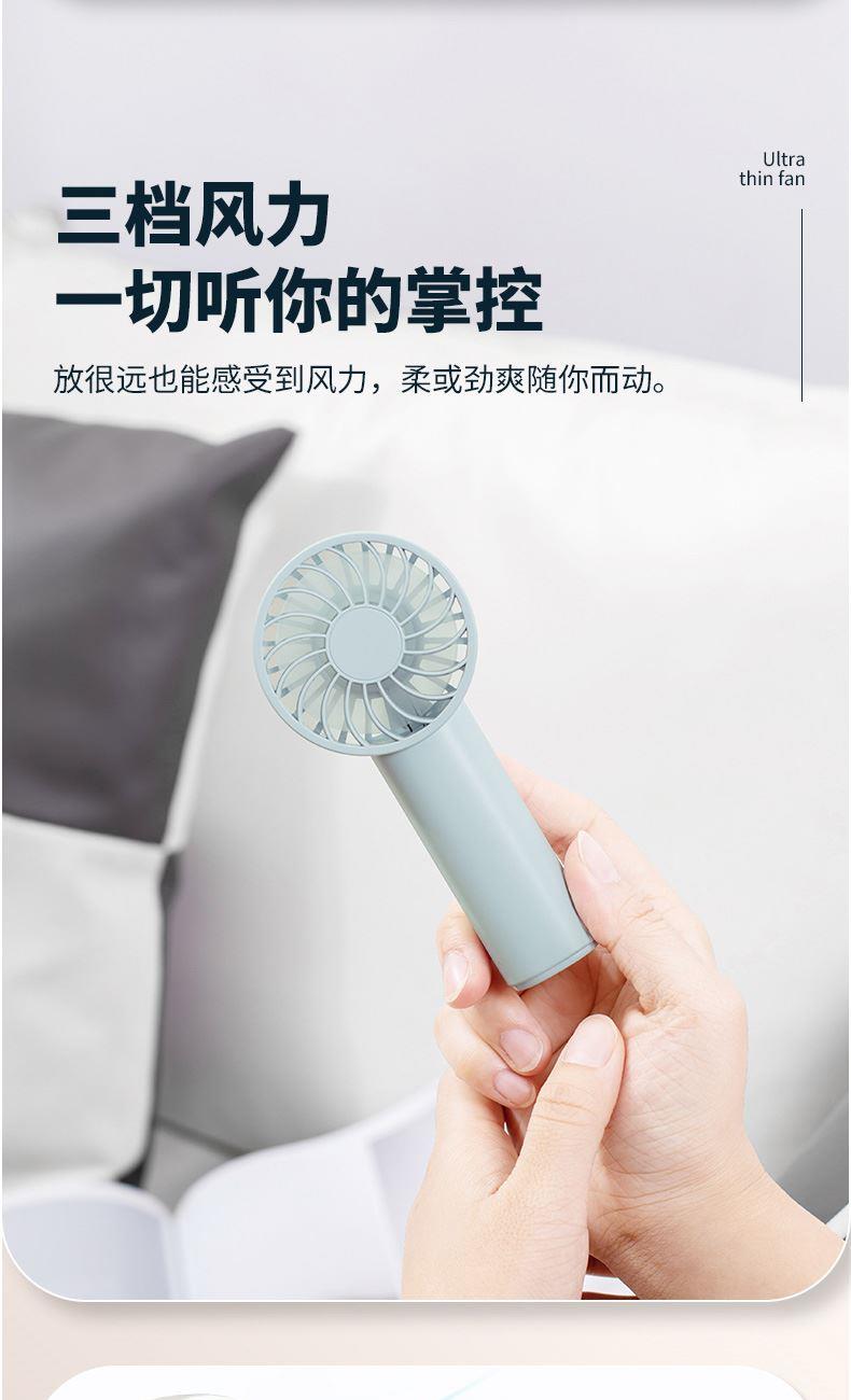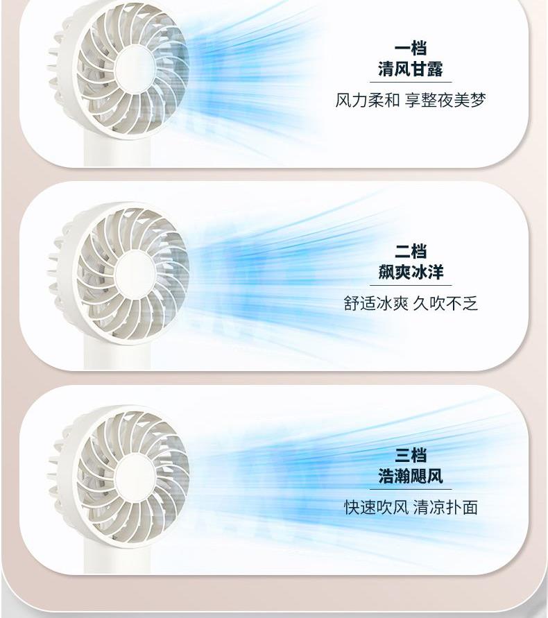 产品功能: *小巧便携、三档风力 *1200mAh、高颜值色彩 * 支持小批量定制LOGO 产品参数: *材质:ABS/PP/电子元件 *产品重量:89g/113g *产品尺寸:60*37.5*132mm *包装盒尺寸:62*42*134mm *外箱尺寸:34×31.5×42CM *整箱重量:13.6KG/14.6KG *颜色:白色,咖啡粉,灰蓝色 *标配:风扇、充电线、说明书