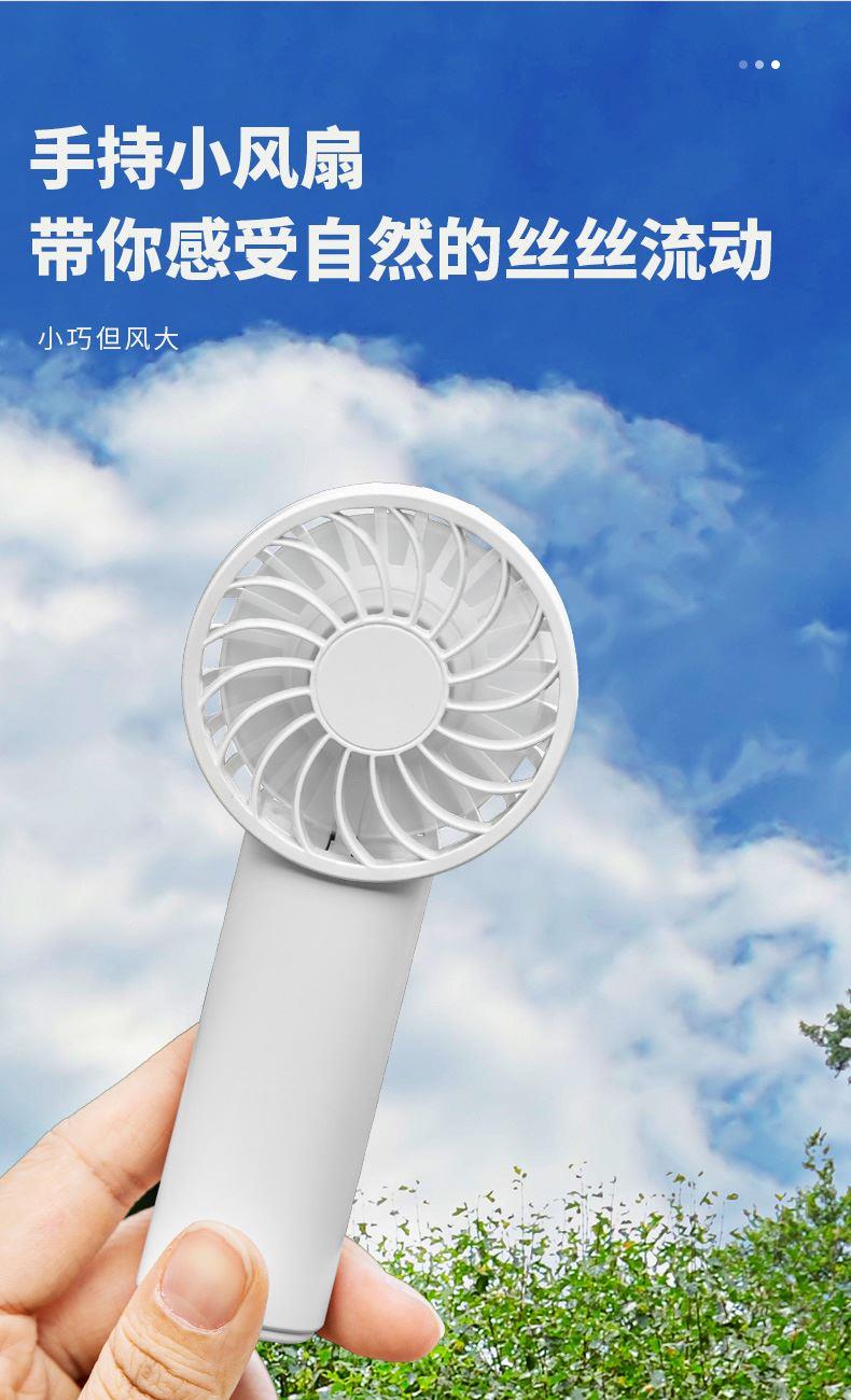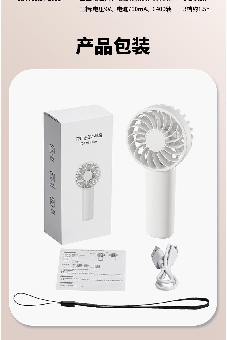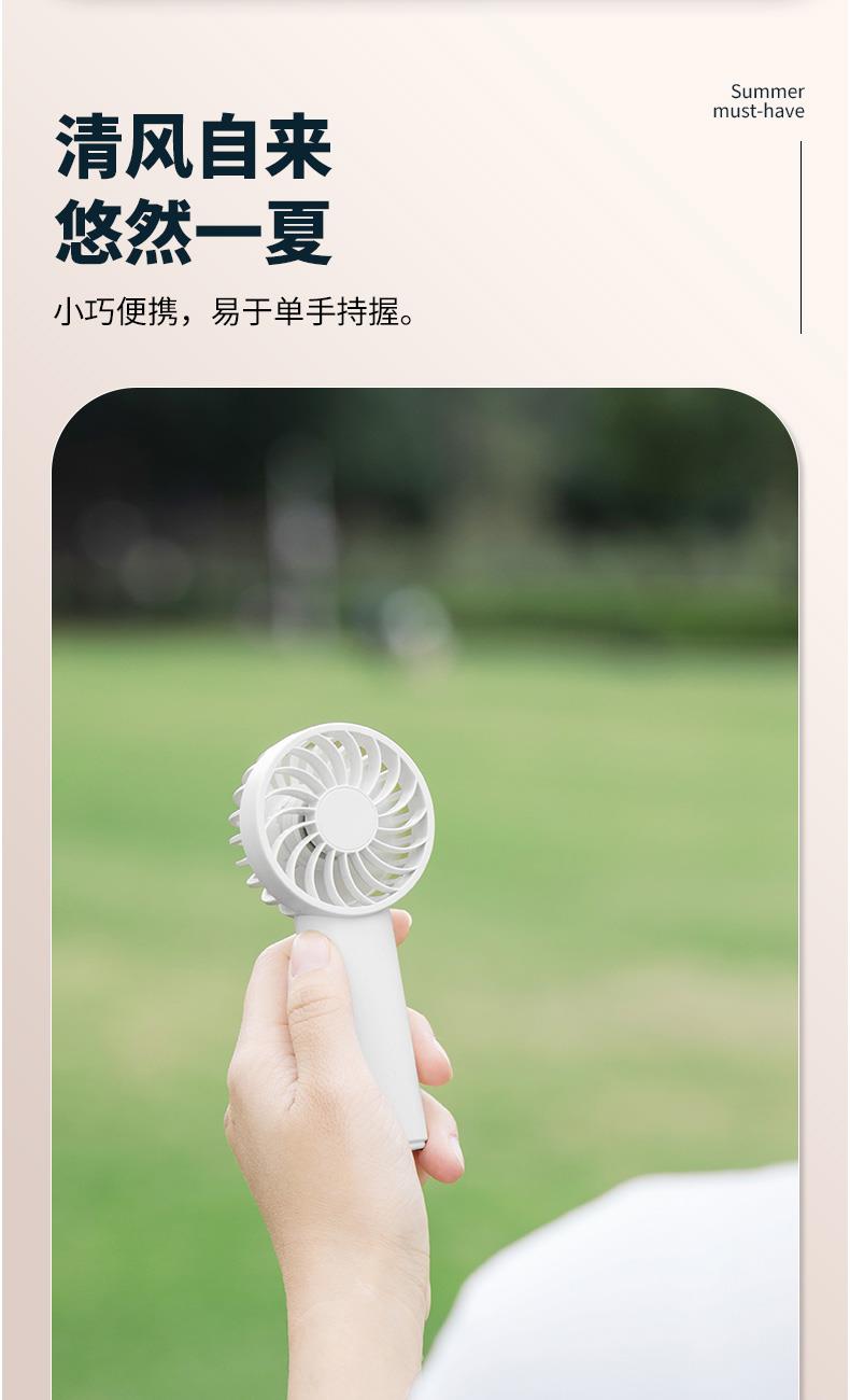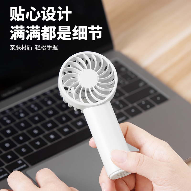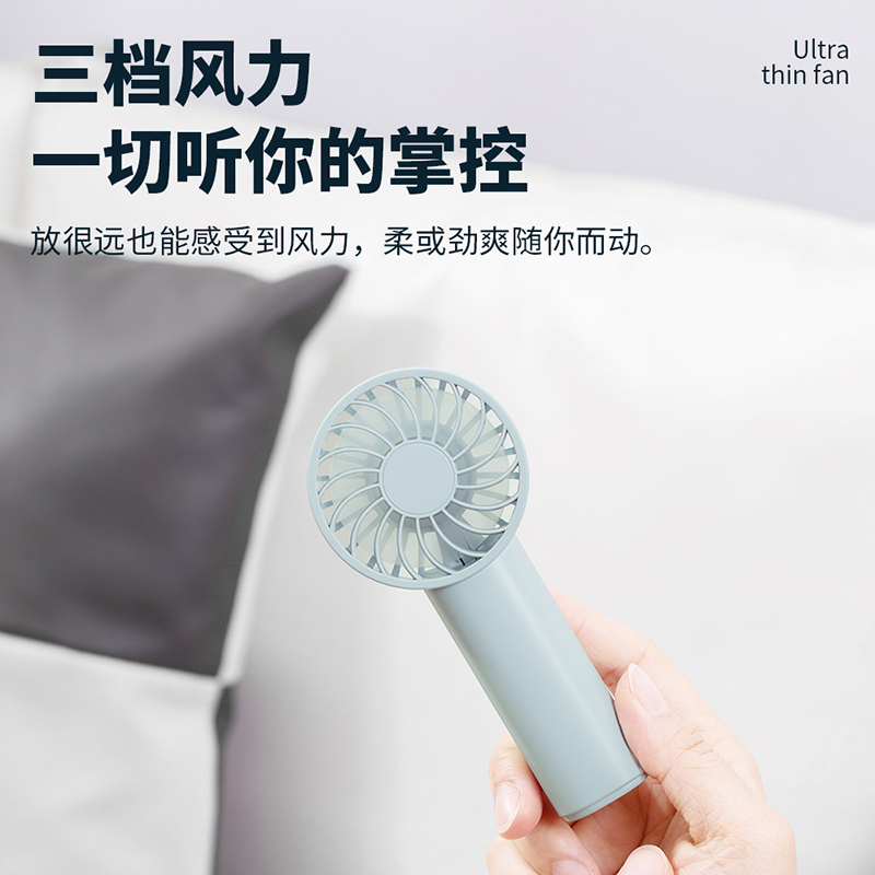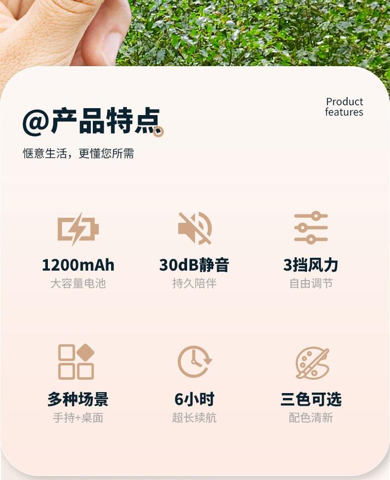 产品功能: *小巧便携、三档风力 *1200mAh、高颜值色彩 * 支持小批量定制LOGO 产品参数: *材质:ABS/PP/电子元件 *产品重量:89g/113g *产品尺寸:60*37.5*132mm *包装盒尺寸:62*42*134mm *外箱尺寸:34×31.5×42CM *整箱重量:13.6KG/14.6KG *颜色:白色,咖啡粉,灰蓝色 *标配:风扇、充电线、说明书