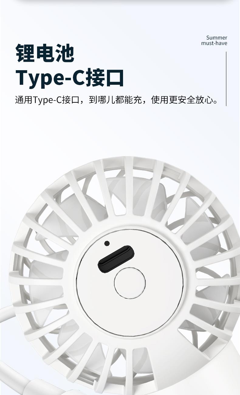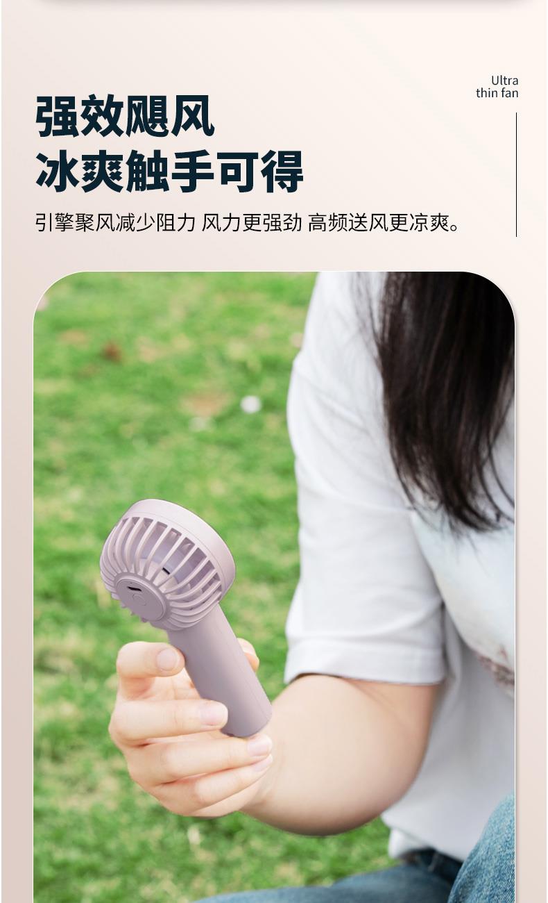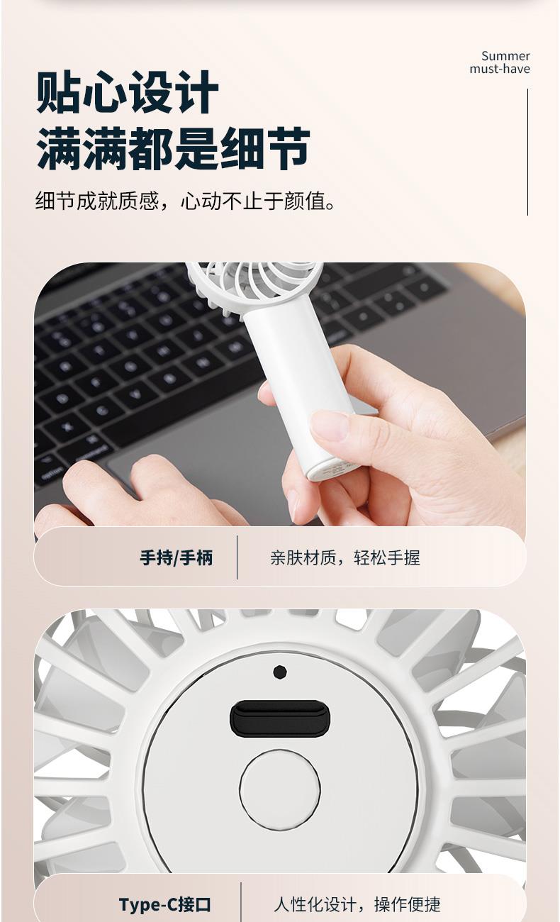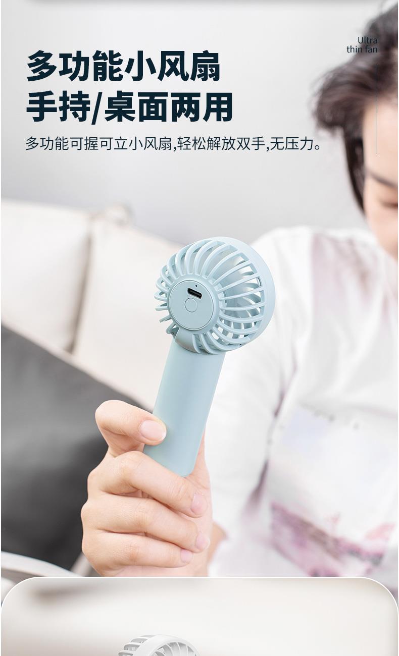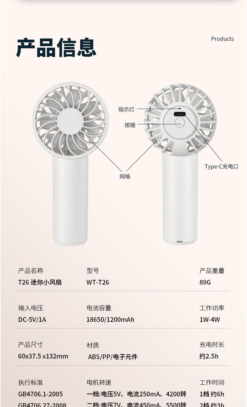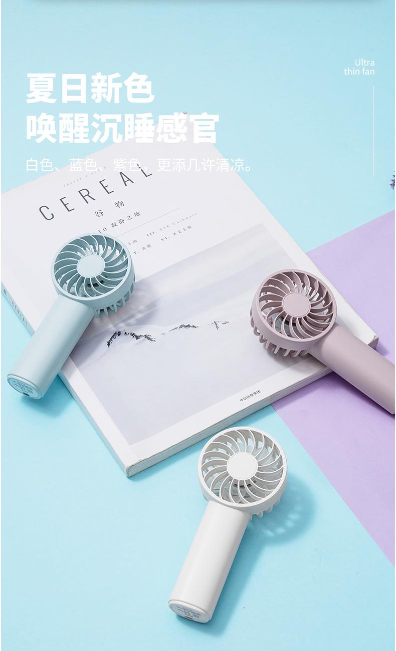 产品功能: *小巧便携、三档风力 *1200mAh、高颜值色彩 * 支持小批量定制LOGO 产品参数: *材质:ABS/PP/电子元件 *产品重量:89g/113g *产品尺寸:60*37.5*132mm *包装盒尺寸:62*42*134mm *外箱尺寸:34×31.5×42CM *整箱重量:13.6KG/14.6KG *颜色:白色,咖啡粉,灰蓝色 *标配:风扇、充电线、说明书