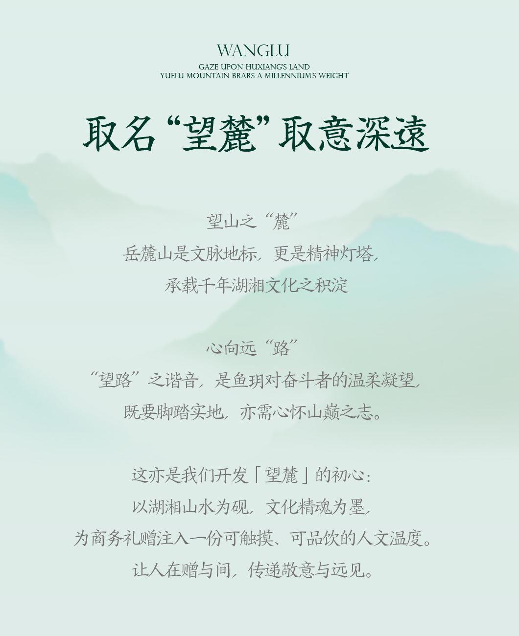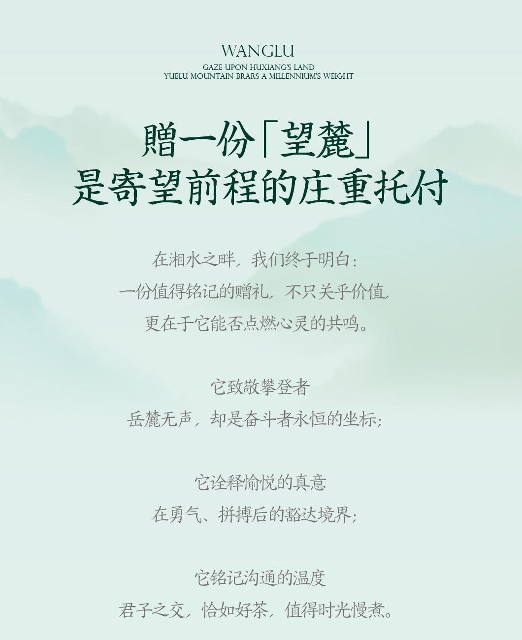 「望麓」以湖湘山水为砚,文化精魂为墨,为商务礼赠注入一份可触摸、可品饮的人文温度。让人在赠与间,传递敬意与远见。 内容清单 手筑茯茶 380gx1块 实木摆件湘绣x1 包装材质:精装礼盒 保质期:可长期保存 单盒外包装尺寸:380*270*75mm 单盒重量:约1700g 储存条件:避光、通风、阴凉干燥