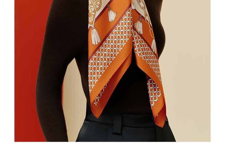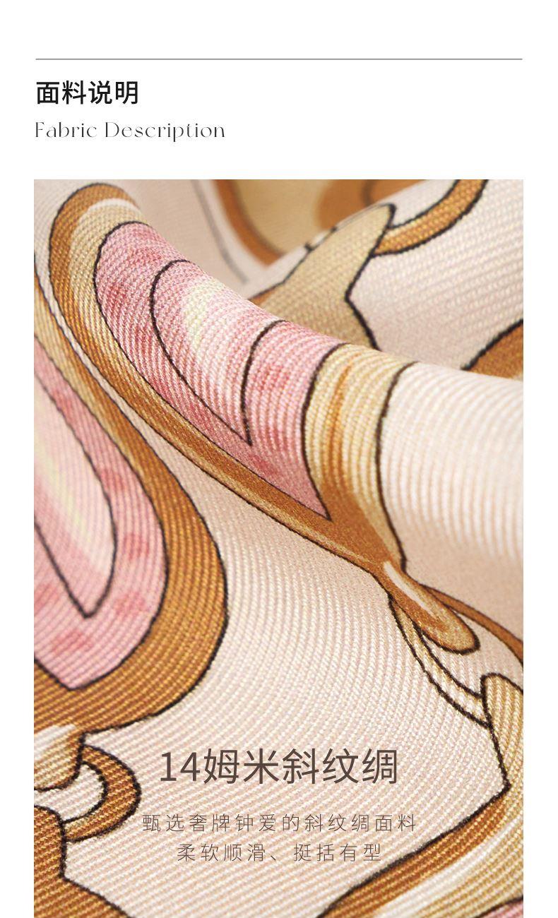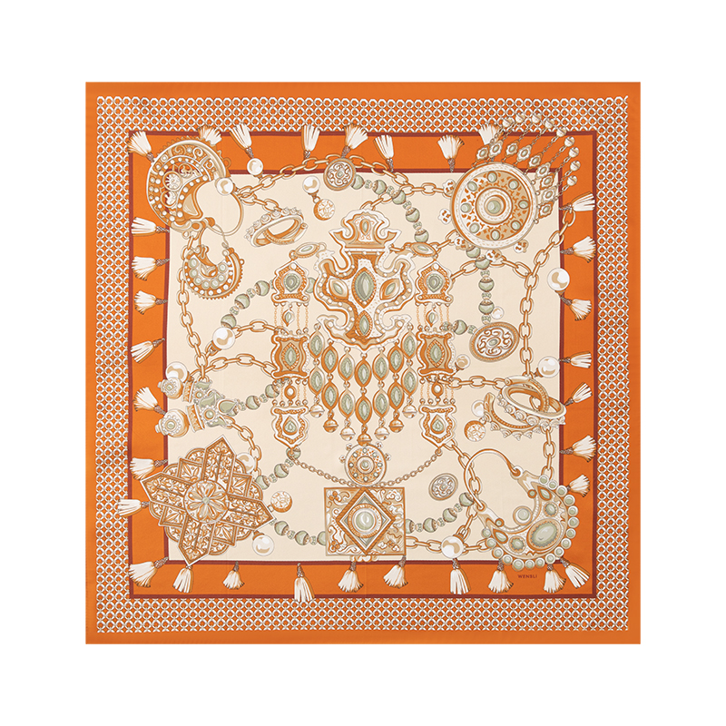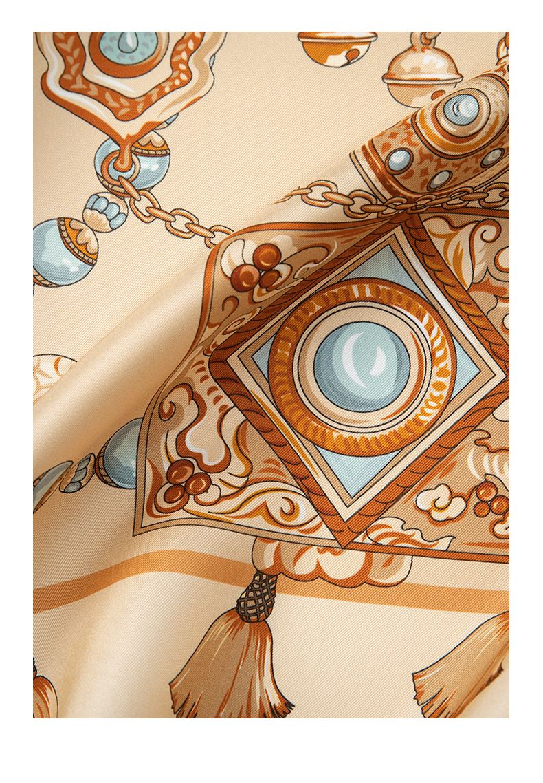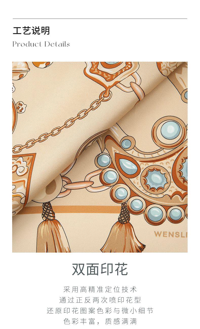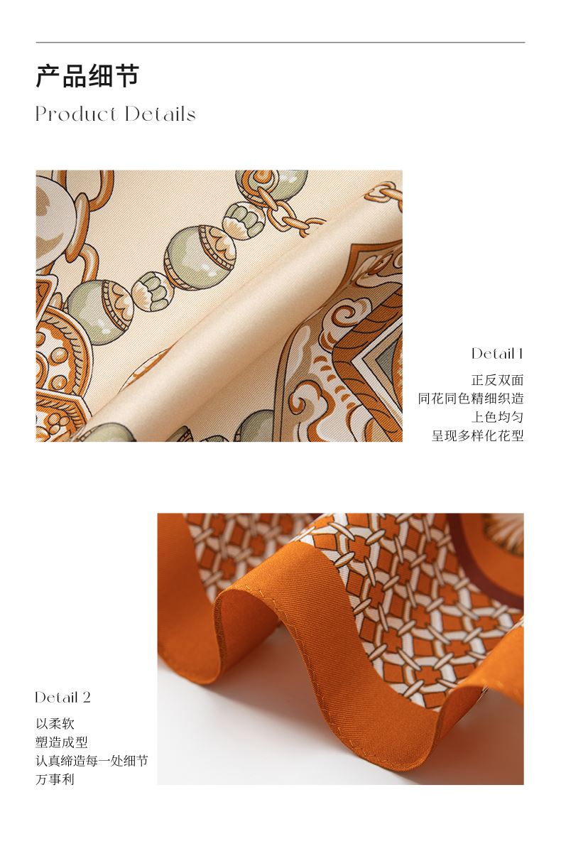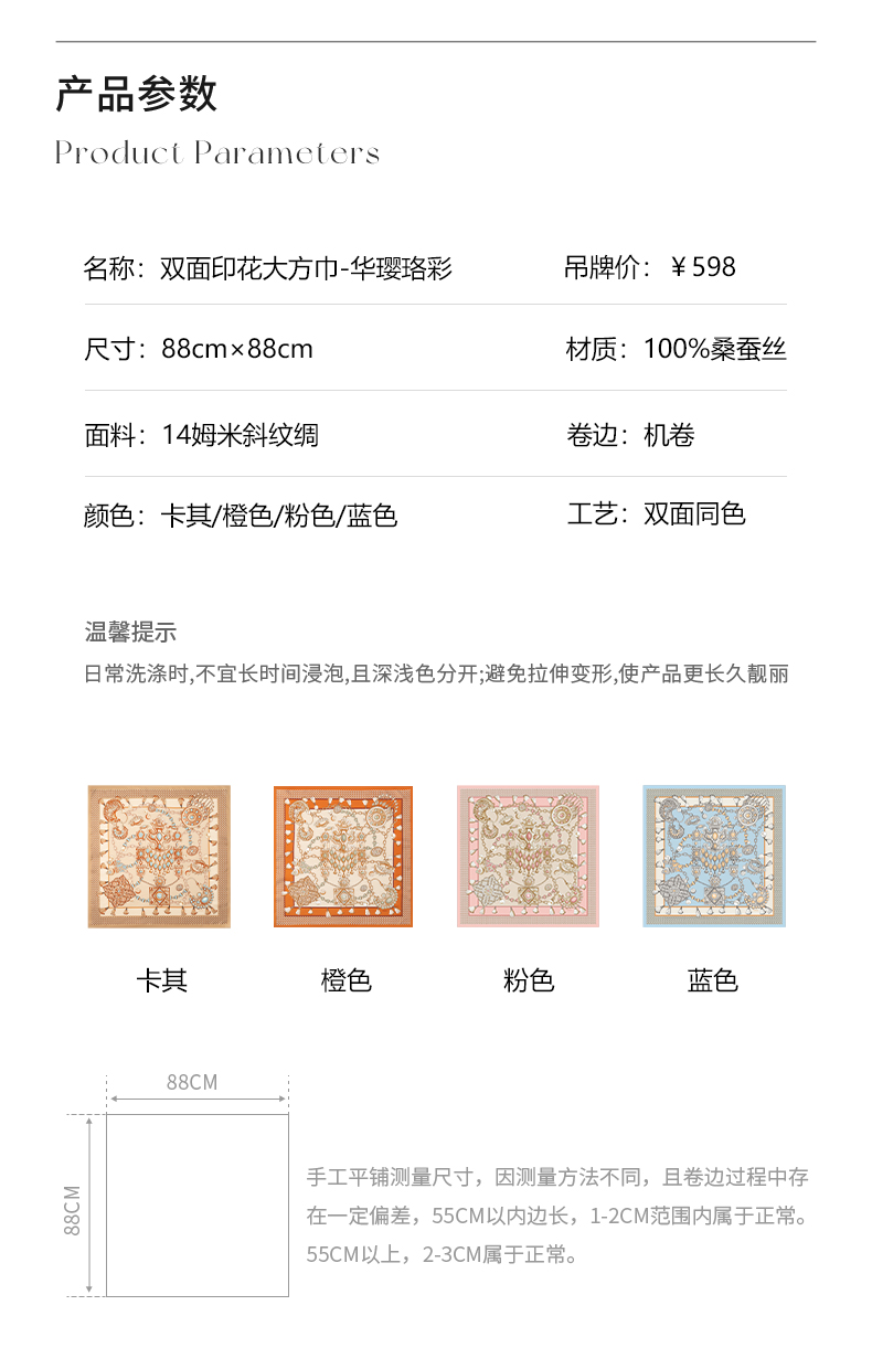 尺寸:88cm×88cm 材质:100桑蚕丝 面料:14姆米斜纹绸 卷边:机卷 颜色:卡其/橙色/粉色/蓝色 工艺:双面同色