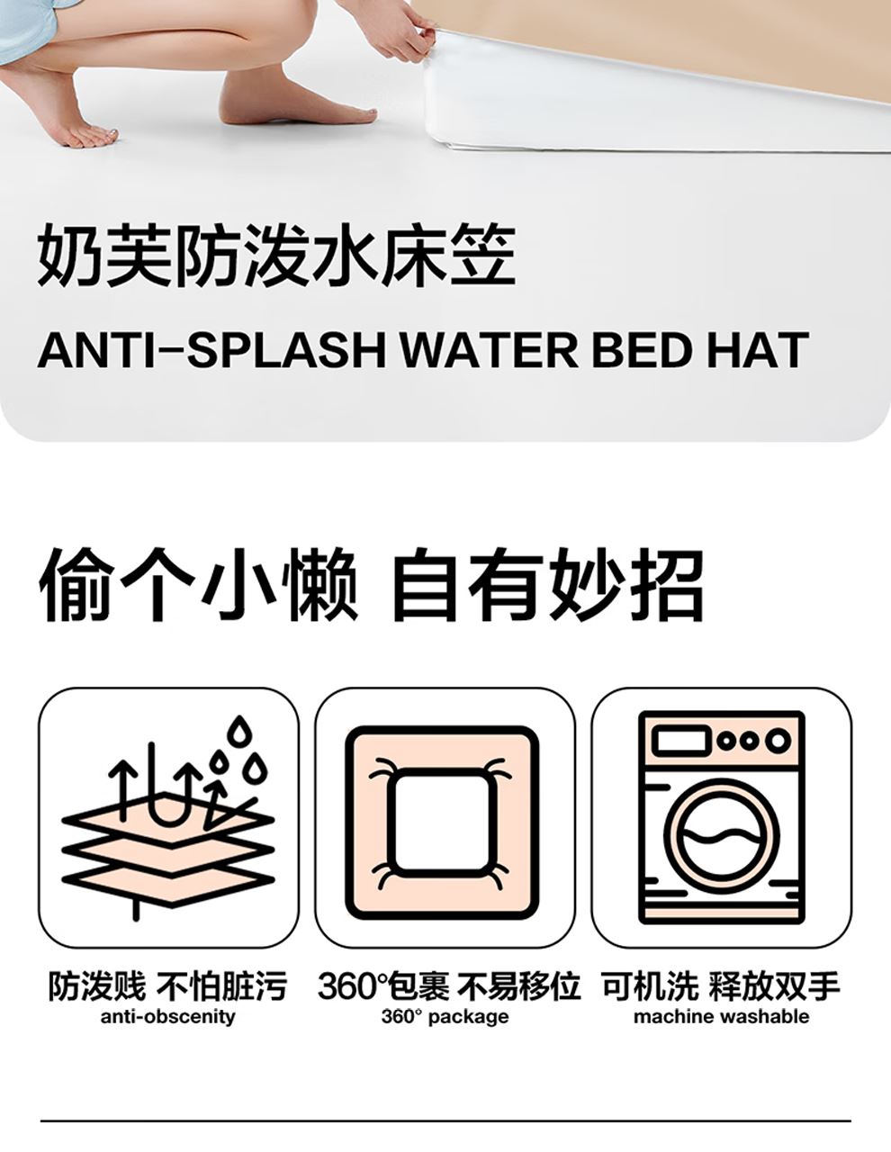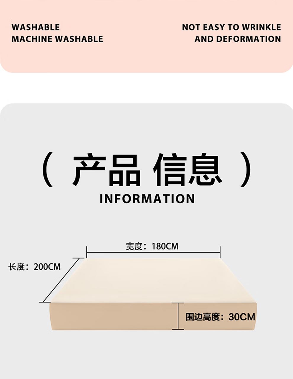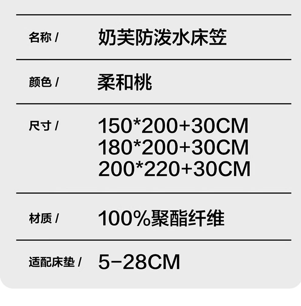 1、防水防溅:采用3M纳米拒水科技,纳米原料融入面料纤维形成立体保护网,有效阻隔水分渗透,守护床垫洁净 2、亲肤舒适:经磨毛工艺处理,织物表面形成短绒毛层,肤感温润软糯、柔软顺滑 3、稳固防护:采用360°床笠防护设计,可从各个方位包裹床垫,不易移位、滑落。 4、易于打理:支持机洗,洗后不易皱、不易变形,能轻松清理脏污。 颜色:奶芙色 尺寸:150*200*30CM 材质:聚酯纤维