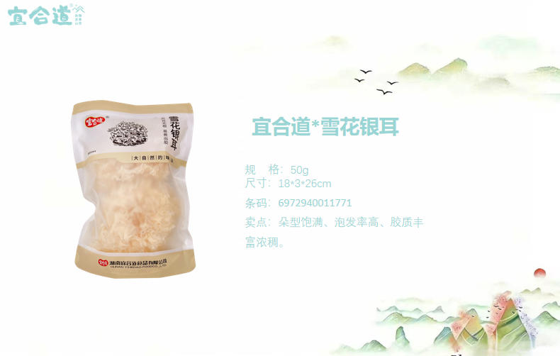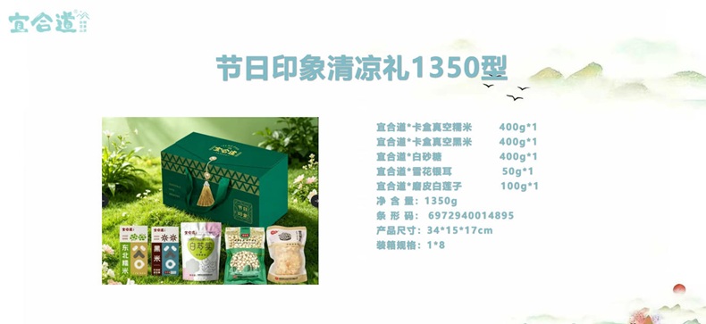 宜合道*卡盒真空糯米 400g*1 宜合道*卡盒真空黑米 400g*1 宜合道*白砂糖 400g*1 宜合道*雪花银耳 50g*1 宜合道*磨皮白莲子 100g*1 净 含 量:1350g 条 形 码: 6972940014895 产品尺寸:34*15*17cm