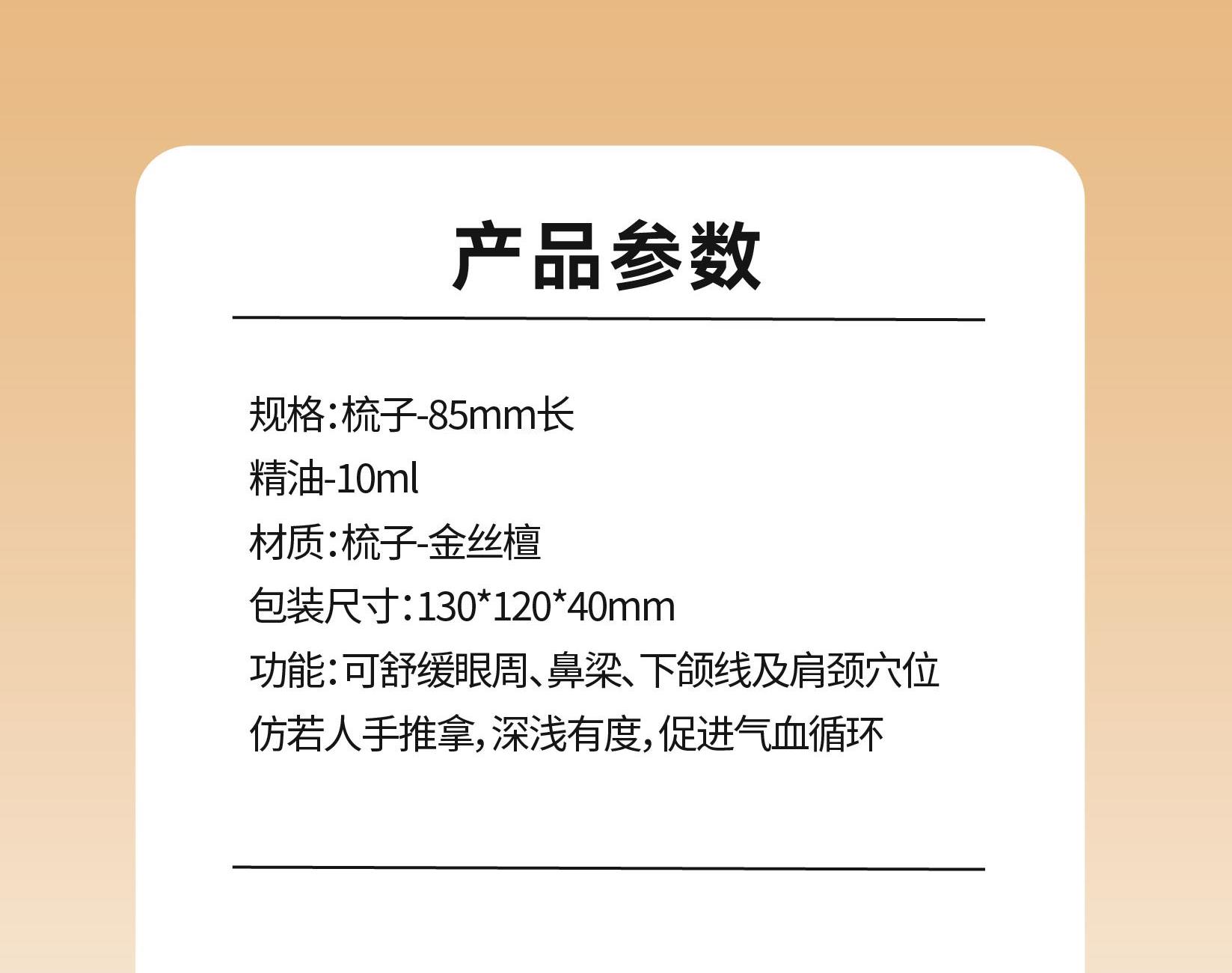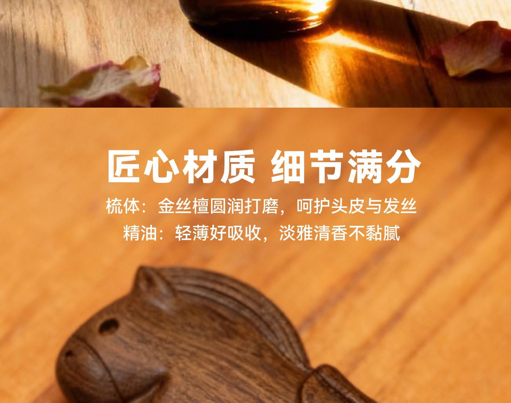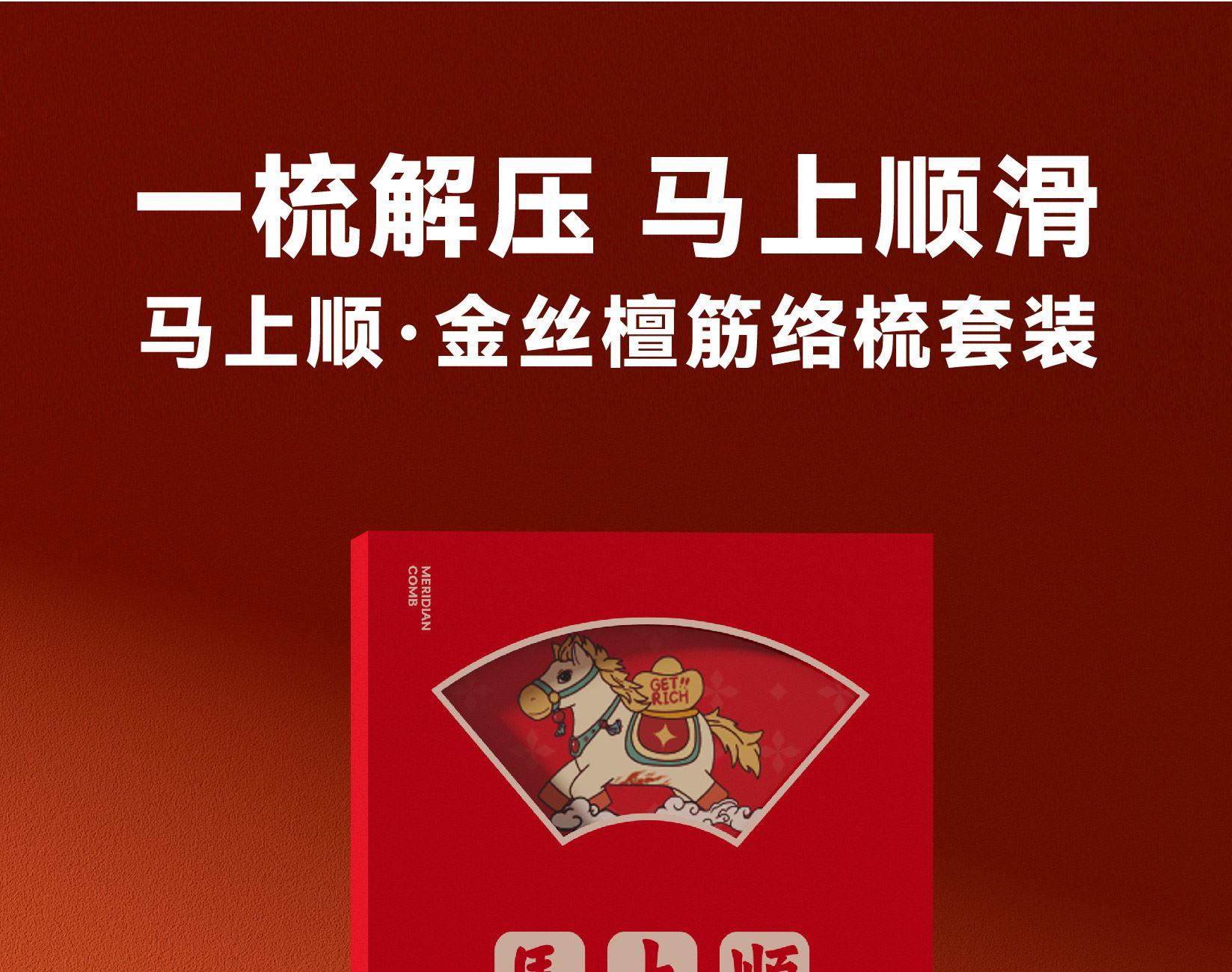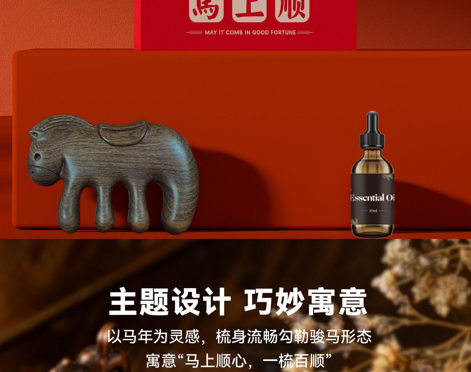 马年插画跃然盒上,骏马驮元宝,象征财富与顺遂并驰。 梳齿流淌精油,每一次梳理都是能量的流动, 卸下紧绷,唤醒肌肤与心灵的鲜活秩序。 现代设计解构传统吉兆,让每一天,从发丝到生活,皆如骏马踏云——即刻顺达,轻盈向前。 规格:梳子-85mm长 精油-10ml 材质:梳子-金丝檀 包装尺寸:130*120*40mm 功能:可舒缓眼周、鼻梁、下颌线及肩颈穴位 仿若人手推拿,深浅有度,促进气血循环