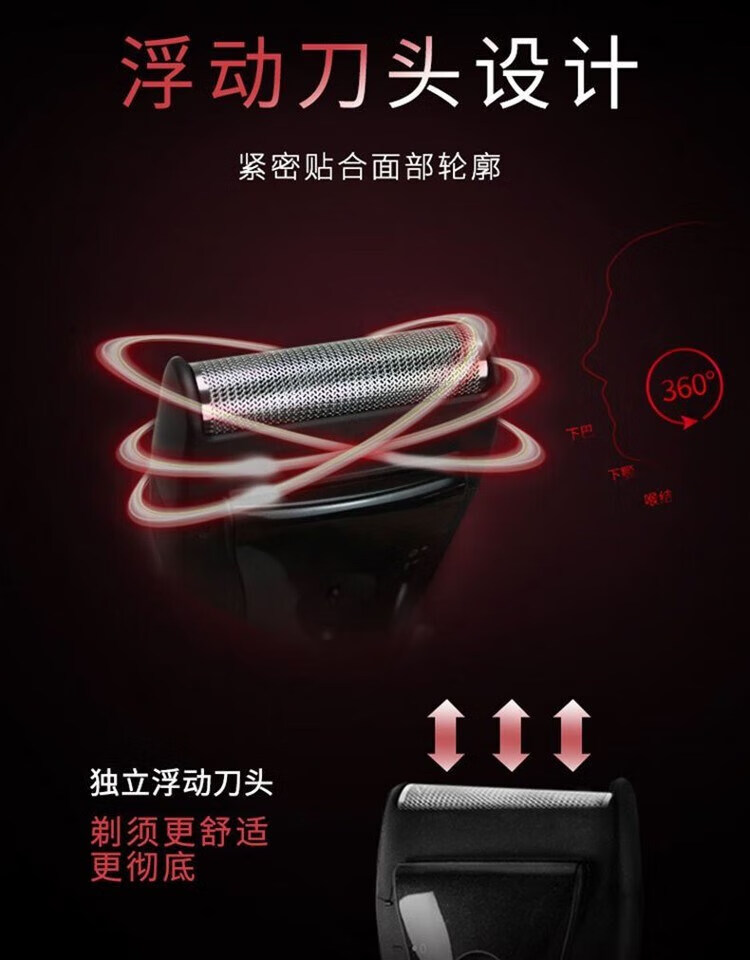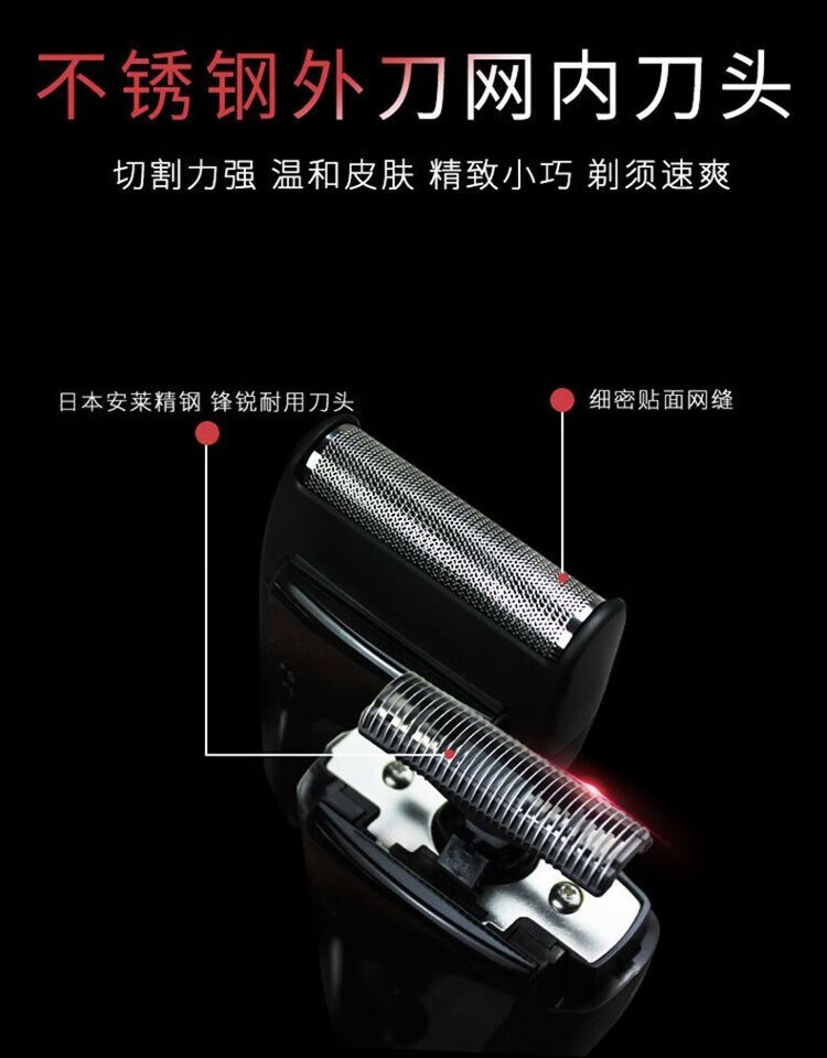 颜色:黑色 尺寸:120*65*35mm 包装清单:剃须刀*1、说明书*1 净重:500g 干电池式使用;小巧便携,外出旅行出差方便 日本“安莱”进口刀头,舒适贴合面部轮廓, 干湿两用,全身水洗;刀网拆载按钮,清洗方便