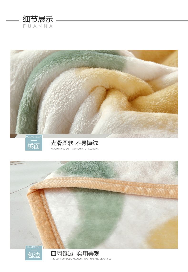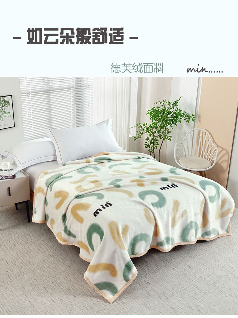 规格:180*200cm 面料:德芙绒 克重:1200g 执行标准:GB/T22796-2021 安全类别:GB18401-2010 B类 1.优选德芙绒面料,毛感细腻,亲肤舒适,速热保暖,透气吸湿,保暖性更好,快速升温。内置导电纱,防静电处理,使用更安心;简约设计,使得毯子更显档次,更显时尚。精致的包边工艺,做工精细,针脚细密,不易脱线,牢固耐用。