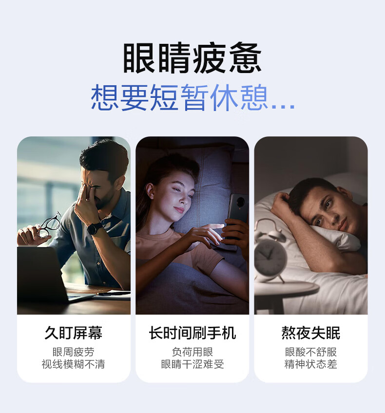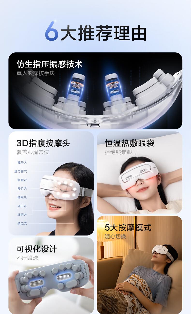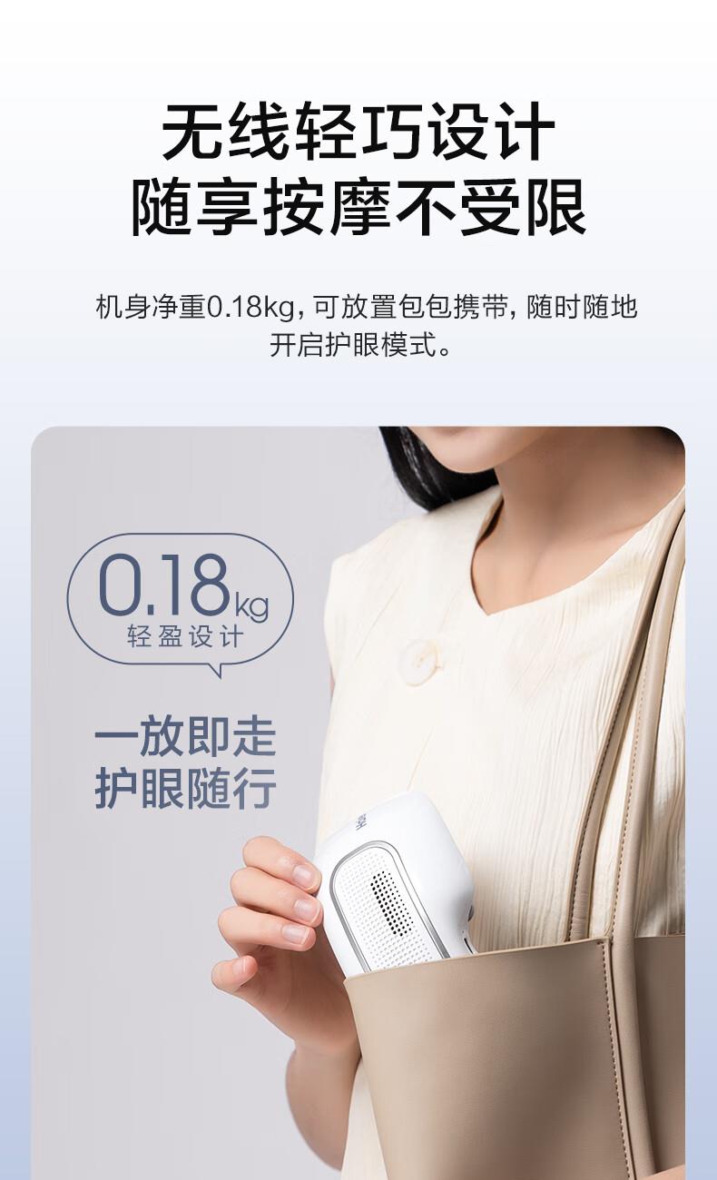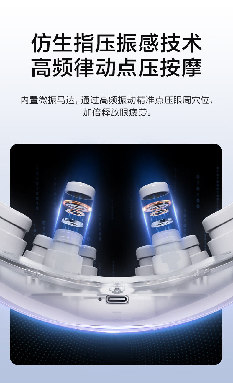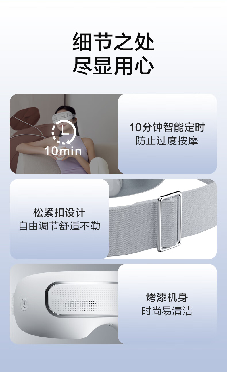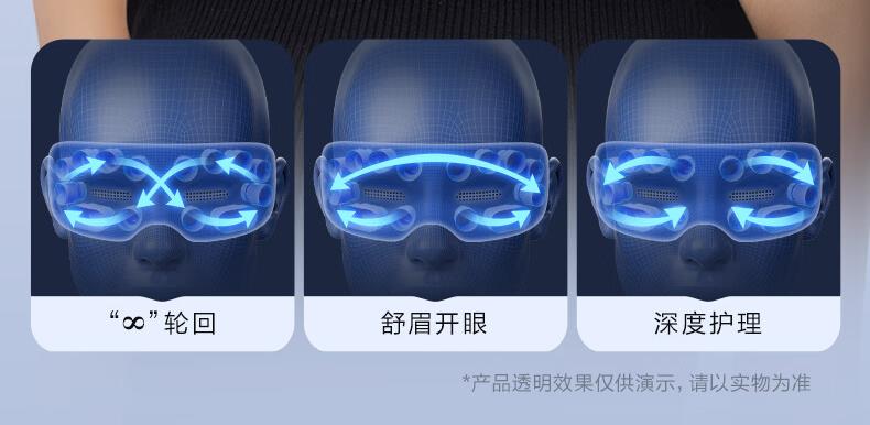 额定电压:5W 额定功率:10W 产品净重:0.18kg 默认工作时间:10分钟 包装清单:主机+插电适配器+说明书(含保修卡) 1.仿生指压振感技术真人般操按手法。 2.大面积热敷眼袋,拒绝熊猫眼。 3.3D指腹按摩头覆盖眼周穴位。 4.5大按摩模式随心切换。 5.可视化设计不压眼球