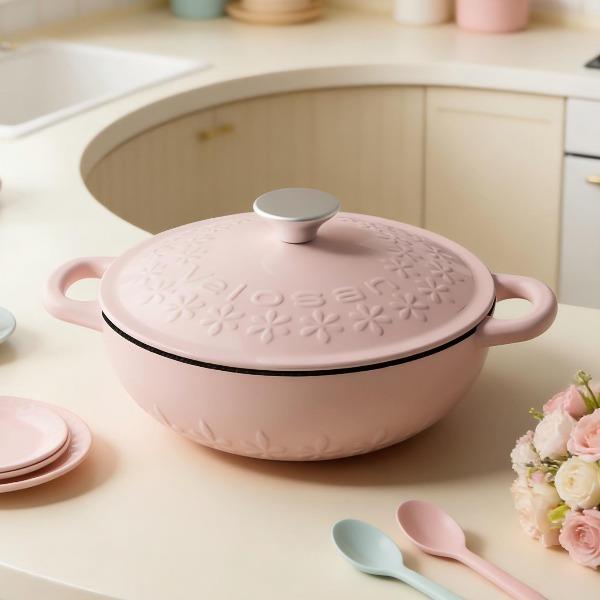 【型号】A-VE022 【SKU】VE022-FL01粉 【材质】铸铁 【锅口直径】22cm 【净重/毛重】3.1kg/3.7kg 【颜色】粉色 【包装方式】邮购盒 【外箱尺寸】28.3*27.5*14.5cm 1、锅盖&锅身太阳花立体浮雕 2、聚热保温,微压设计,持续焖烧,锁水留汁; 3、高导热铸铁材质,食材受热均匀,口感更佳; 4、明火电磁炉通用,好锅不挑灶; 5、锅身圆润无死角,防滑手柄易抓取; 6、焖煎炒煮焗,一锅搞定。