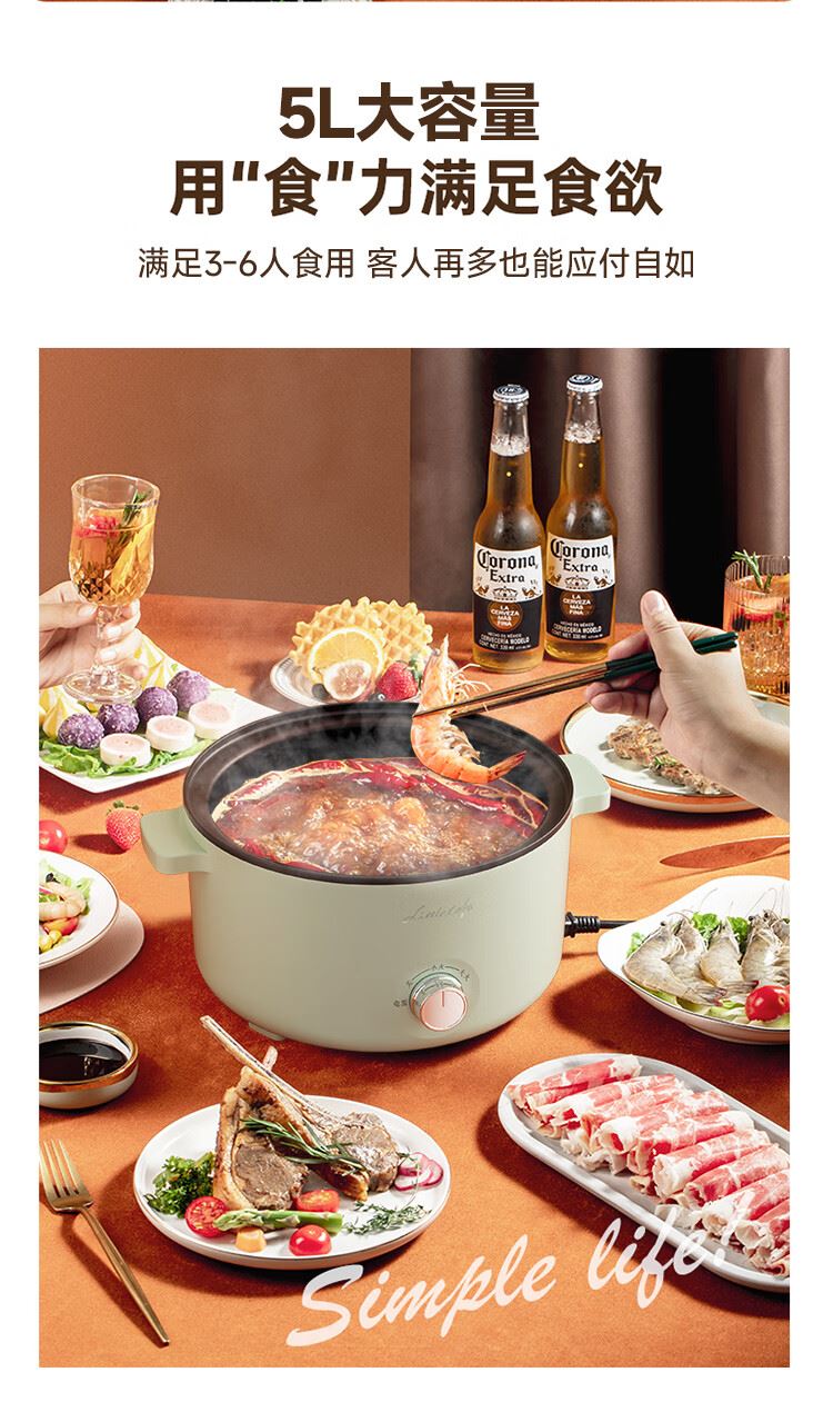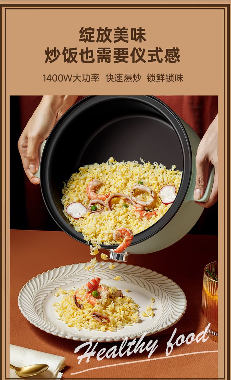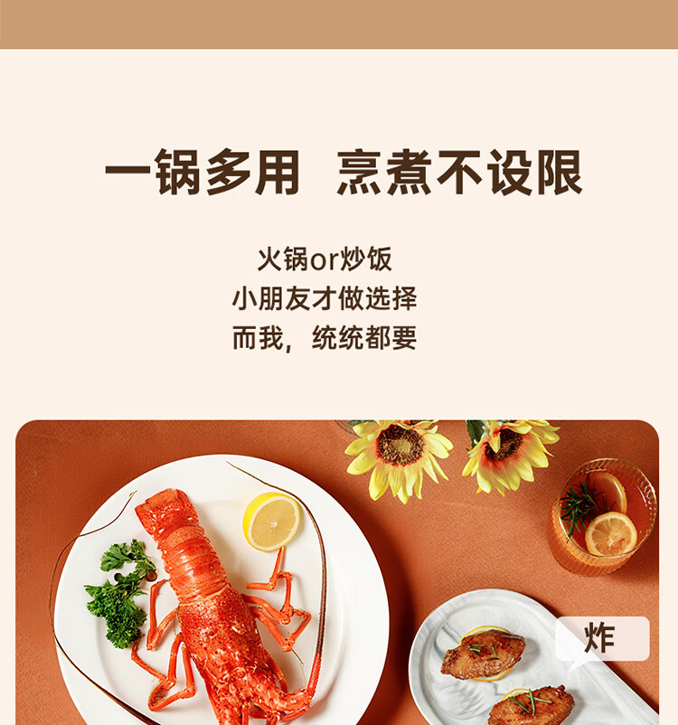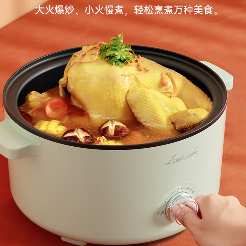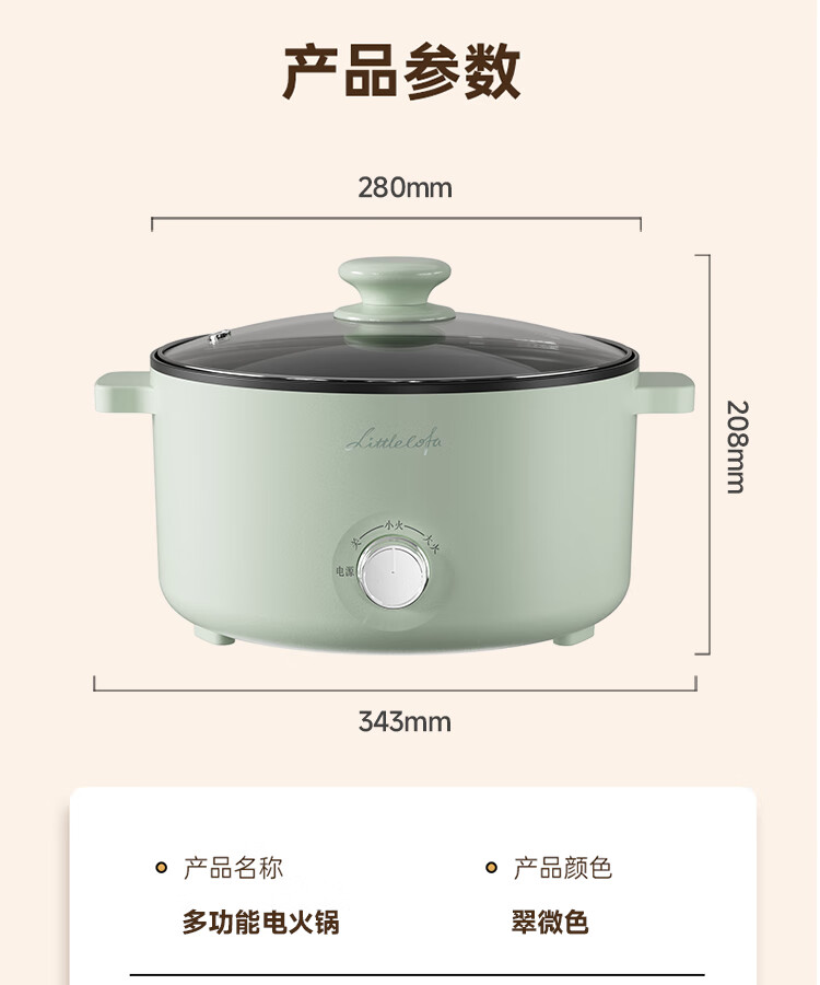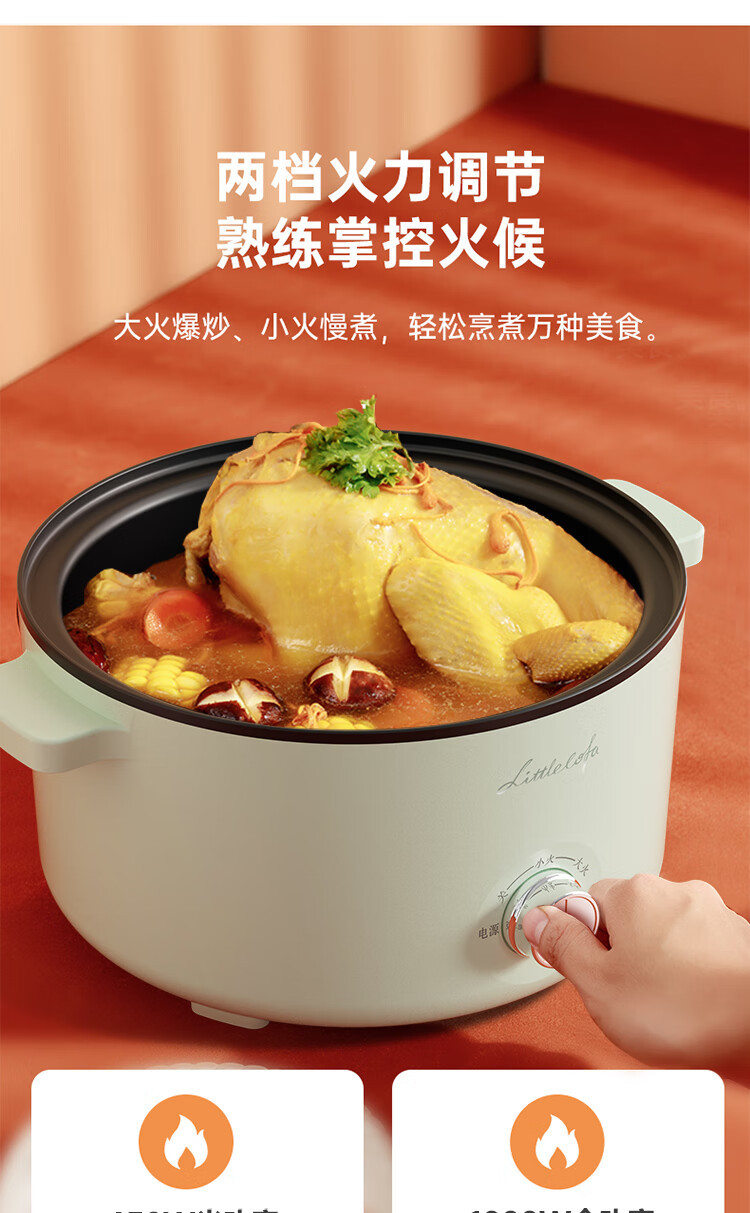 功率:1300w 容量:5L 档位:2档 款式:机械旋钮款 5L大容量,家庭聚会必备神器。 食品接触级耐磨不粘锅内涂层,不沾油,不易糊底好清洗。 操作简单方便,拆箱即上手,简约生活必备品。 隔热外壳+隔热提手,家人使用更安心。 防烫把手设计,便携不怕烫,贴心呵护烹饪的每个瞬间。 防干烧断电保护,安全可靠更贴心。 单旋钮控火不跳闸,学生宿舍,员工宿舍也可安心使用。