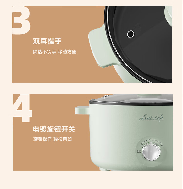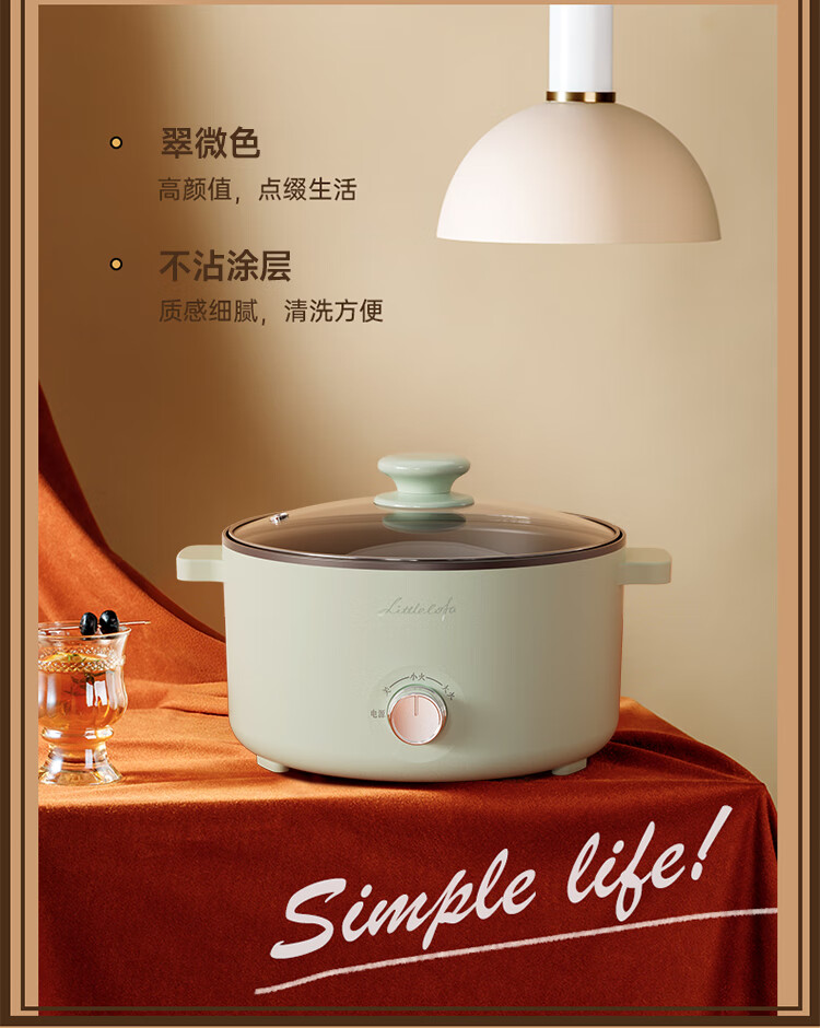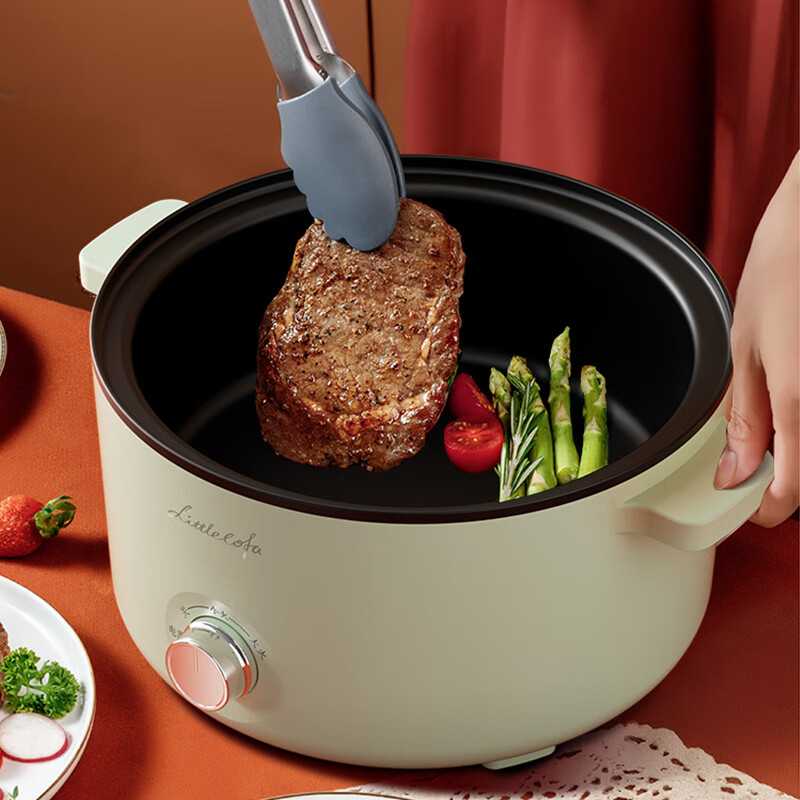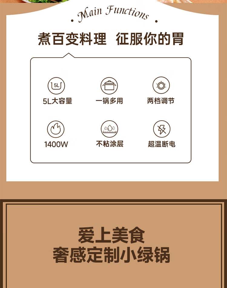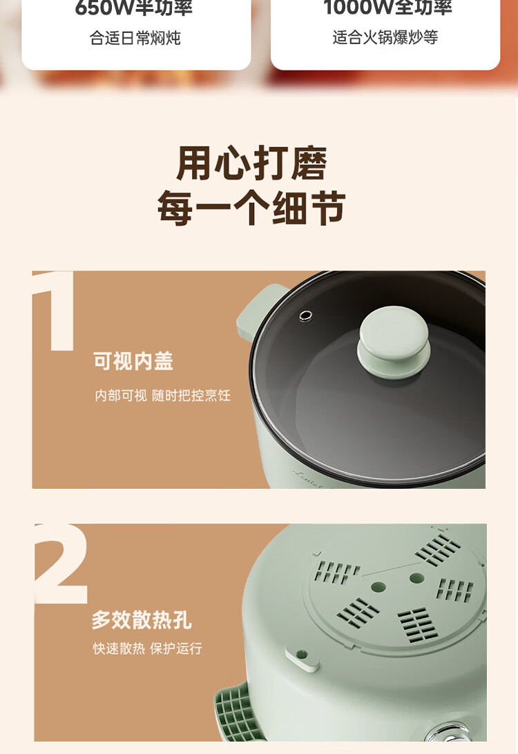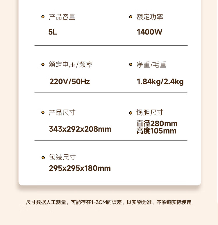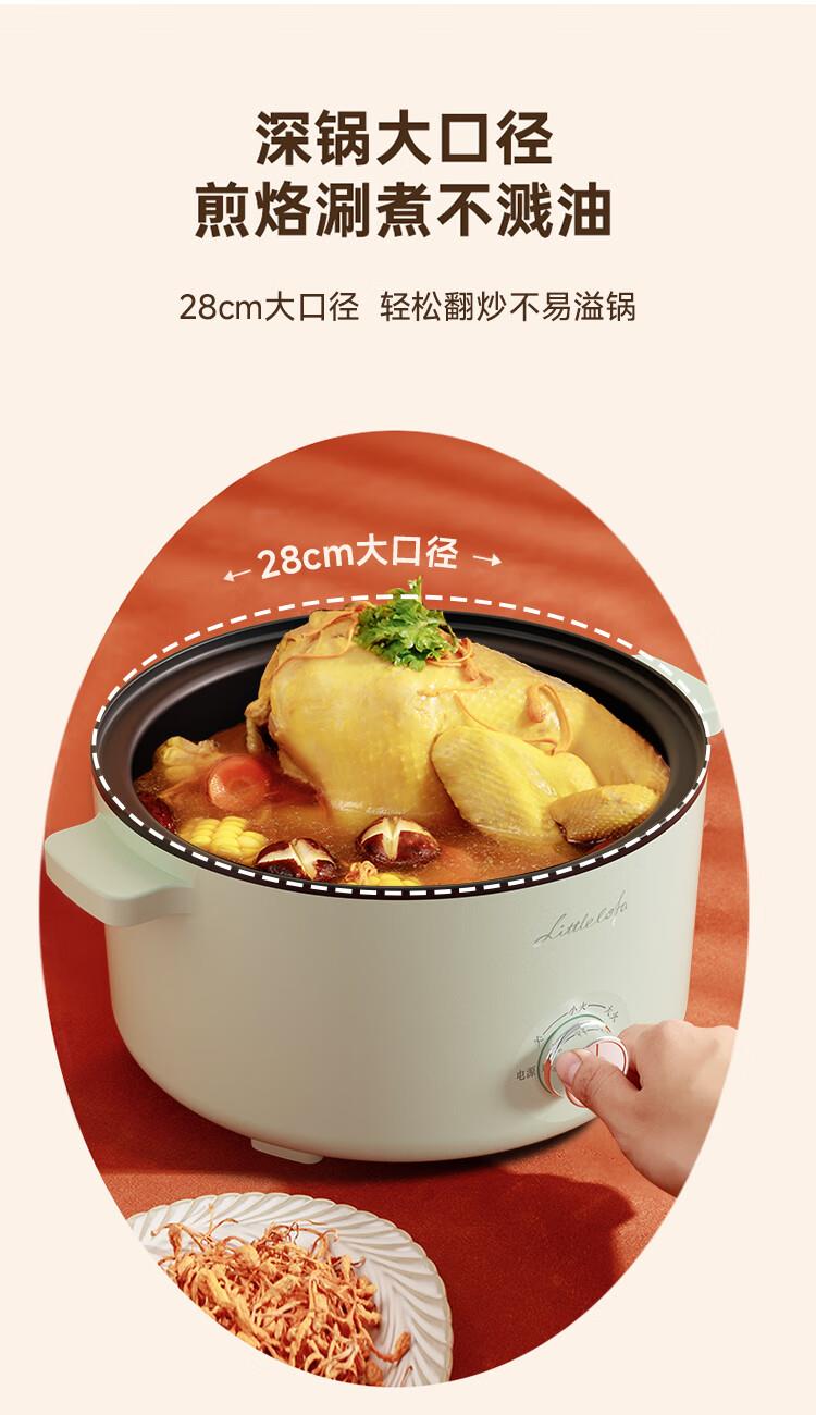 功率:1300w 容量:5L 档位:2档 款式:机械旋钮款 5L大容量,家庭聚会必备神器。 食品接触级耐磨不粘锅内涂层,不沾油,不易糊底好清洗。 操作简单方便,拆箱即上手,简约生活必备品。 隔热外壳+隔热提手,家人使用更安心。 防烫把手设计,便携不怕烫,贴心呵护烹饪的每个瞬间。 防干烧断电保护,安全可靠更贴心。 单旋钮控火不跳闸,学生宿舍,员工宿舍也可安心使用。