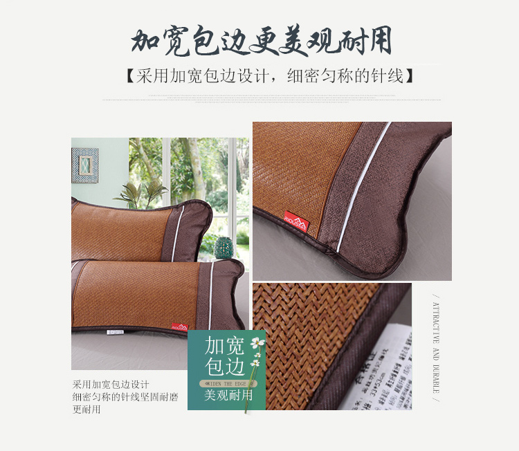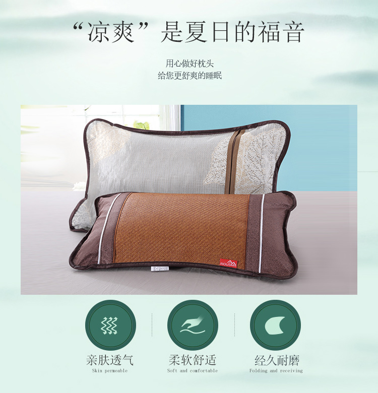 规 格:33*55cm 花 型:卡其色 面 料: 再生纤维素纤维 填充物:茉莉花+茶叶梗 双面不同材质,一面仿藤面料编织细密,不易勾丝,凉而不冰,舒适透气,一面冰丝,一个枕头两种享受,不夹头发,双面可用绿色环保,枕套和内芯可拆分,方便清洗枕套,内芯采用茶叶茉莉花填充清香入眠。