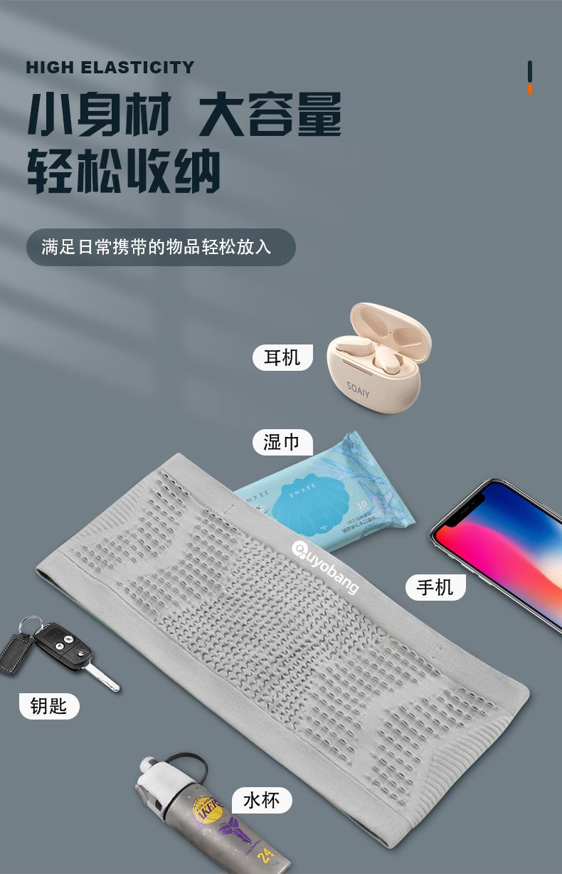 随行储物,跑步、健身可随身携带 360°环绕材质 92%锦纶+8%氨纶 颜色 浅灰色 尺寸 14*33cm,均码腰围(60-105cm较佳) 重量 75g 解放双手,便捷取用,环绕腰部的设计,四重开口,内外分区 透气舒适,久戴不闷,采用透气网布开孔设计,有效排汗散热 专为跑步、健身、徒步、骑行、旅行等场景设计,满足多种运动及日常轻便出行需求,拿取方便,保护物品