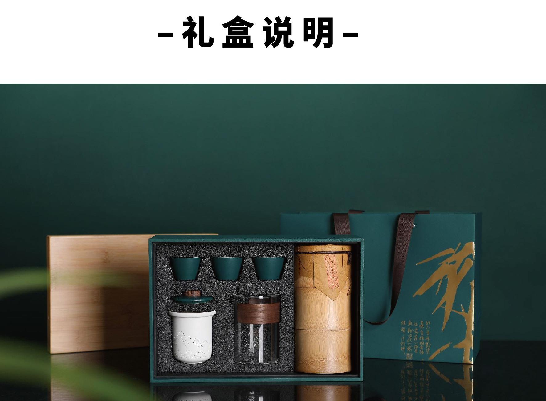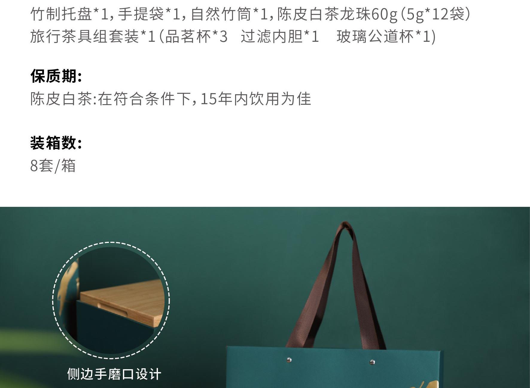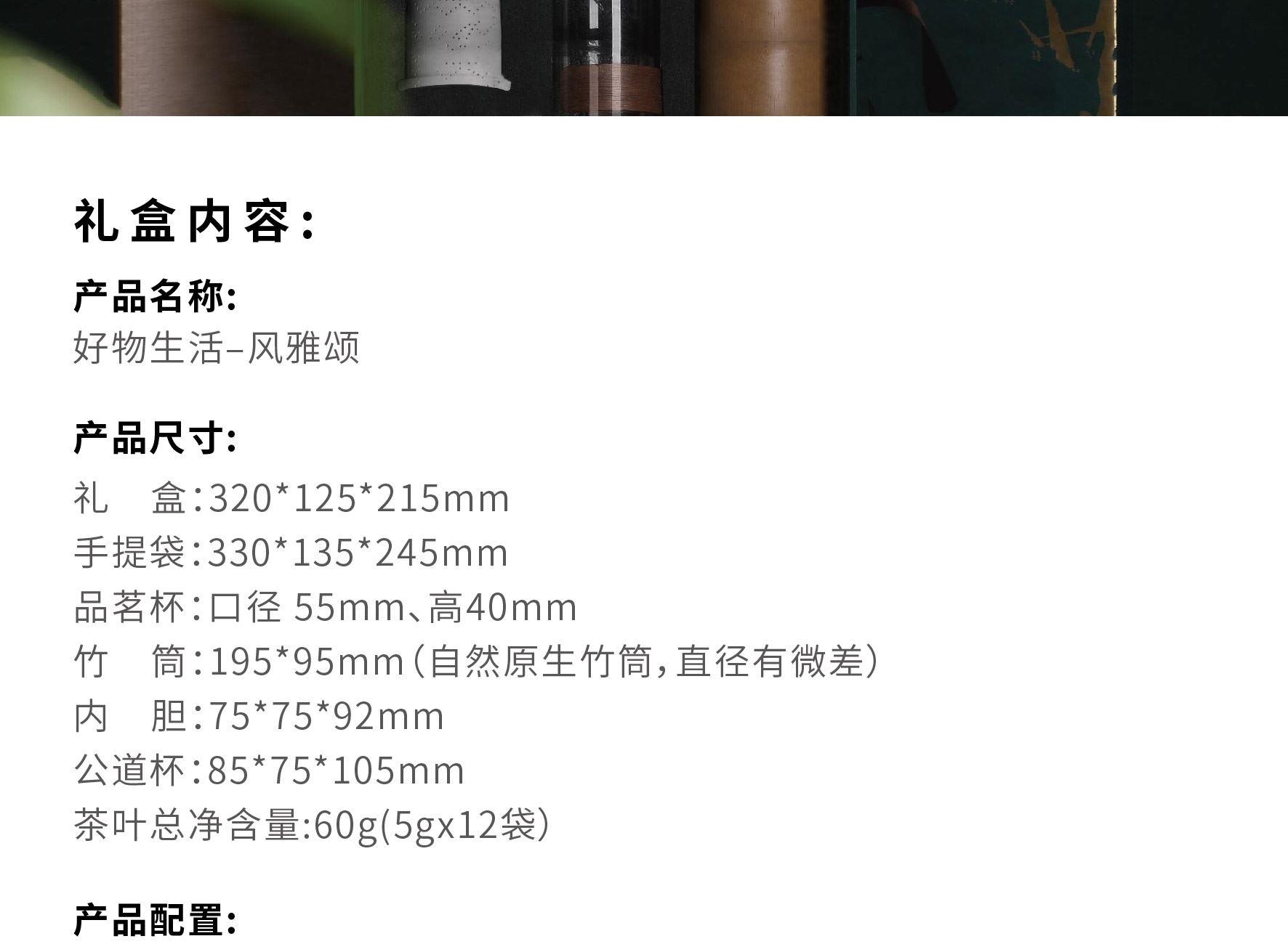 礼盒尺寸:320*125*215 mm 手提袋尺寸:330*135*245 mm 品茗杯尺寸:口径55 mm、高40 mm 竹筒尺寸:195*95 mm(自然原生竹筒,直径有微差) 内胆尺寸:75*75*92 mm 公道杯尺寸:85*75*105 mm 茶叶总净含量:60 g 产品配置:竹制托盘、手提袋、 旅行茶具组套装x 1(品茗杯x 3,过滤内胆x 1, 玻璃公道杯x 1) 自然竹筒(花器/收纳)x 1 陈皮白茶龙珠60 g( 5 g x 12袋) 产品材质:楠竹、陶瓷