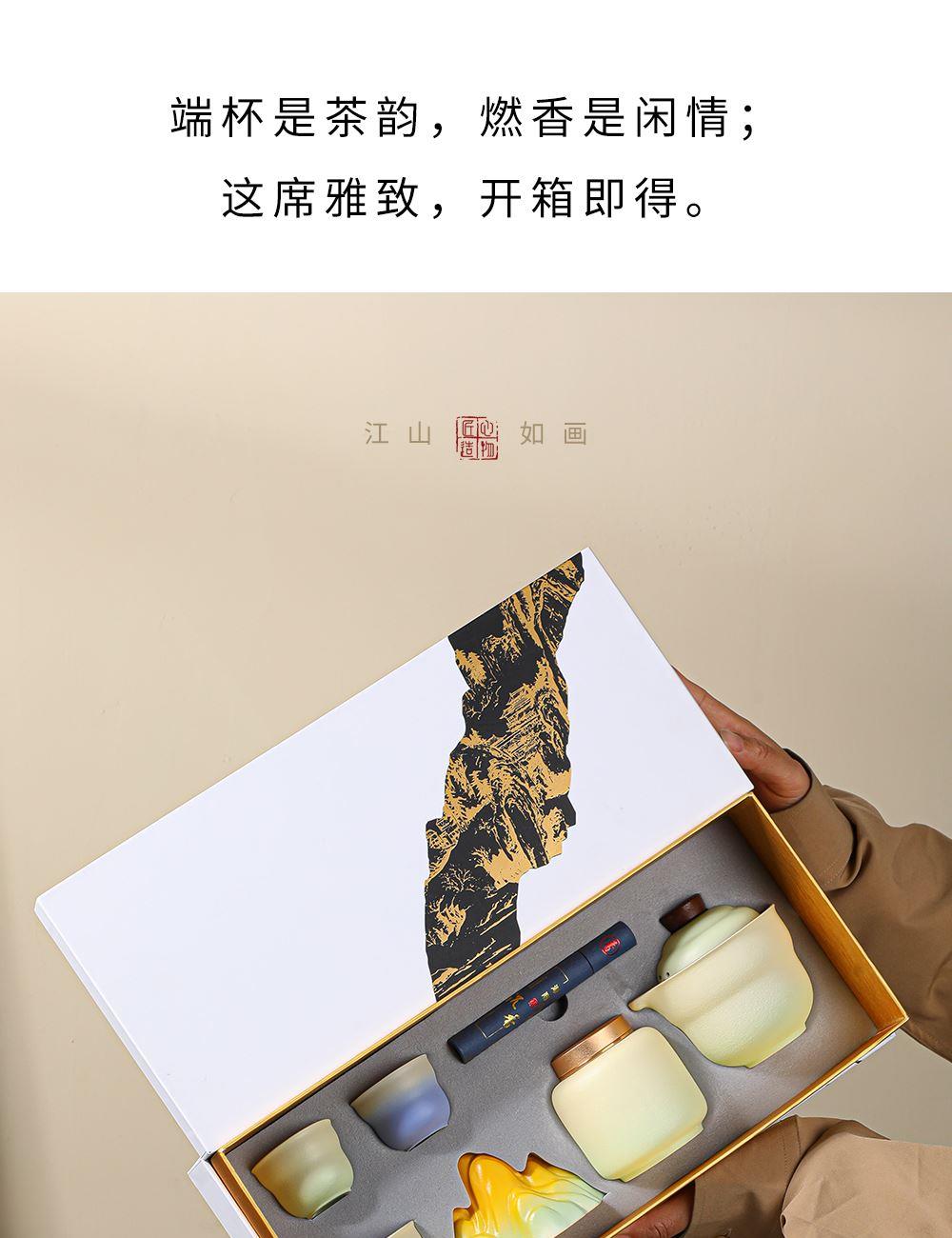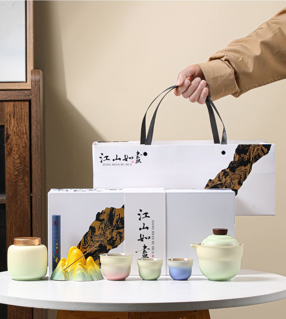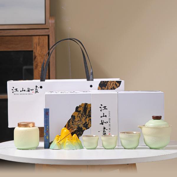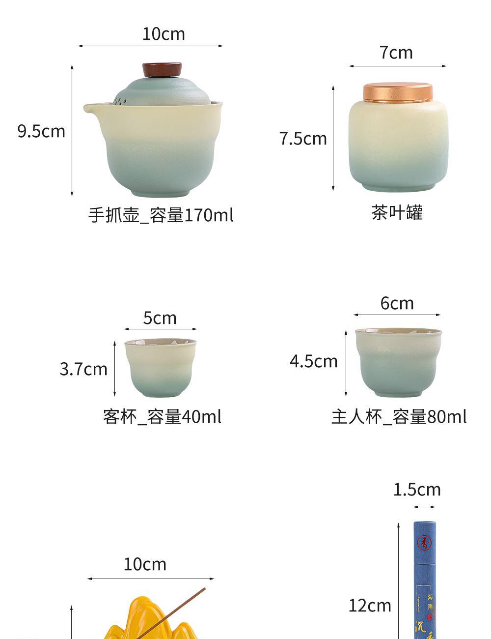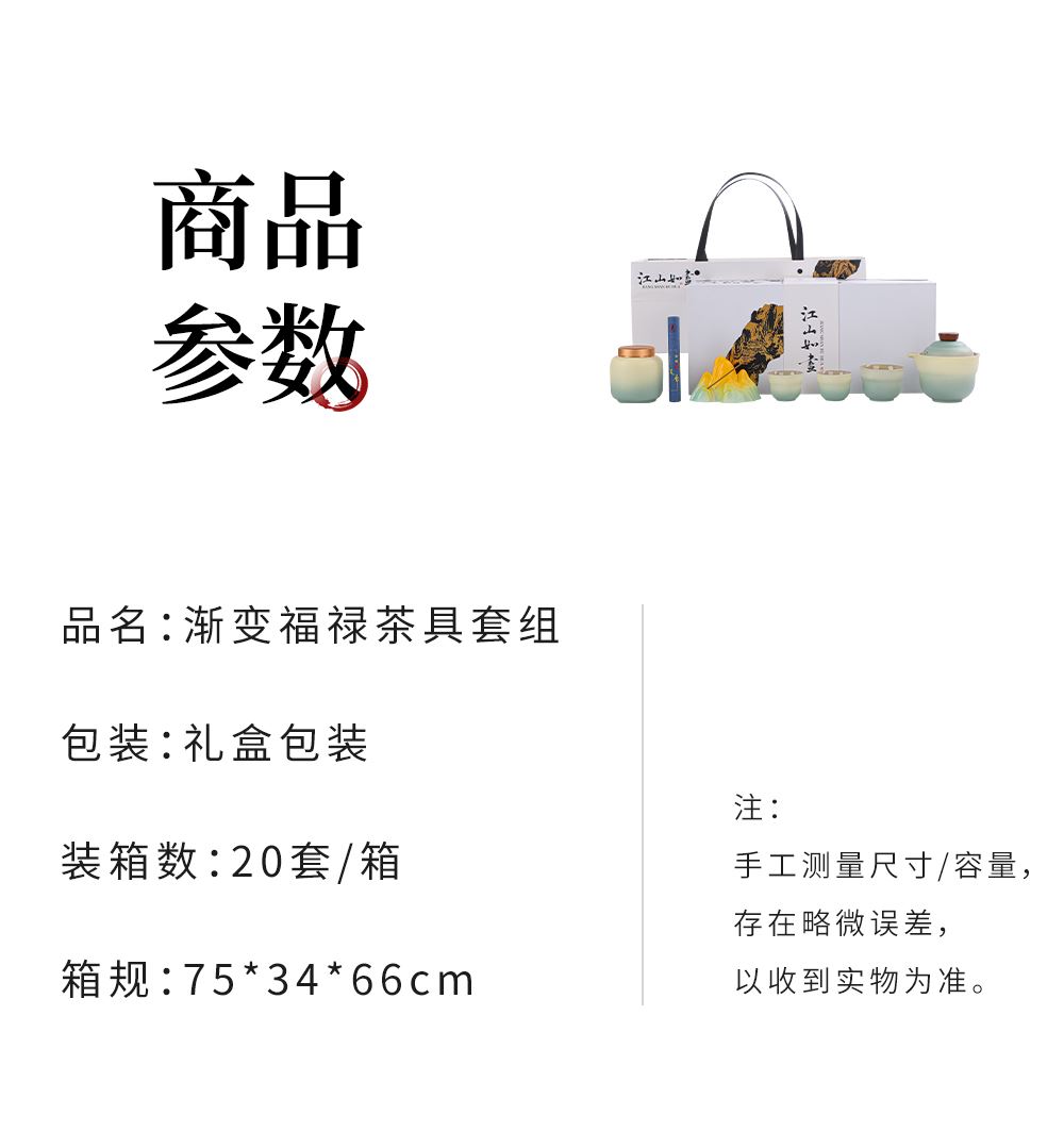 壶:10*9.5厘米170ml 品茗杯:5*3.7厘米40ml 茶叶罐:7*7厘米65ml 礼盒:36*12*12厘米 天然矿物釉,高温烧制无铅镉 ,精致便携, 搭配礼盒包装,自用赠礼两宜,瓷胎密实不吸茶香,久用更显韵味,以茶汤的甘醇,唤醒内心的宁静。