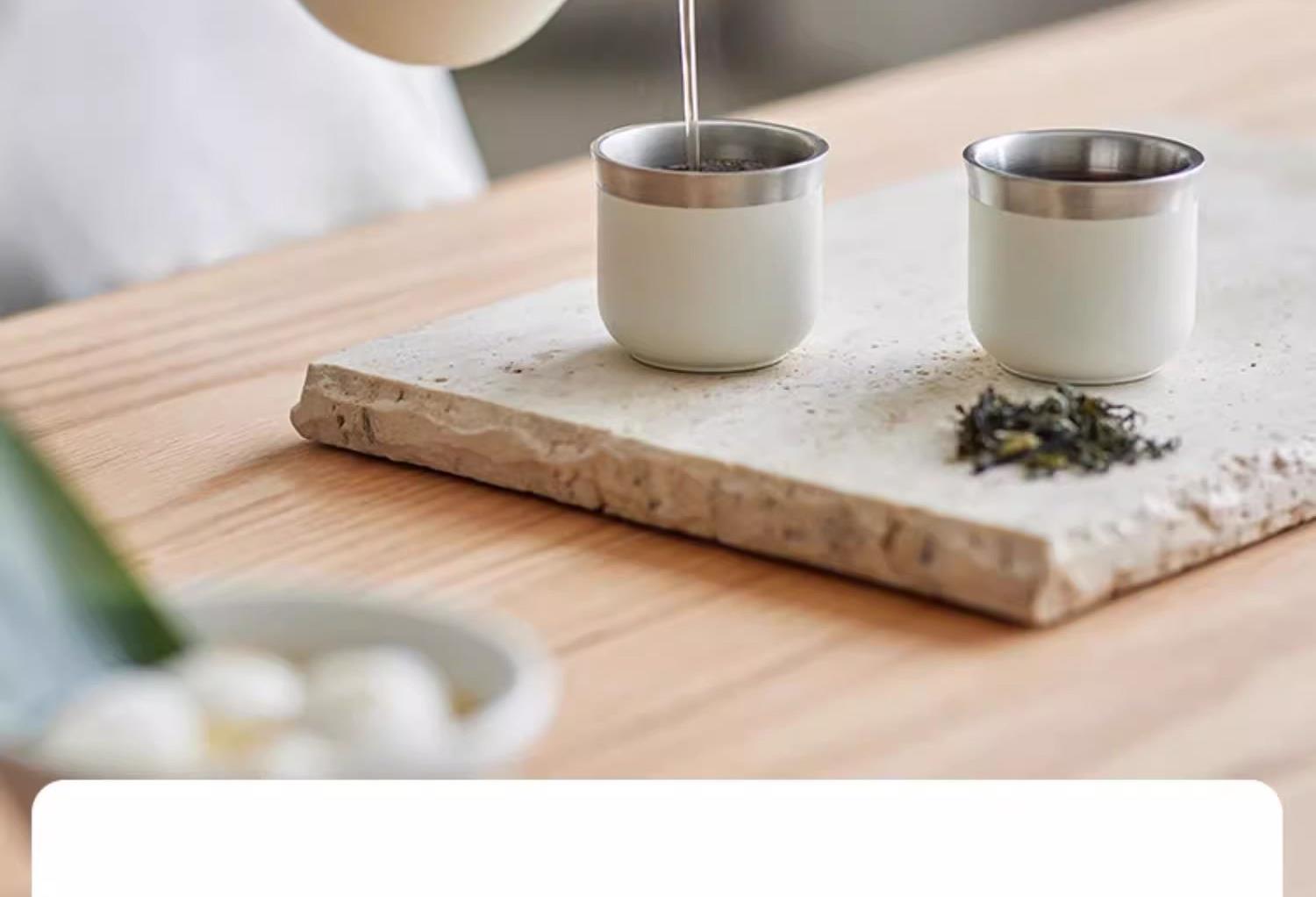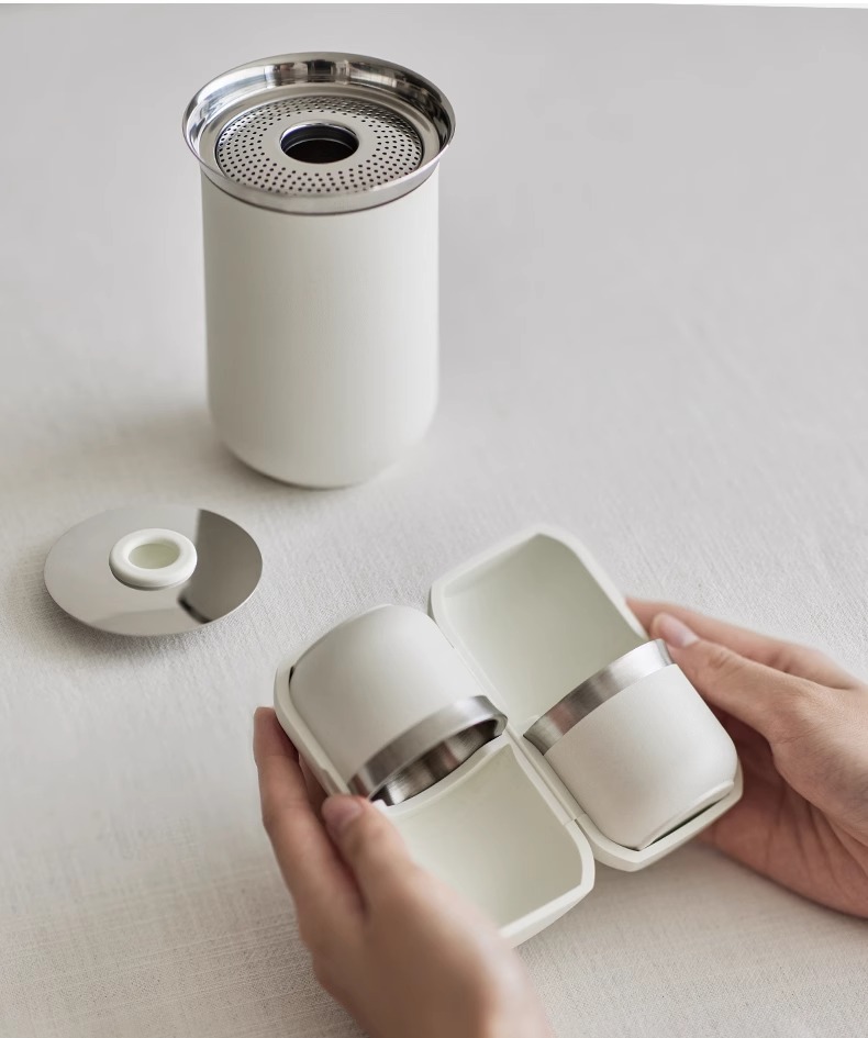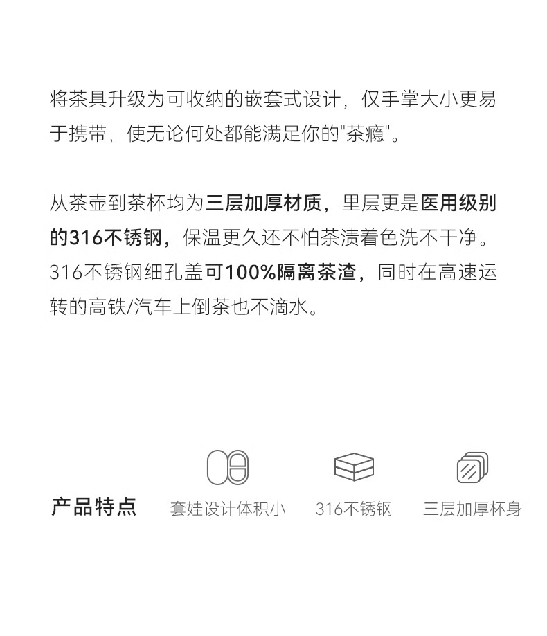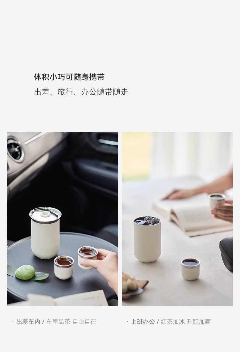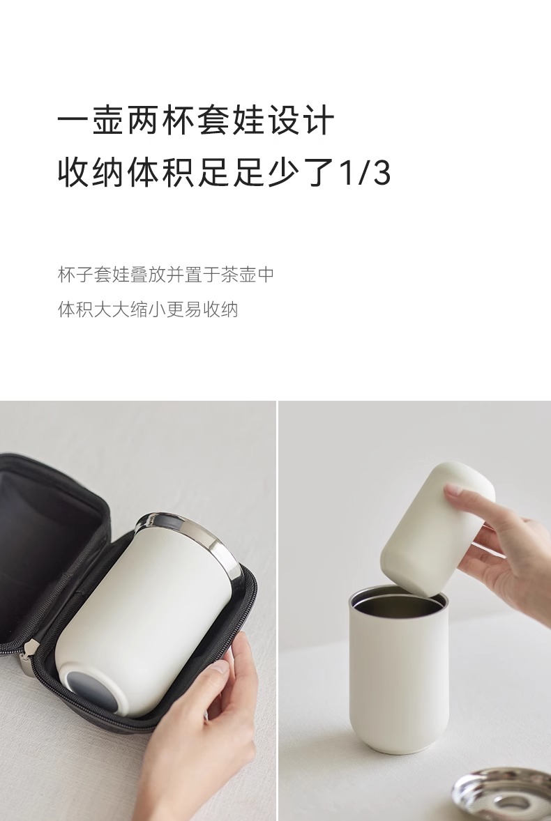 颜色:陶白色 茶壶容量:380ml 茶杯容量:60ml*2 茶壶尺寸:86*86*126mm 茶杯尺寸:51*51*45mm 茶杯+硅胶套尺寸:51*51*45mm 重量:280g 包装尺寸:98*98*165mm 1. 轻巧不占位,出行易携带 2. 采用316不锈钢,,比其他材质更安全持久耐用