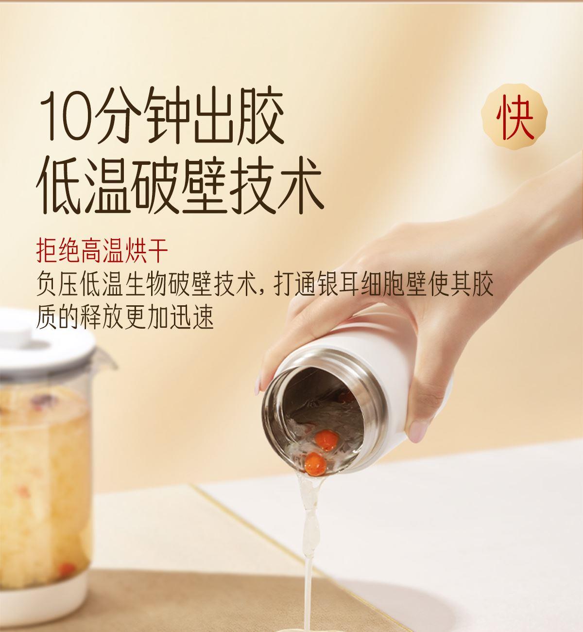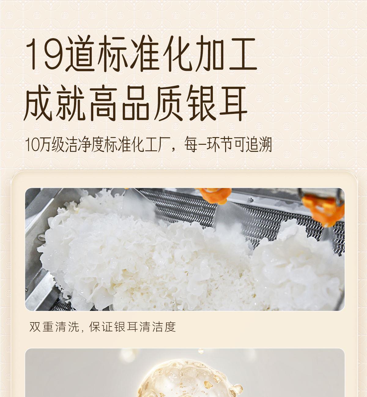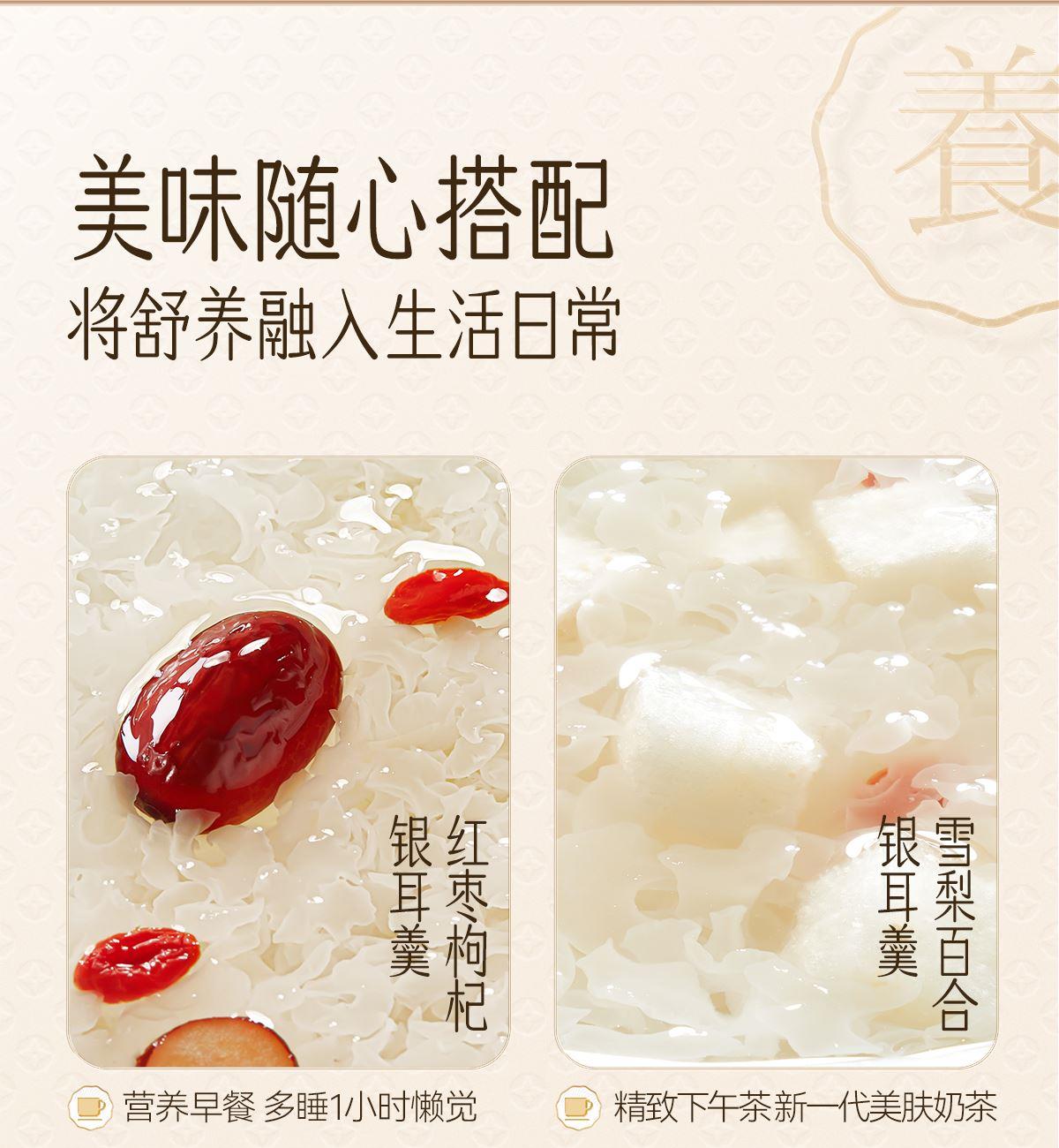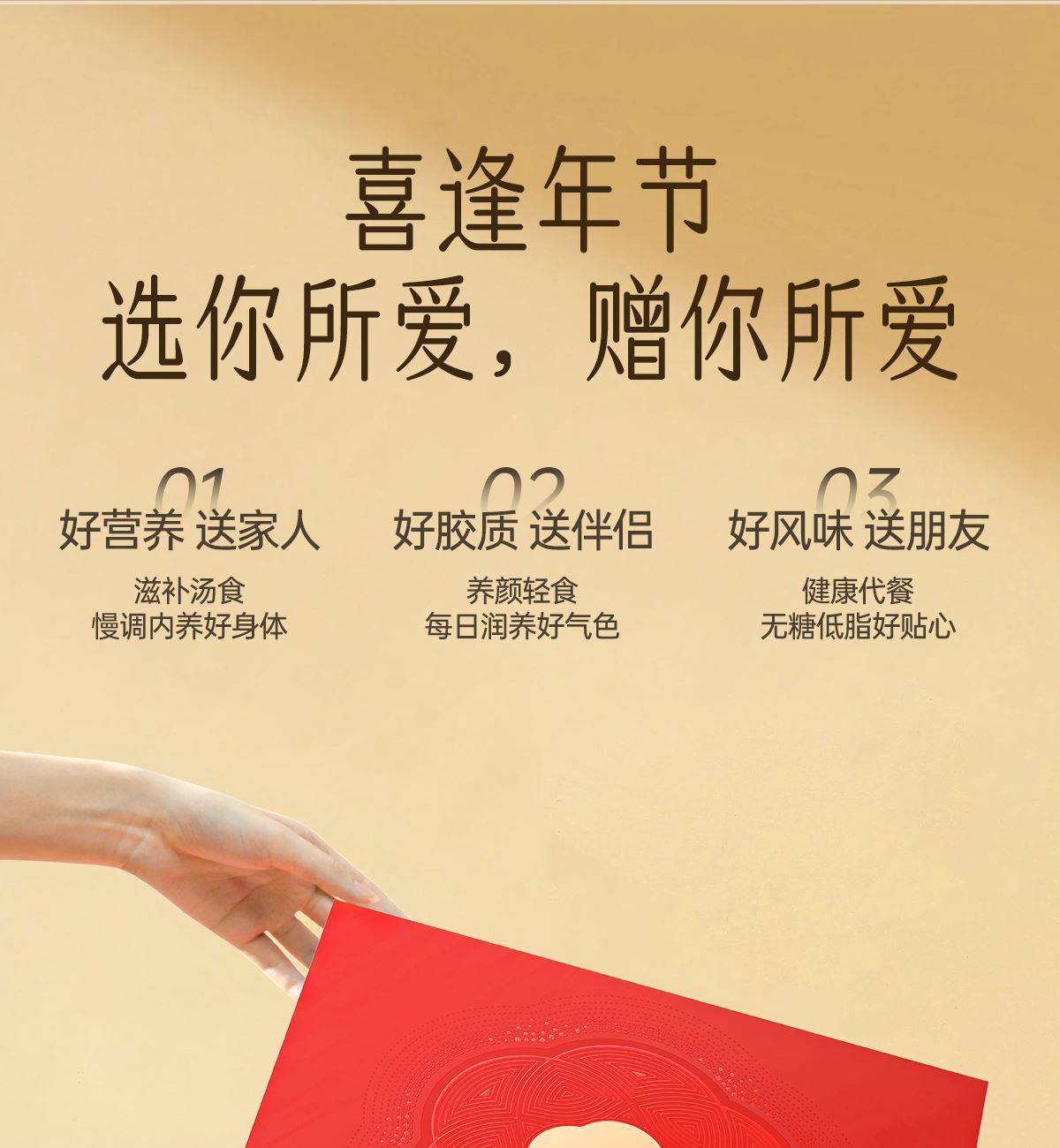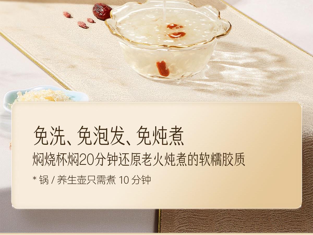 内含:纯萃80g*2、小金勺*1、焖烧杯*1、手提袋*1 净含量:160g 礼盒尺寸:31*25.6*11cm 保质期:12个月 推荐理由: 健康安全的植物培养基 精选三分之一的优质耳瓣,13朵鲜银耳=一罐80克银耳干品 营养价值含量高,20+种营养成分,胶养活性高分子含量为84%-93%,是普通银耳的3-4倍 免洗免泡发,煮10分钟、焖20分钟即食 胶质浓稠,口感爽滑,鲜香软糯 银耳双罐组合,送人倍添仪式感
