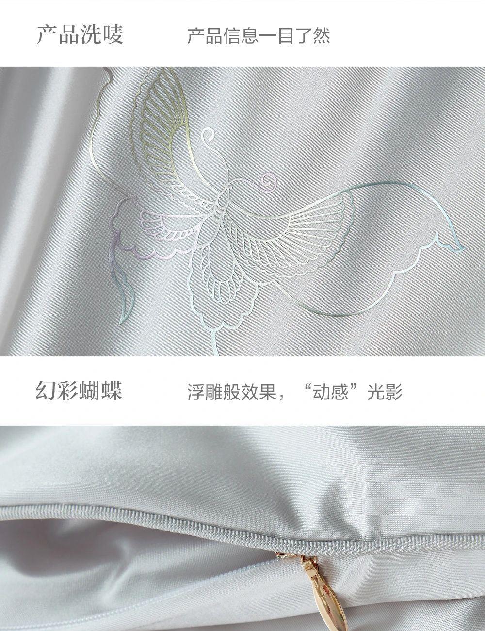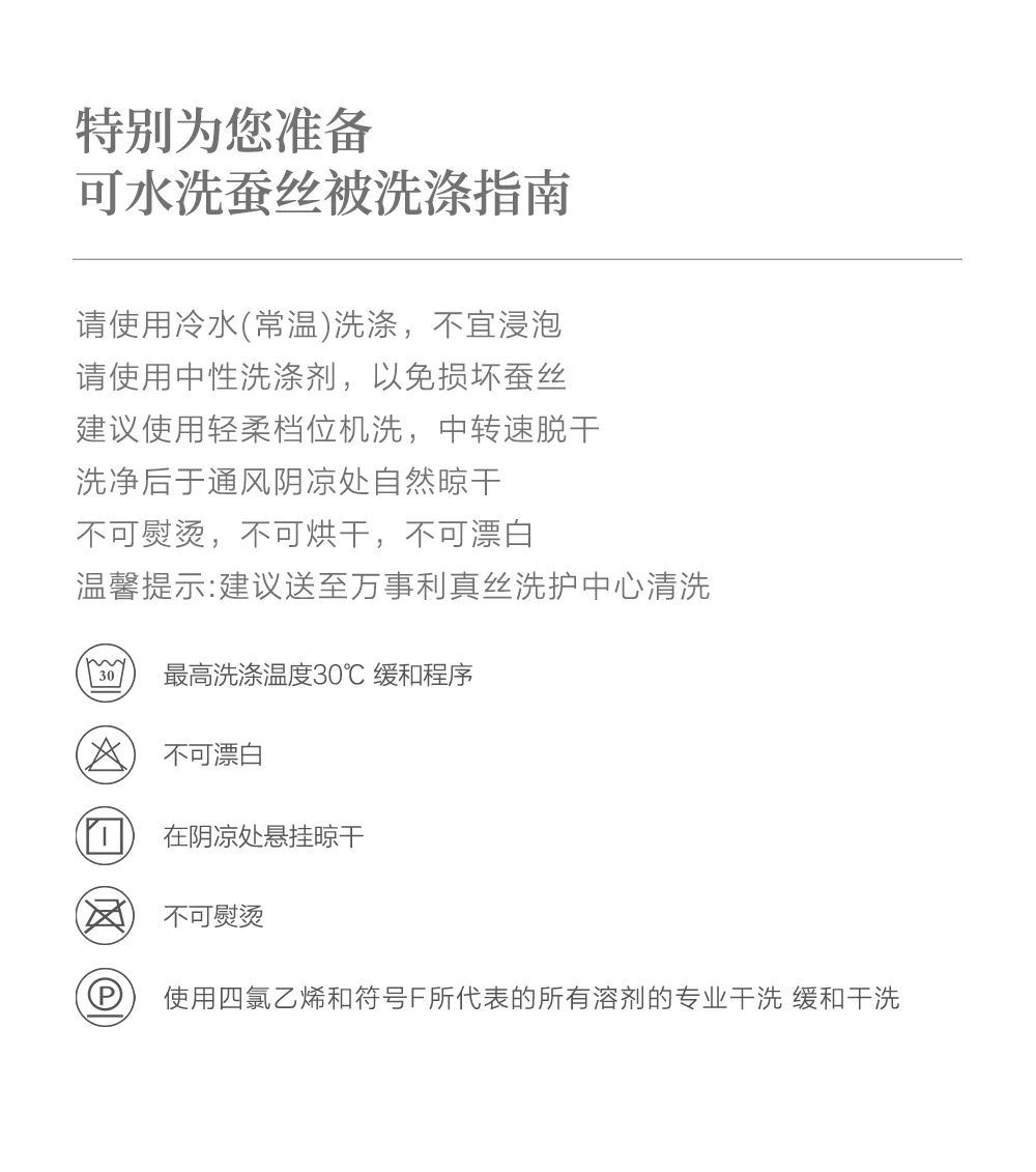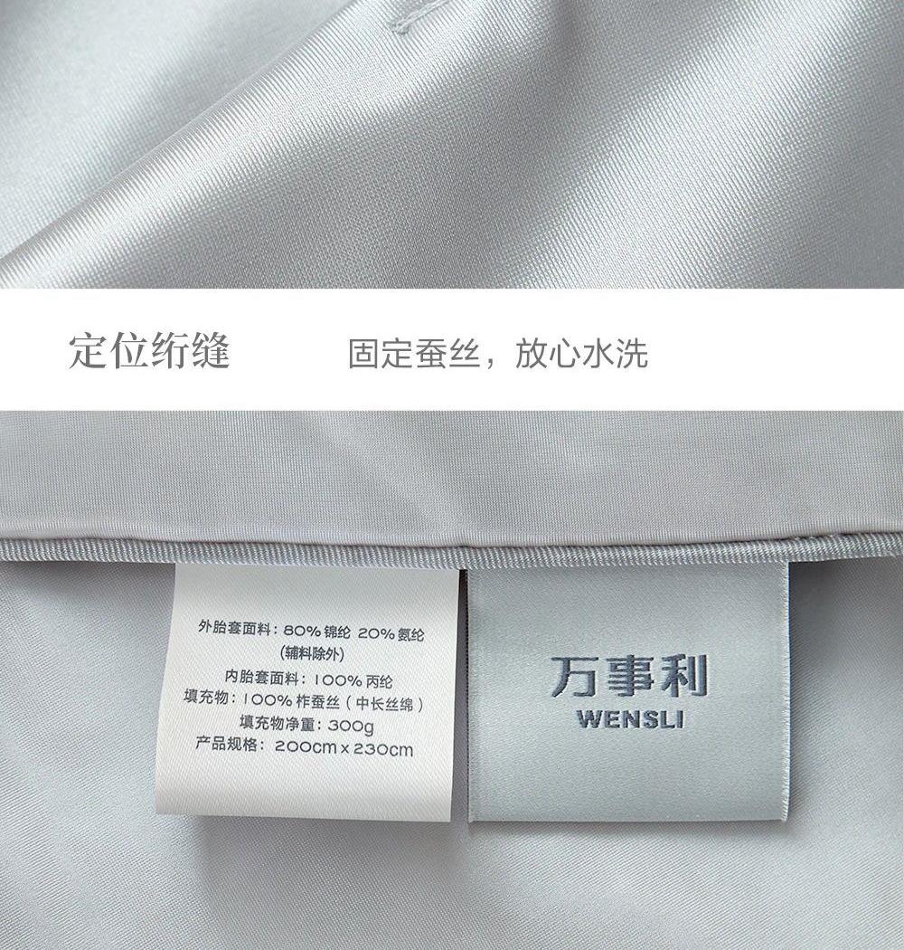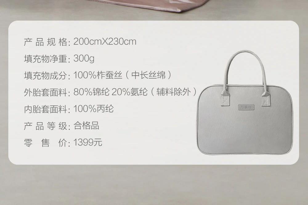 产品规格:200cmX230cm 填充物净重:300g 填充物成分:100柞蚕丝(中长丝绵) 外胎套面料:80%锦纶20%氨纶(辅料除外) 内胎套面料:100丙纶 产品 等 级:合格品