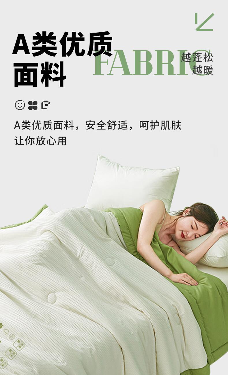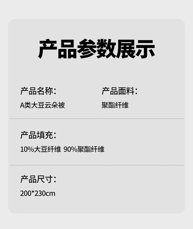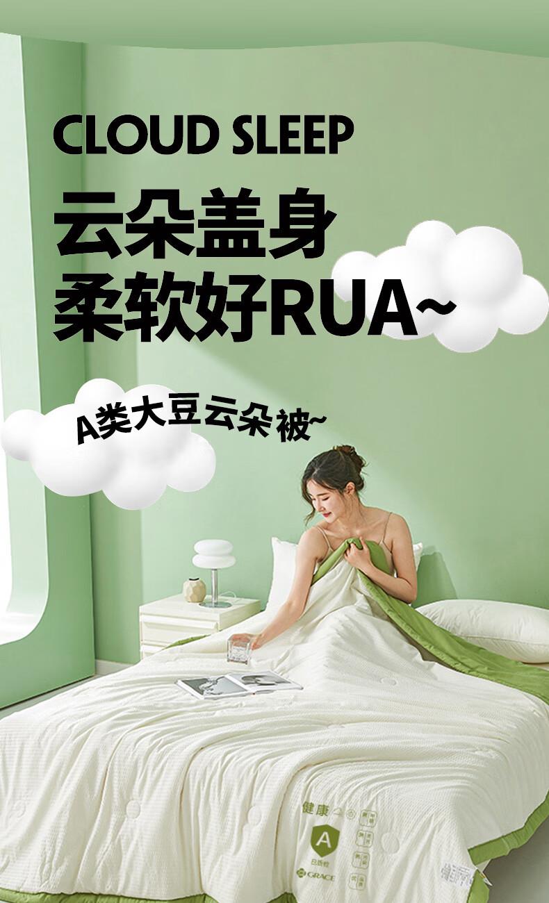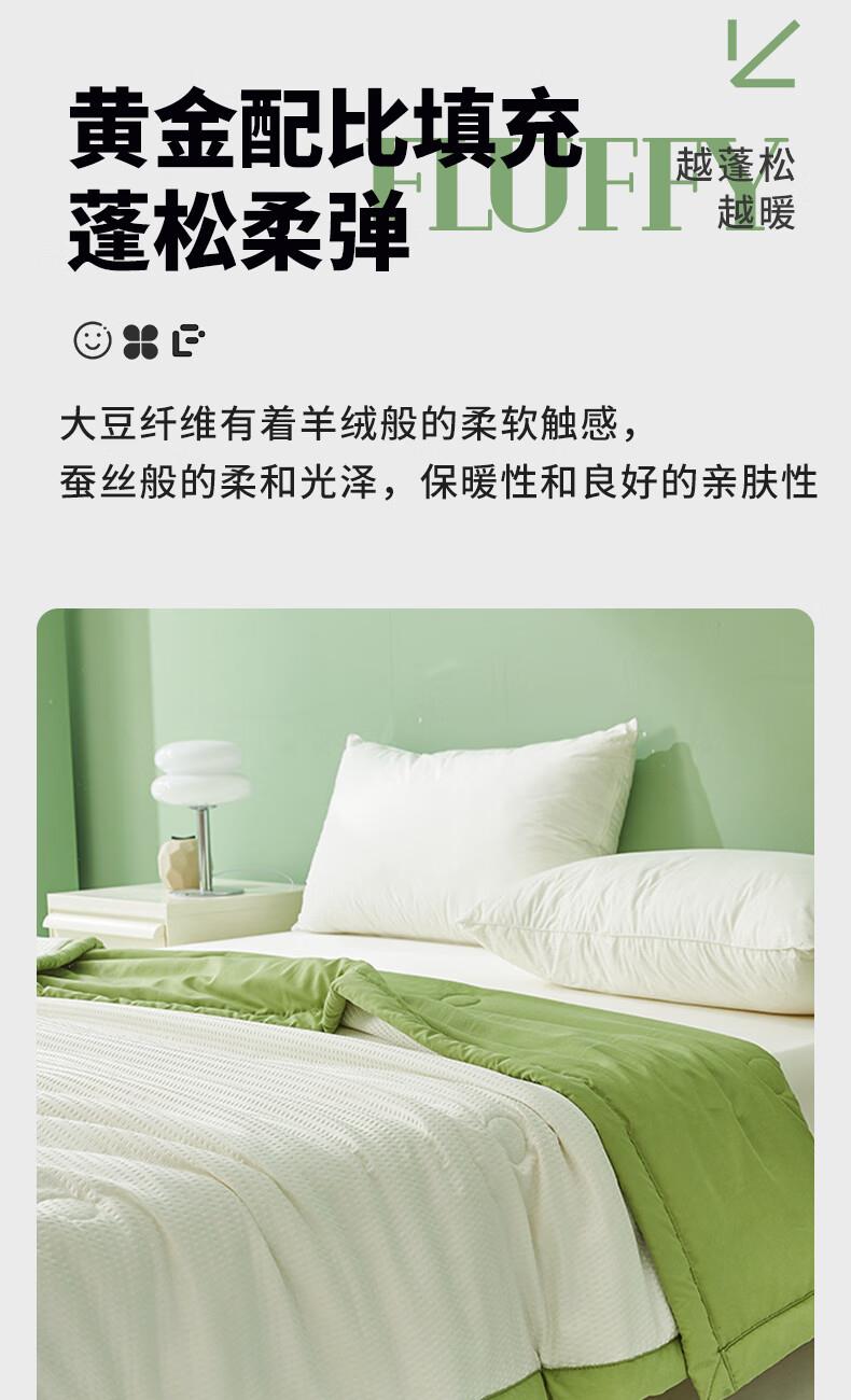 洁丽雅(Grace) 面料成分:涤纶(聚酯纤维) 净重:2-3斤 (含)填充物成分:涤纶(聚酯纤维),大豆蛋白纤维(大豆纤维)类型:单孔纤维被 适用季节:四季通用 是否子母被:单被 面料安全类别:A类 规格:200*230cm