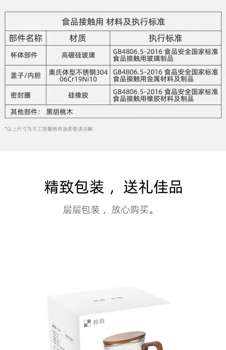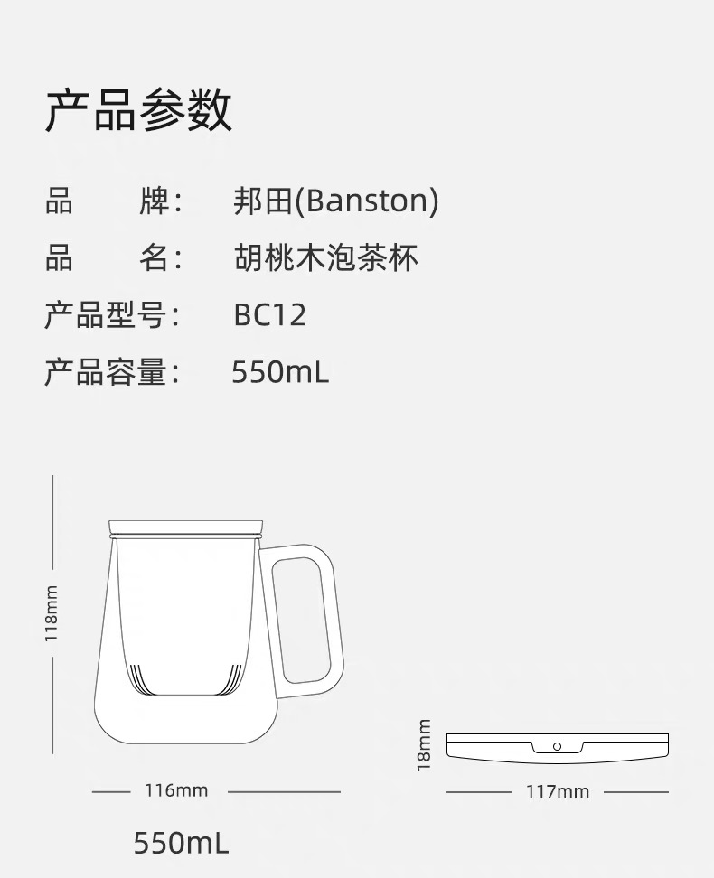 【 型 号 】:BC12 【 品 名 】:个人泡茶杯 【 材 质 】:高硼硅玻璃+食品级塑材+304不锈钢 【 工 艺 】:手工吹制 【包装重量】:0.385kg 【产品容量】:550ml 【外箱尺寸】: 129* 103 *133mm 【规格】:24个/箱 【整箱毛重】:10.24kg 【外箱尺寸】: 430 * 407 * 290mm 【使用范围】:适合绿茶、红茶、普洱茶、铁观音、花茶等 材质说明: 杯盖/把手:甄选北美黑胡桃木,打磨细腻,轻奢品质 两用杯盖:可做杯盖/可放杯盖 杯身:加厚高硼硅玻璃 食品级304不锈钢内盖 高密度过滤网,过滤顺畅,拒绝茶渣 胡桃木手把,打磨细腻,手感舒适