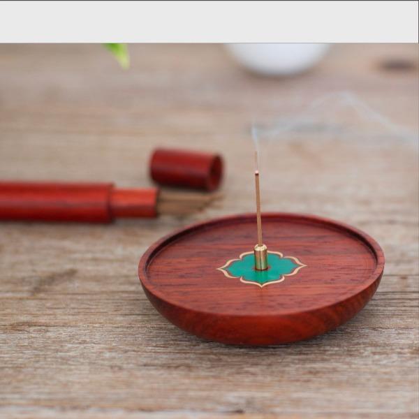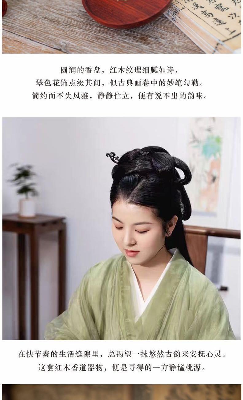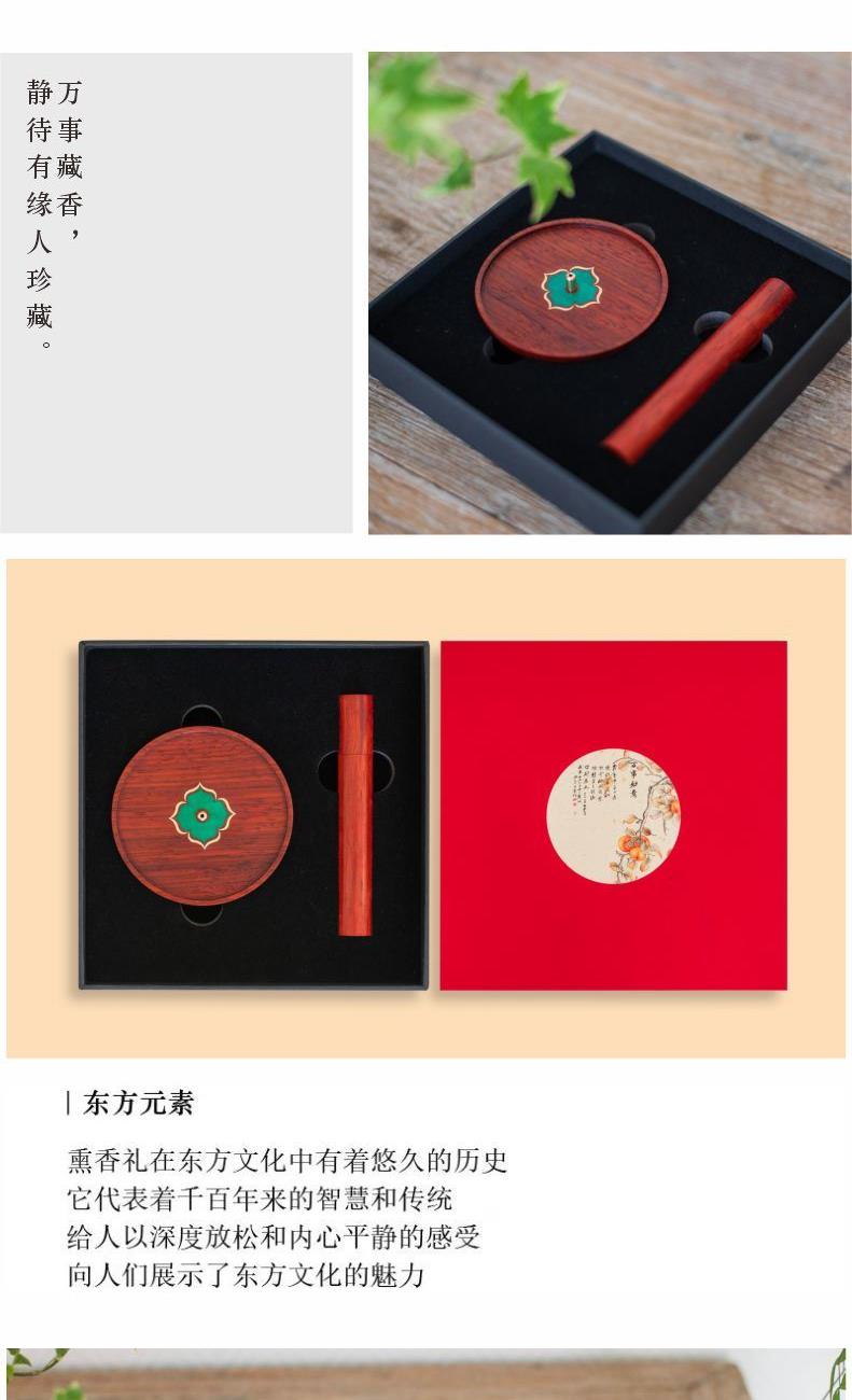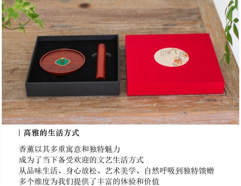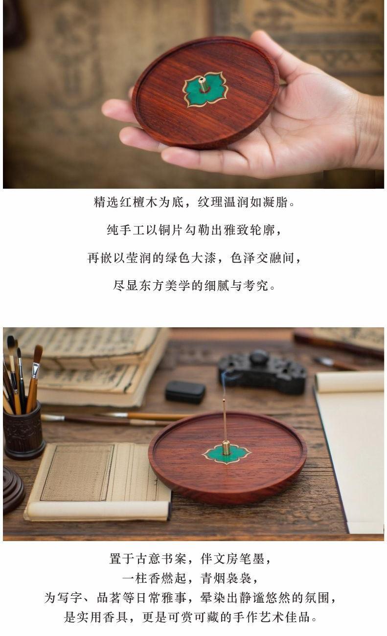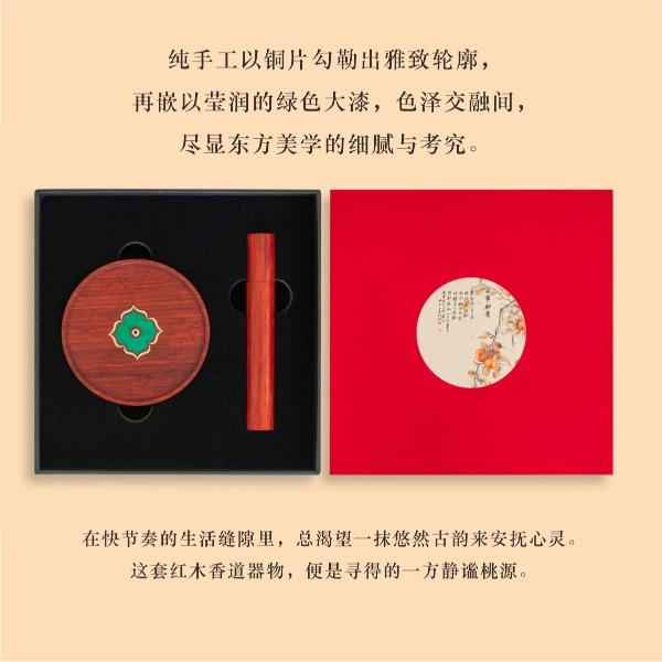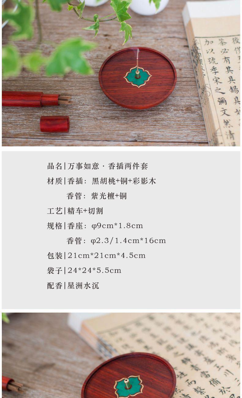 红花梨木精琢,温润雅致。圆形象征圆满,镶嵌绿色彩影木柿蒂纹,取“事事如意”吉兆。燃一线香,静心凝神,祥瑞盈室,祈愿诸事顺遂,岁月安康。 万事如意·香插套装 组合|香插+香管 材质|香插:黑胡桃+铜+彩影木 香管:紫光檀+铜 工艺|精车+切割 规格|香座:φ9cm*1.8cm 香管:φ2.3/1.4cm*16cm 包装|21cm*21cm*4.5cm 袋子|24*24*5.5cm