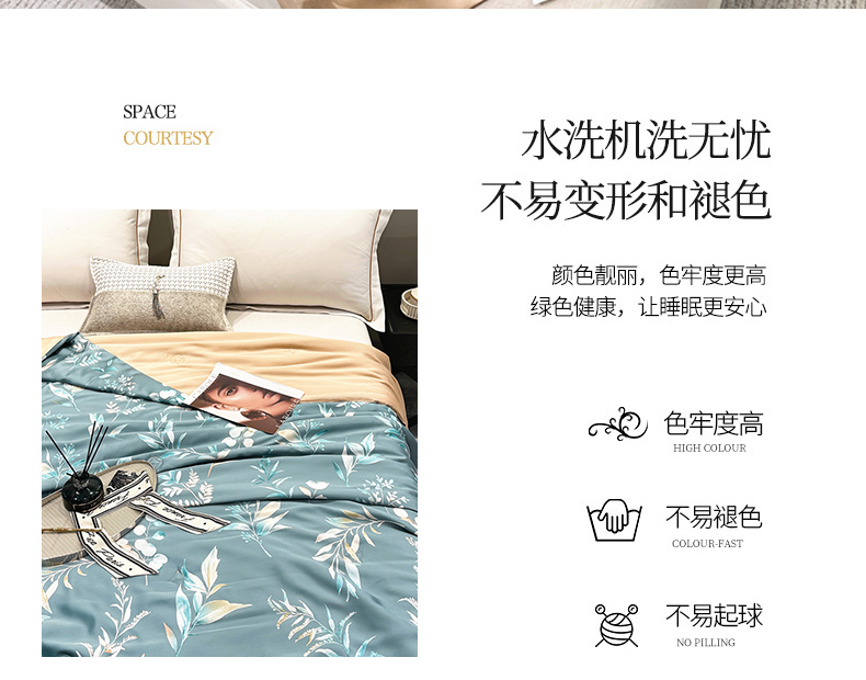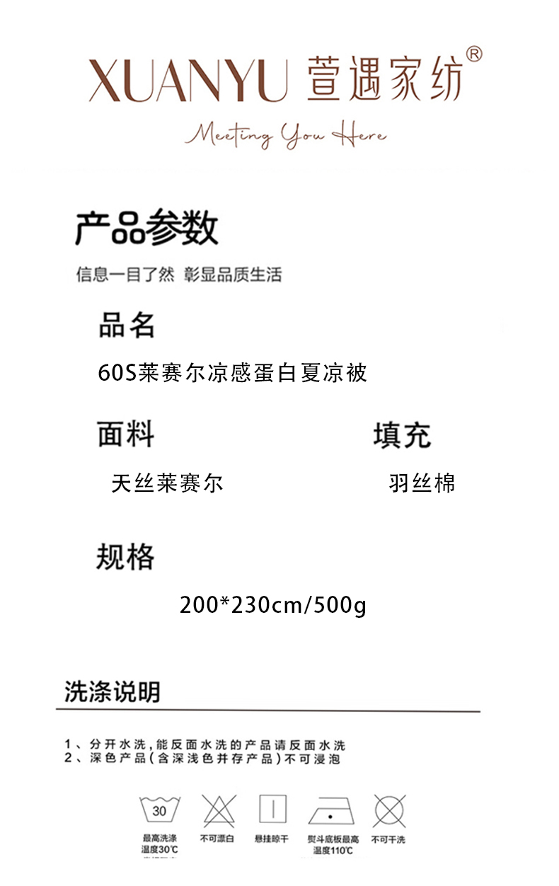 尺寸:200*230cm 面料:天丝莱赛尔 填充:羽丝棉 填充克重:500g 执行标准:GB/T22796-2021 安全类别:GB18401-2010 B类 1.纯净兰精天丝面料,瞬间凉感,丝滑透气,0感呼吸,夏日睡眠自由。 2.纤维表面细腻透气,赋予织物顺滑,夏季无闷热黏身感。