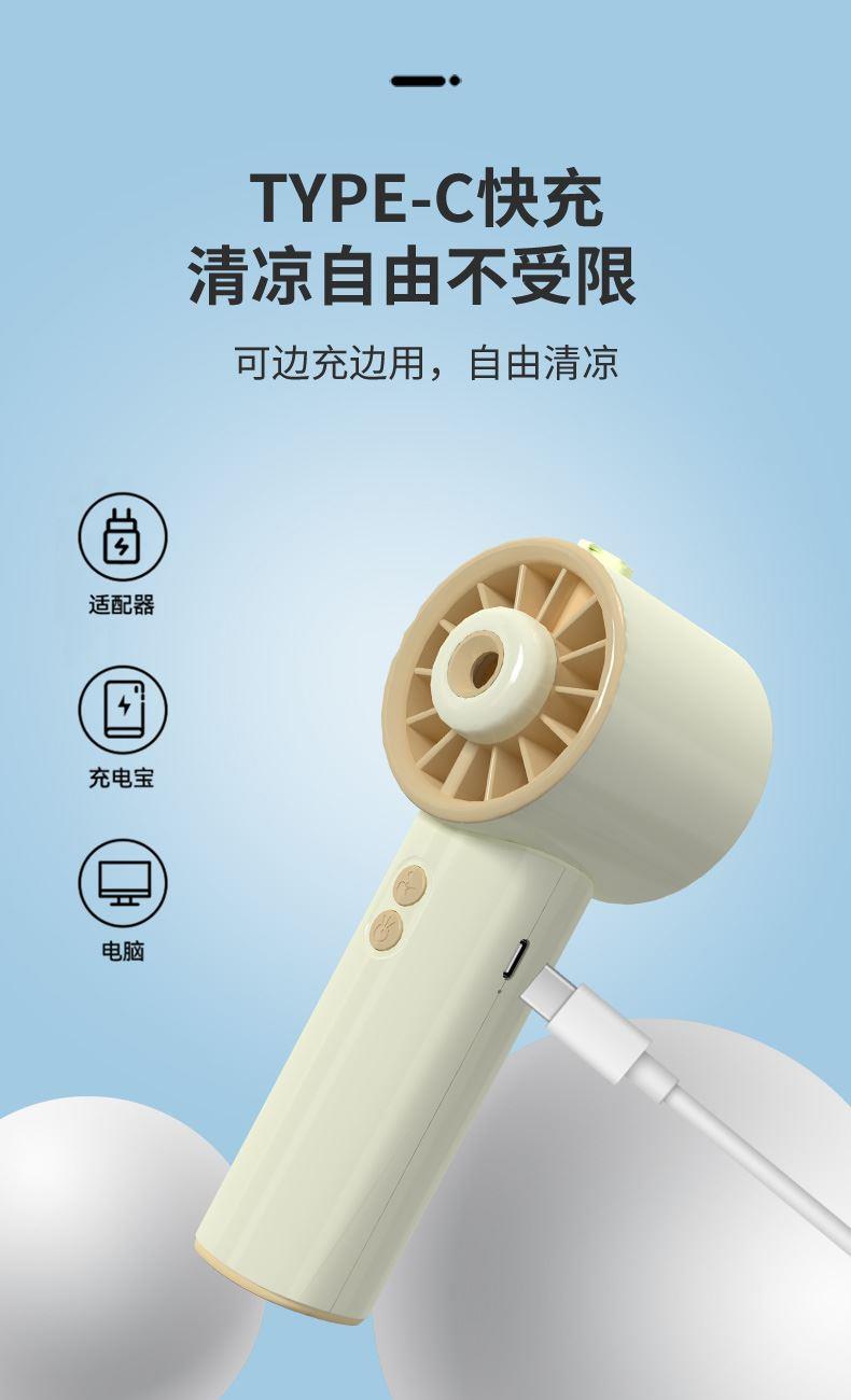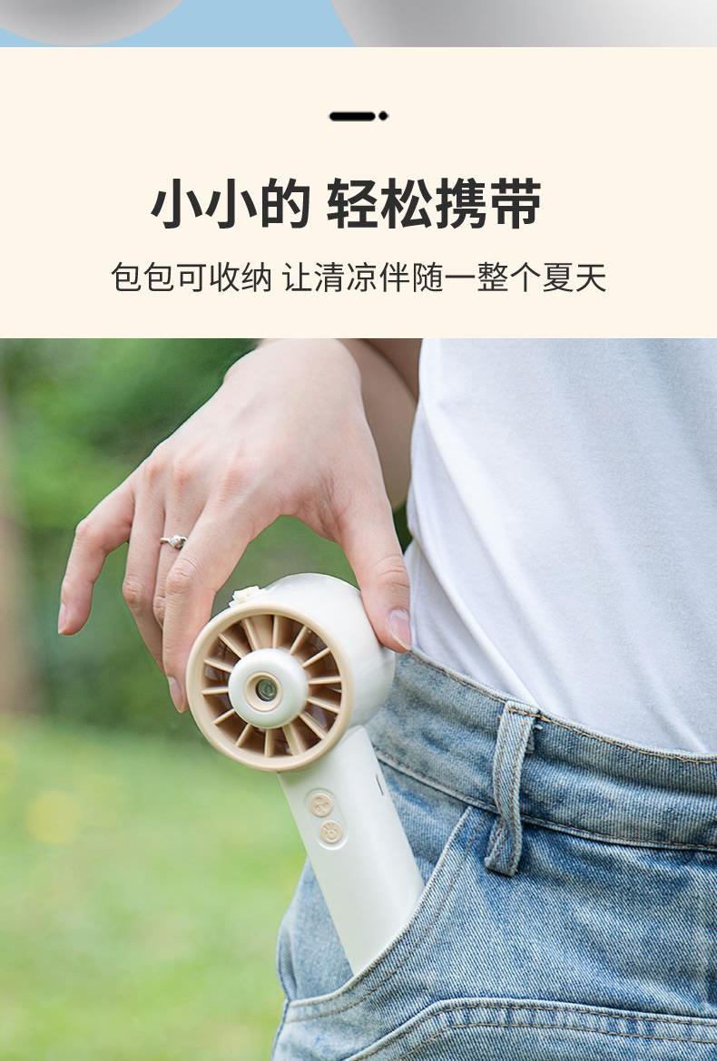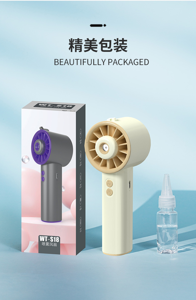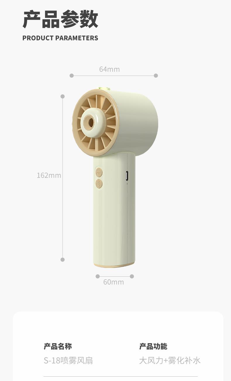 *手持+桌面+喷雾 *三档风力、2000mAh、补水加湿 *材质:ABS/电子元件/硅胶/雾化片 *产品重量:162g/200g *产品尺寸:162*64*60mm *包装盒尺寸:162*64*59.4mm *外箱尺寸:37.8*33.5*34.3CM *整箱重量:12/13KGS *颜色:灰色/香槟色 *标配:风扇、充电线、说明书、水瓶*1