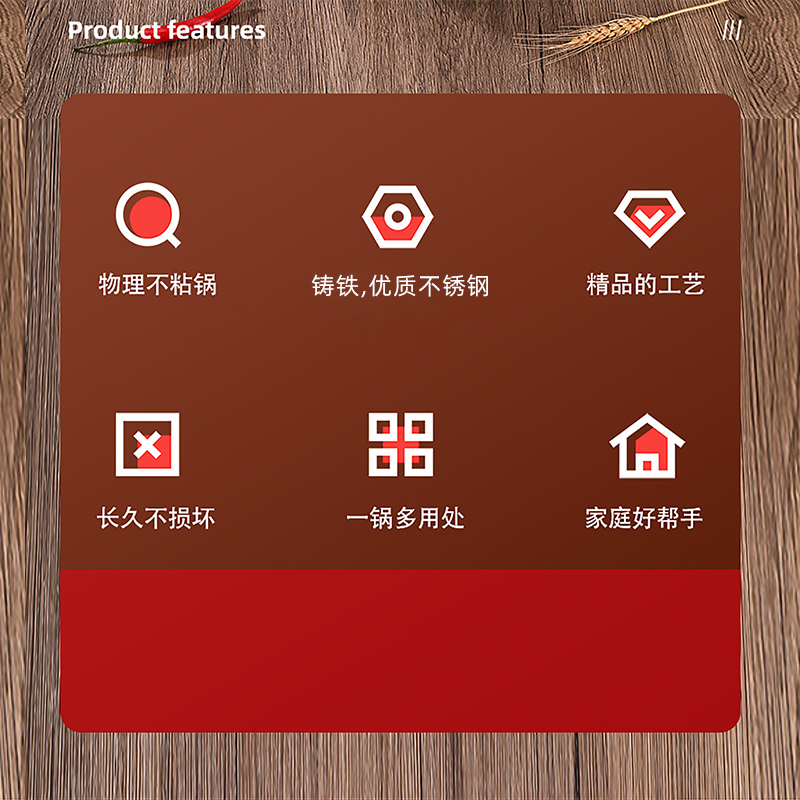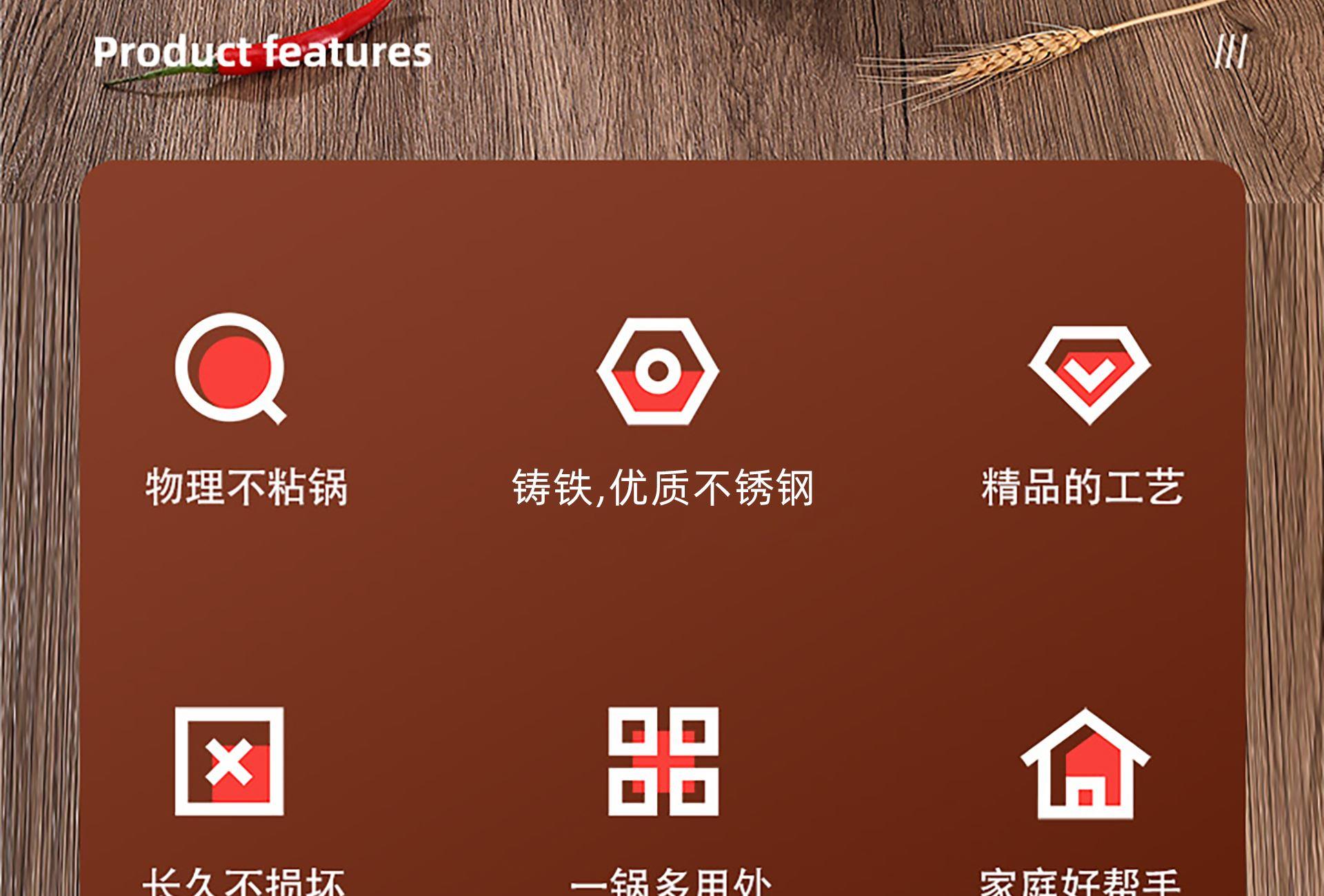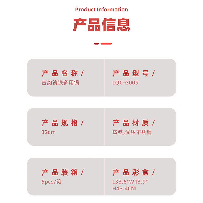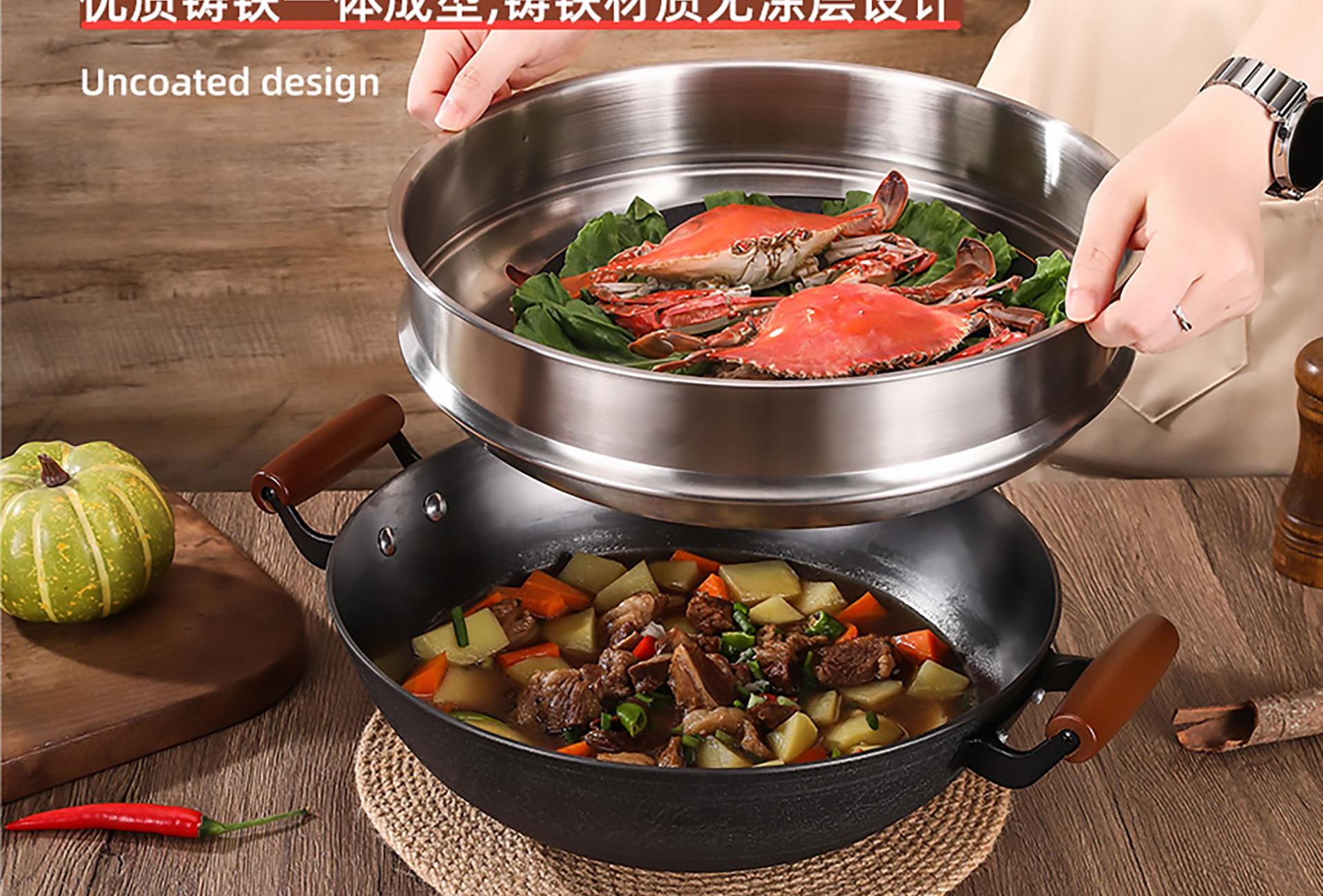 规 格:32cm 材 质:铸铁,优质不锈钢,茶色高硼硅盖 彩盒尺寸: L33.6*W13.9*H43.4CM 1、优质铸铁一体成型,坚固耐磨不易变形,只要日常使用得当, 就能越用越润、不易粘锅,使用寿命远超普通锅具; 2、铸铁材质导热均匀、蓄热强,能更快形成锅气,爆炒、炖煮、煎制都能让 食材口感更入味; 3、铸铁材质无涂层设计,烹饪中还能融入铁元素,长期使用更健康。 4、双耳设计,搭配不锈钢蒸笼,立变蒸锅,蒸、煮、炖、焖,一锅搞定, 使用场景更广泛。