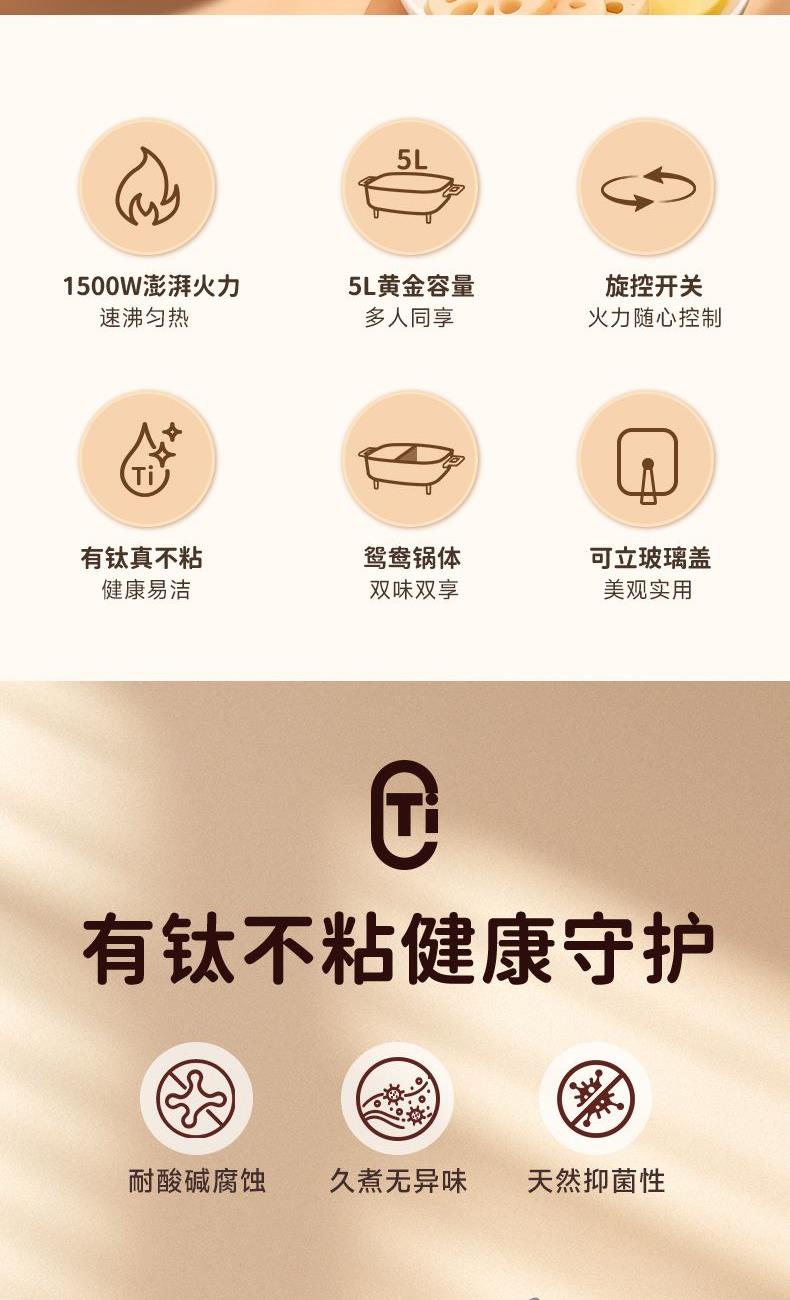 产品型号:AH-F15J468 产品规格:5L/1500W 产品颜色:褐色 产品结构: 连体式 电压/频率: 220V/50HZ 容量/功率: 5L/1500W 净重: 3kg 1、1500W澎湃火力,速沸匀热, 2、5L黄金容量,多人同享 3、旋控开关,火力随心控制 4、有钛真不粘,健康易洁 5、鸳鸯锅体,双味双享 6、可立玻璃盖,美观实用