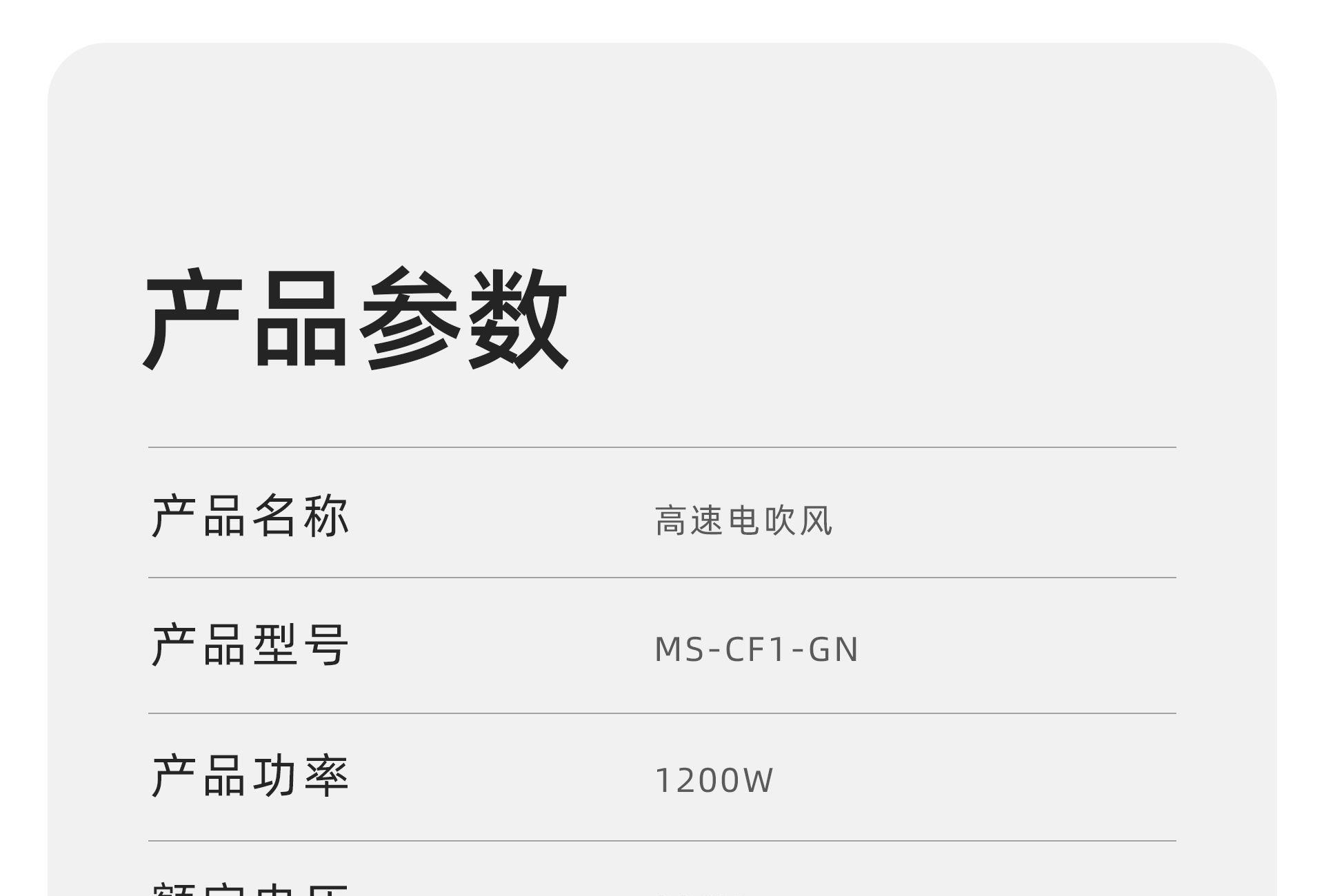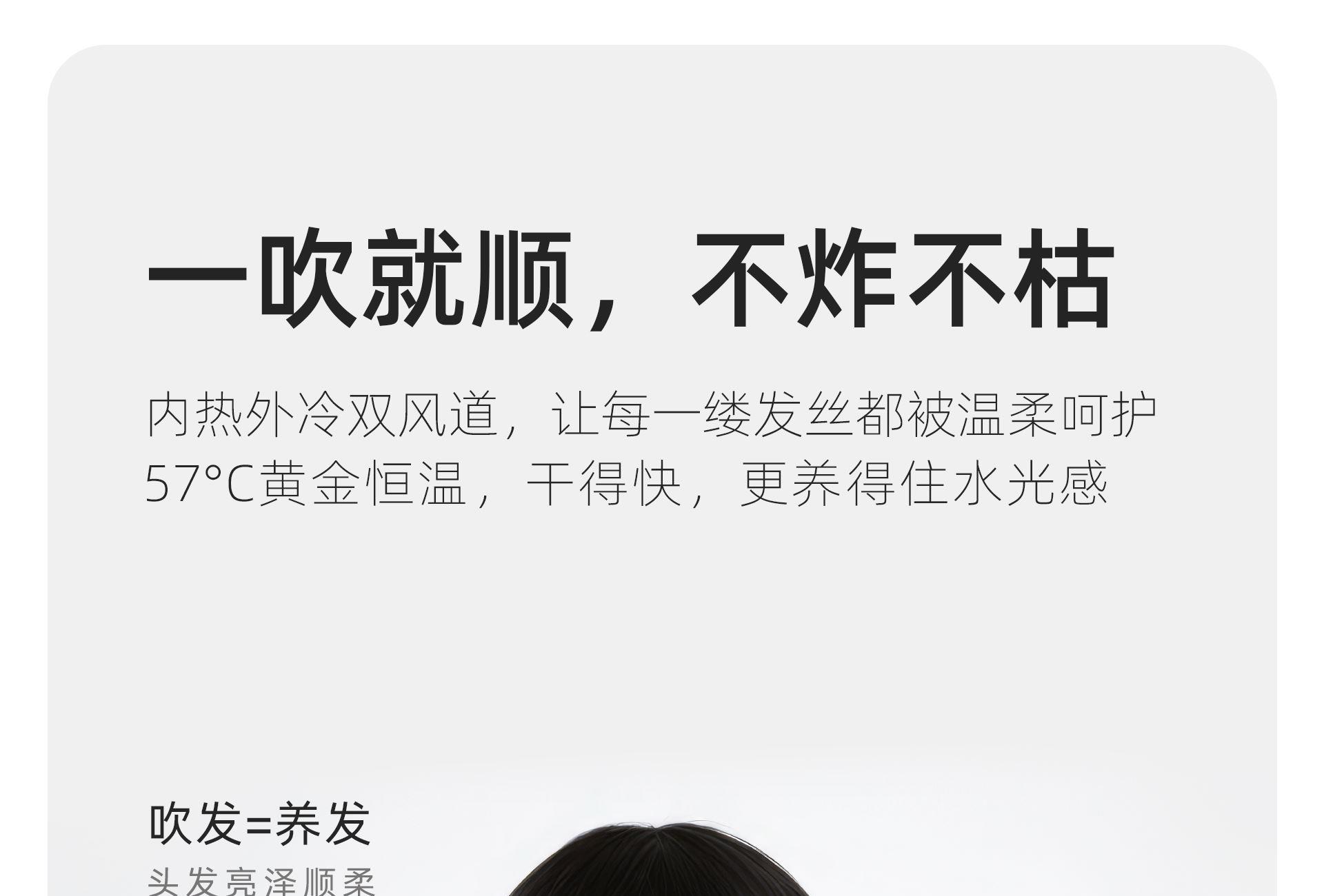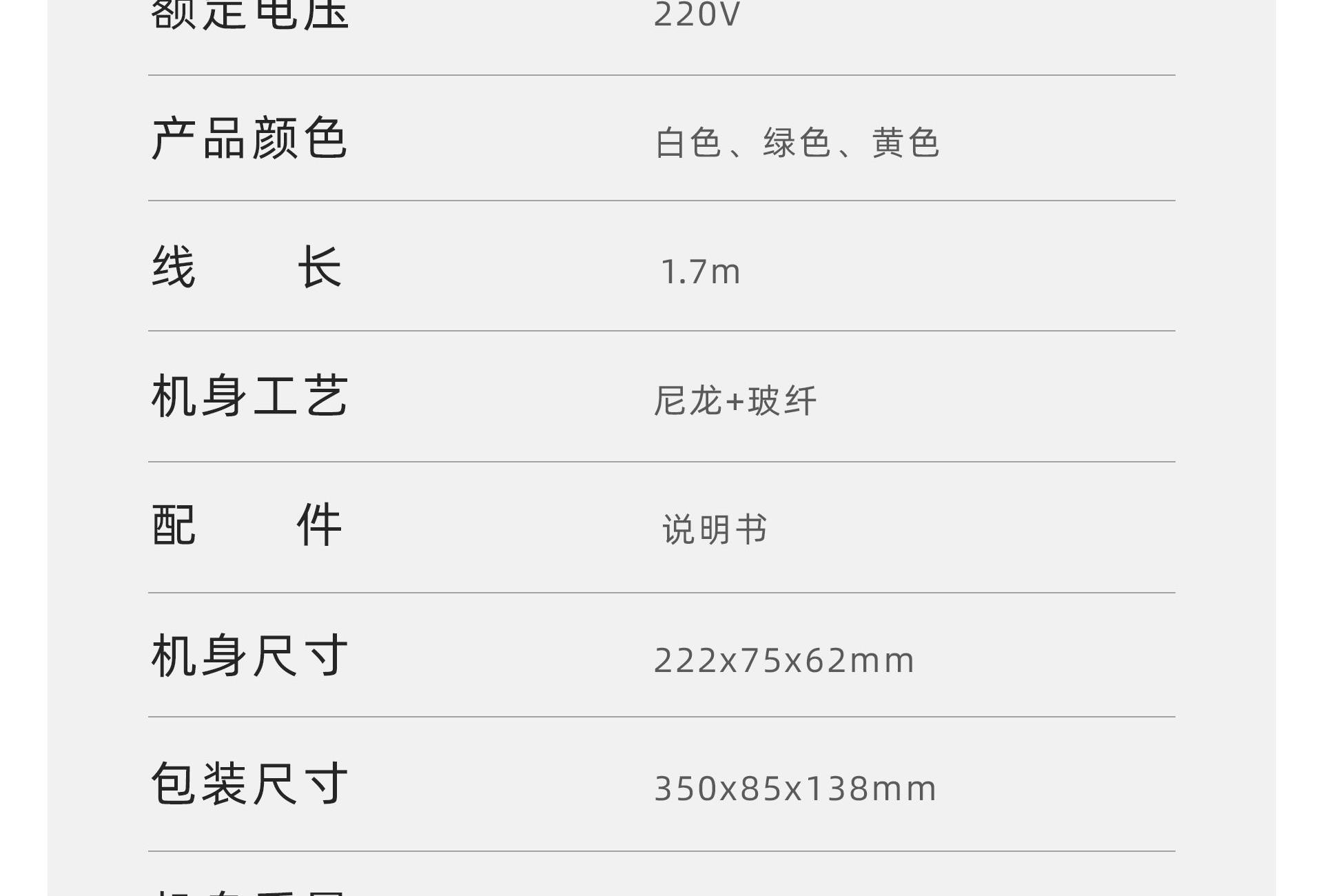 功率:1200W 额定电压:220V 机身工艺:尼龙+玻纤 产品尺寸:222*75*62mm 产品净重:0.28kg(不含线) 1、小巧轻盈,掌握自如; 2、冷热双流黑科技,57℃恒温; 3、1200W高功率,短发50s速干; 4、5千万ions/㎝³负离子,护发养发;