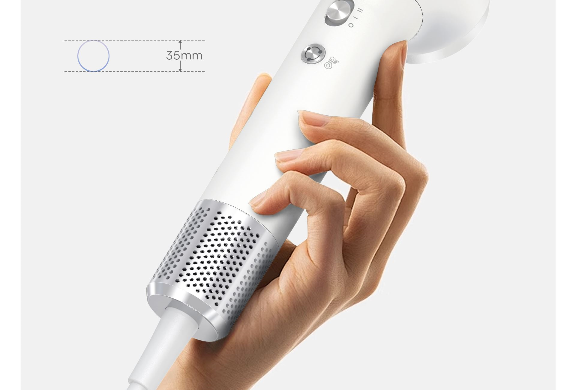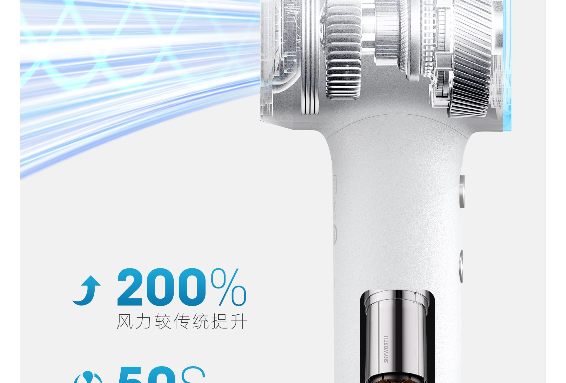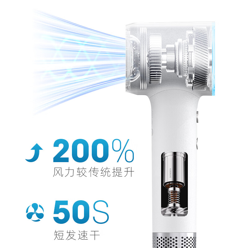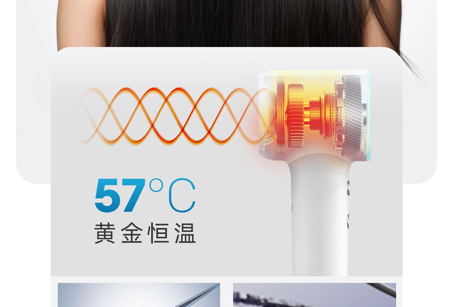 功率:1200W 额定电压:220V 机身工艺:尼龙+玻纤 产品尺寸:222*75*62mm 产品净重:0.28kg(不含线) 1、小巧轻盈,掌握自如; 2、冷热双流黑科技,57℃恒温; 3、1200W高功率,短发50s速干; 4、5千万ions/㎝³负离子,护发养发;