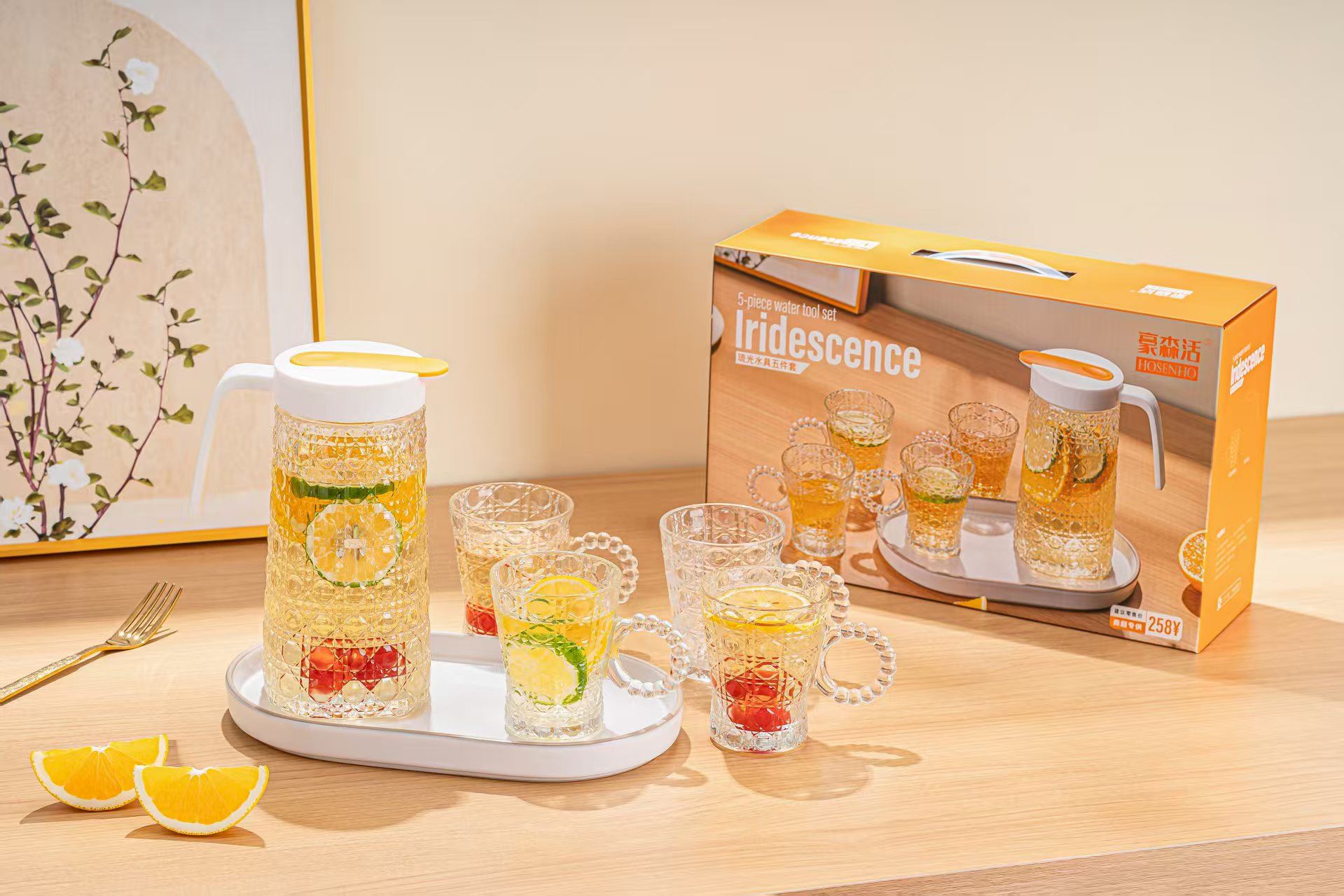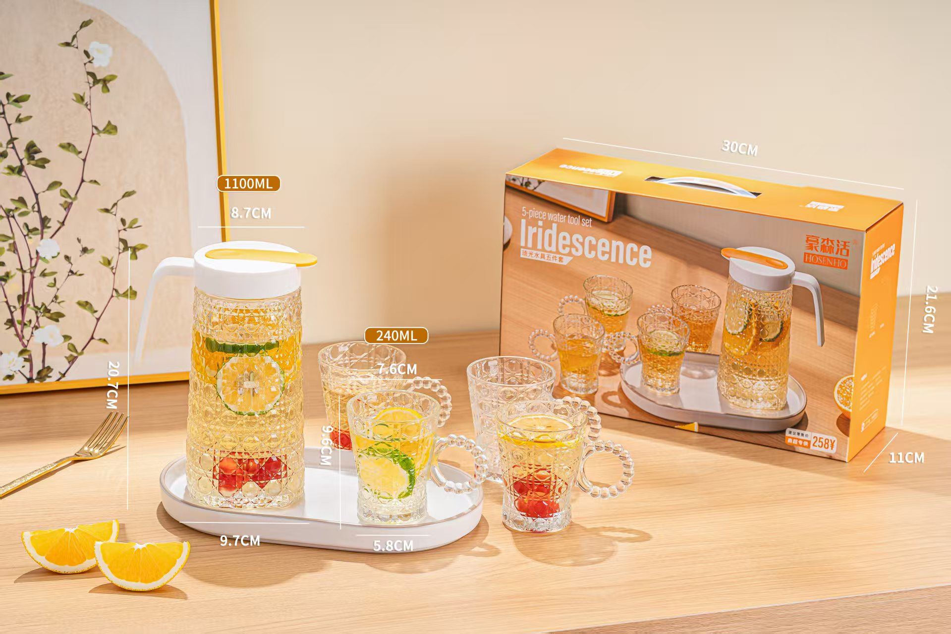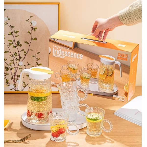 规格:1*10套 货号:LGSJ-L5 容量:壶体1100ml*1+杯子240ml*4 彩盒尺寸:34.2*13*22cm 外箱尺寸:69.8*40*50cm 条码:6976254570498 产品买点:“打破传统的圆形或方形设计,使水具在视觉上更加独特和吸引人,水杯的设计也会与水壶相呼应,整体呈现出和谐统一的美感。象征家庭团圆、和睦。一家人围坐在一起,使用这套水具饮水、品茶,寓意着生活圆满,充满温馨与欢乐,体现了对家庭和谐、幸福生活的向往。
