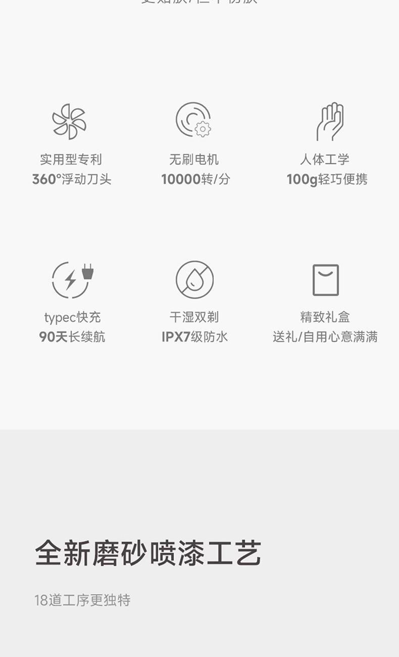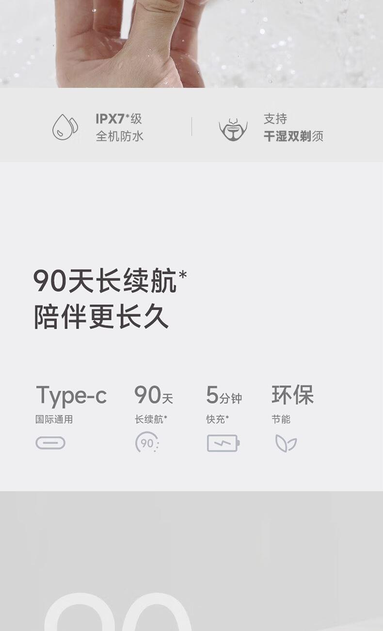 产品型号:CCS-J020 电池:600mah 重量:100g 防水等级:ipx7 充电时间:1h 重量只有100G,商务出差、旅游、户外活动等场景轻松搞定 旅行锁模式,携带更安全更省心 10000转/min,我们追求的是更干净 可独立浮动双刀头,洁净不留死角 双层刀片。对胡须双管齐下 Ipx7防水,随心所“浴”清洗可以毫不费力