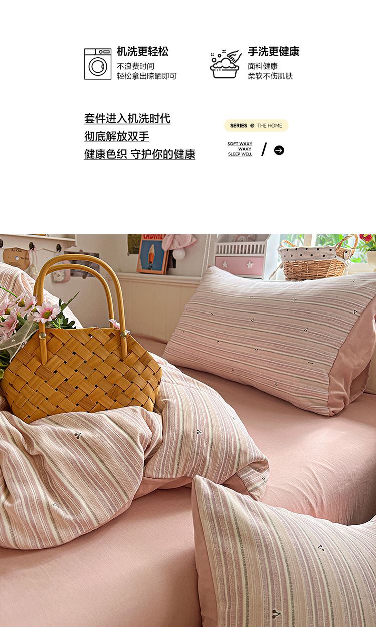 1:甄选色织提花软糯舒适 柔软透气云感般触感丰满细腻的触感给肌肤柔软宠爱 2:高支高密织造云朵般享受,面料柔软舒适耐磨耐用 不易起球 尺寸:被套200*230cm*1 床单:260*250cm*1 枕套48*74cm*2 面料:云感色织提花 重量:2kg(净重) 包装:彩盒