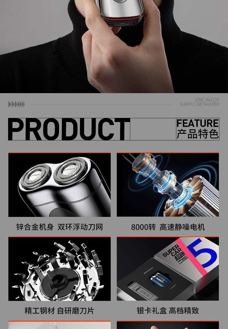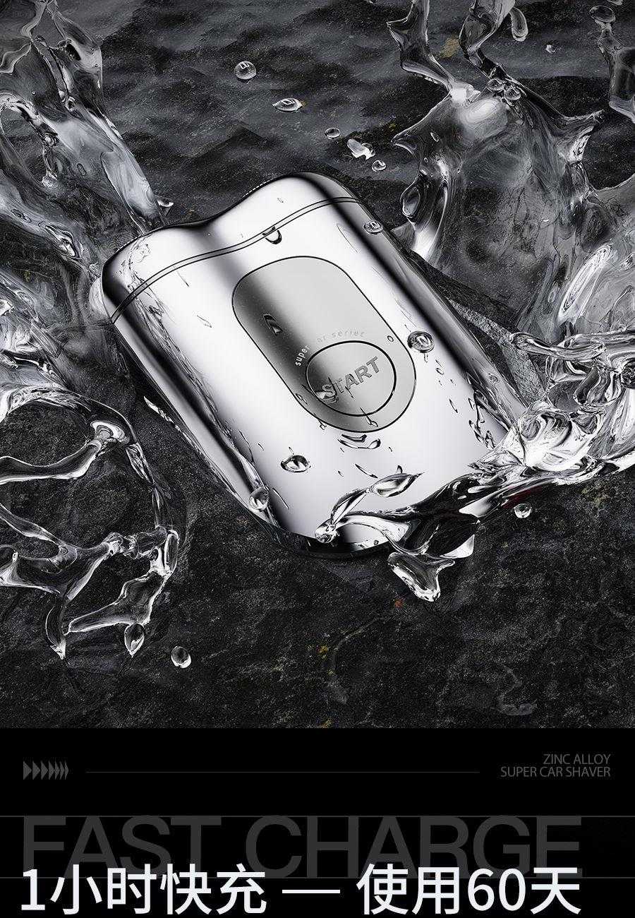 电机转速:9000转/min 机身材质:锌合金 刀头材质:精钢 刀头数量:2个 产品尺寸:长74mm;宽54mm;高30mm 产品净重:0.17kg 电压:5V 防水等级:IPX7,可全身水洗 充电时间:1小时快充 续航:60天 1、设计精致小巧,超高颜值,轻松随行; 2、电镀合金机身,溜背流线型设计,贯穿式尾灯; 3、双环弧面刀网,3D浮动刀头; 4、8000转高速静噪电机,够性能才够快; 5、54组双层刀片, 顺滑贴肤,干湿两剃; 6、IPX7级防水等级,可全身水洗;