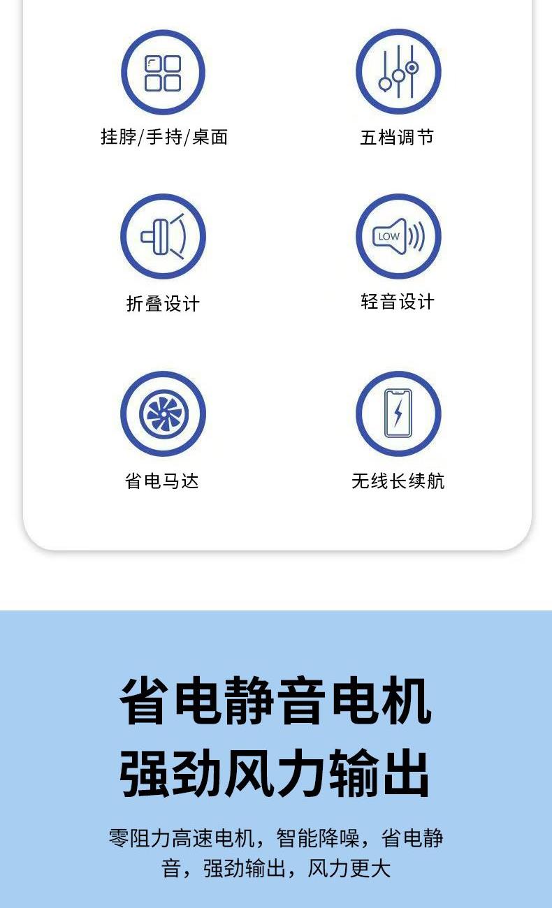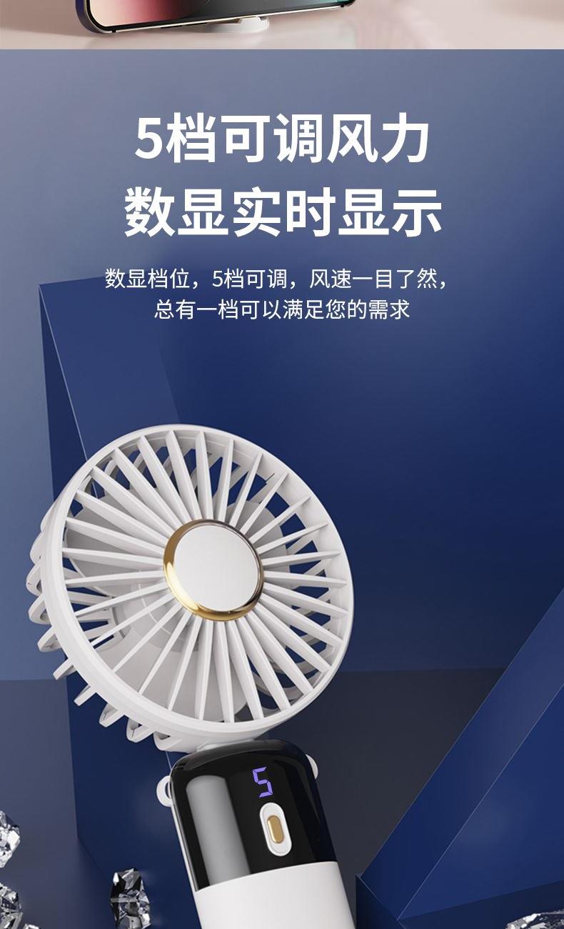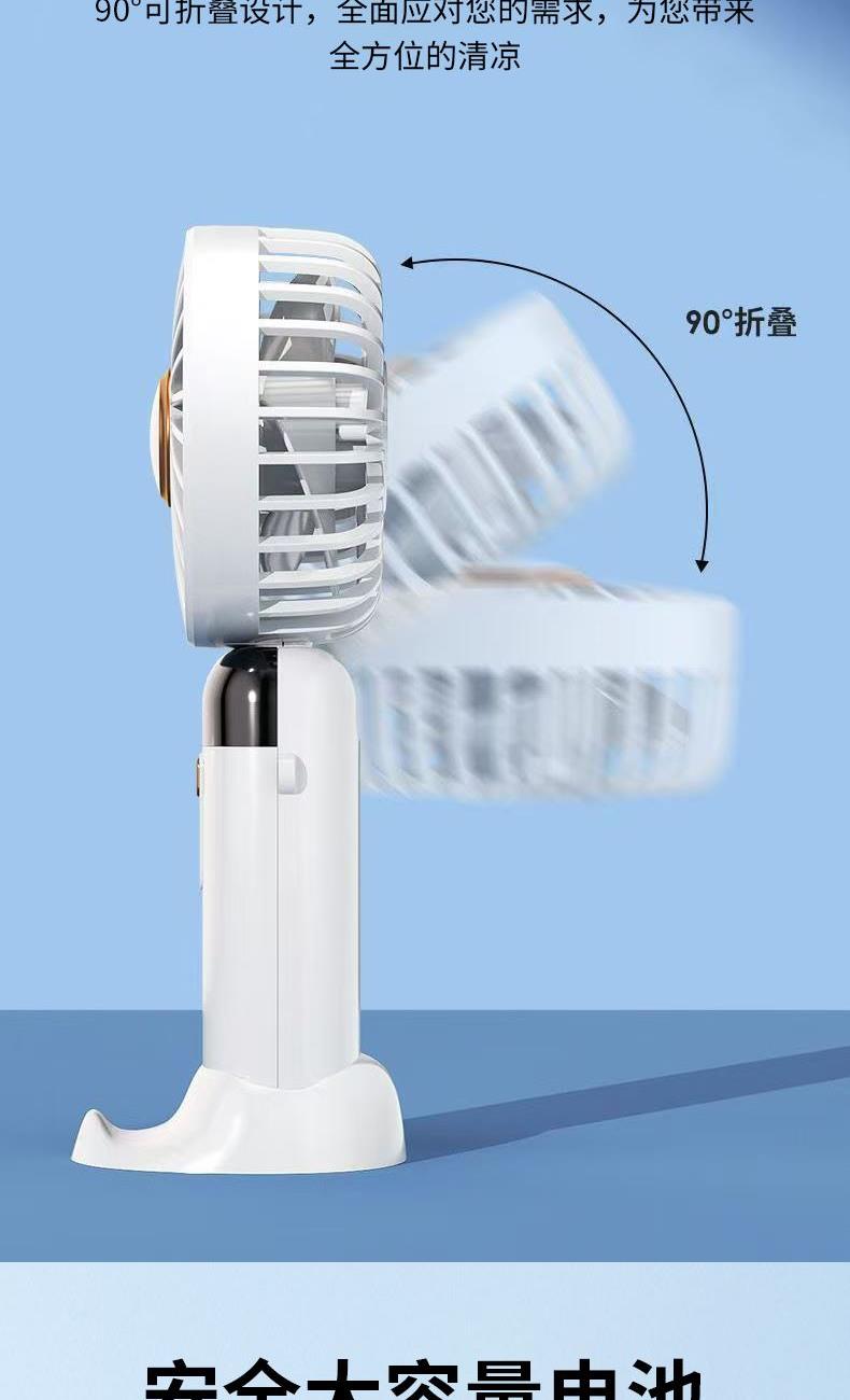 产品型号:F001 产品颜色:白色 产品尺寸:约200*90*40MM(含底座) 产品材质:ABS+电子元件 电池容量:800mAh 额定功率:1W 充电参数:DC5V1A 充电时长:约1小时 使用时长:约1-3小时(视不同档位风量) 使用方式:手持、挂脖、桌面三种 附加功能:手机支架 手持挂脖桌面三用、数显档位、智能数显、五档强劲大风力 产品特点:1、精致小巧,携带方便,通用手持挂脖桌面三种使用方式;2、数显档位,随心调档,一目了然;3、五档可调风量,总有适合您的风力;4、低功耗静音马达,配合消音风叶,风力强劲,静音省电;5、90度可调节出风角度,清凉无死角;6、充插两用,可以一边充电一边使用;7、底座可当手机支架使用,解放双手,尽情娱乐;8、可靠电池,快速充电,超长续航;9、彩盒包装,支持各类定制。