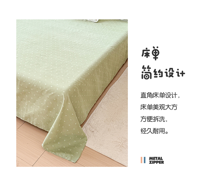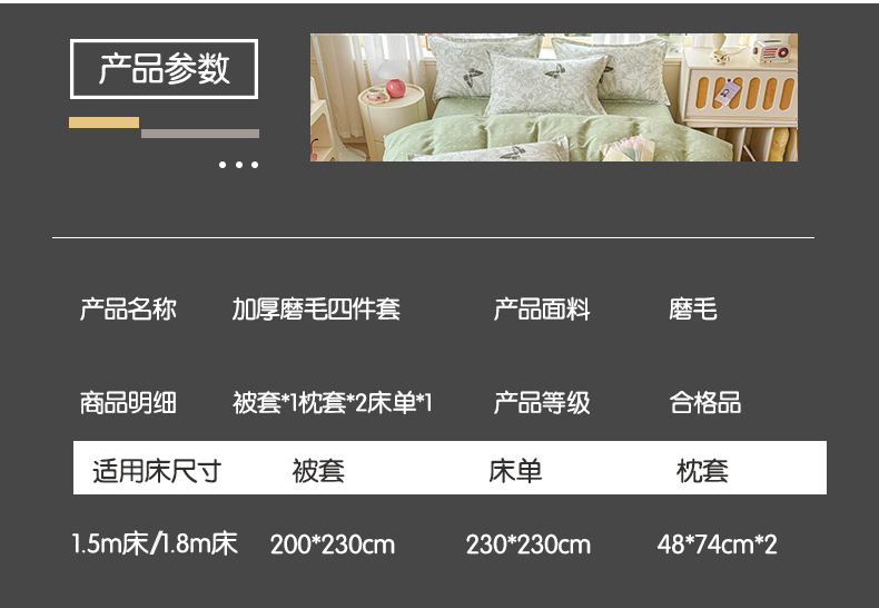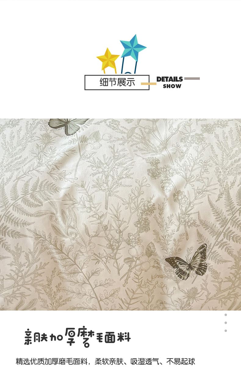 被套:200×230cm 床单:230×230cm 枕套:48×74cm 适用:1.5M-1.8M床 面料:磨绒(聚酯纤维) 印染工艺:环保印花 包装:精美手提盒 甄选柔肤棉面料,质地柔软 细腻,搭配时尙印花点缀柔和色彩的选择 手感舒适亲肤细腻 ,一起感受美好邂逅。