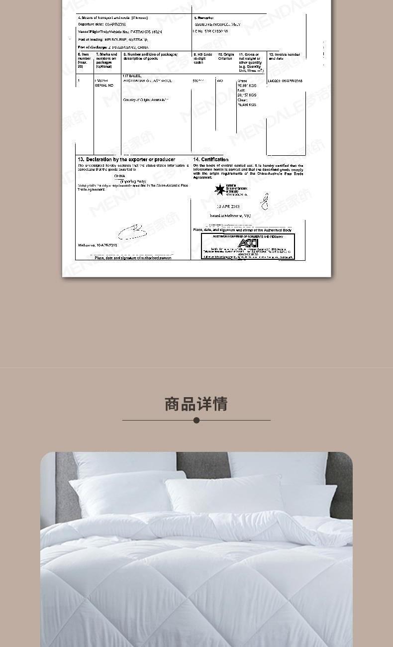 面 料:全涤磨毛 尺 寸:200×230cm 填充物 : 51%澳毛+49%聚酯纤维 填充克重:2100g 填充:羊毛本身具有良好的吸、放湿性。羊毛工艺与纤维均匀混纺,平整且蓬松,无异味。 面料:手感细腻,亲肤柔软,舒适贴合; 工艺:蓬松回弹、厚实保暖;细致包边,固定被芯。