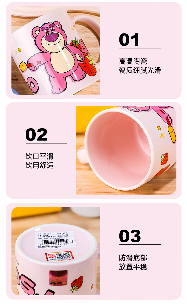 尺寸:12*9.5cm 产品工艺:色釉 容量:350ml 卖点: ①色釉工艺,4款图案可选 ②用高温色釉工艺不易脱落褪色 ③陶瓷材质无铅无镉更安心 ④高温烧制无铅镉可与食物直接接触 ⑤小巧可爱开启趣味饮用时光 ⑥细腻品质,看得见,高温陶瓷瓷质细腻光滑、饮口平滑饮用舒适、防滑底部放置平稳