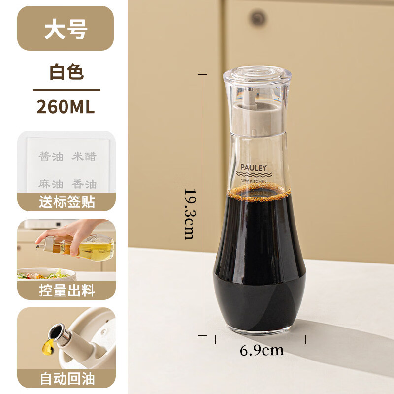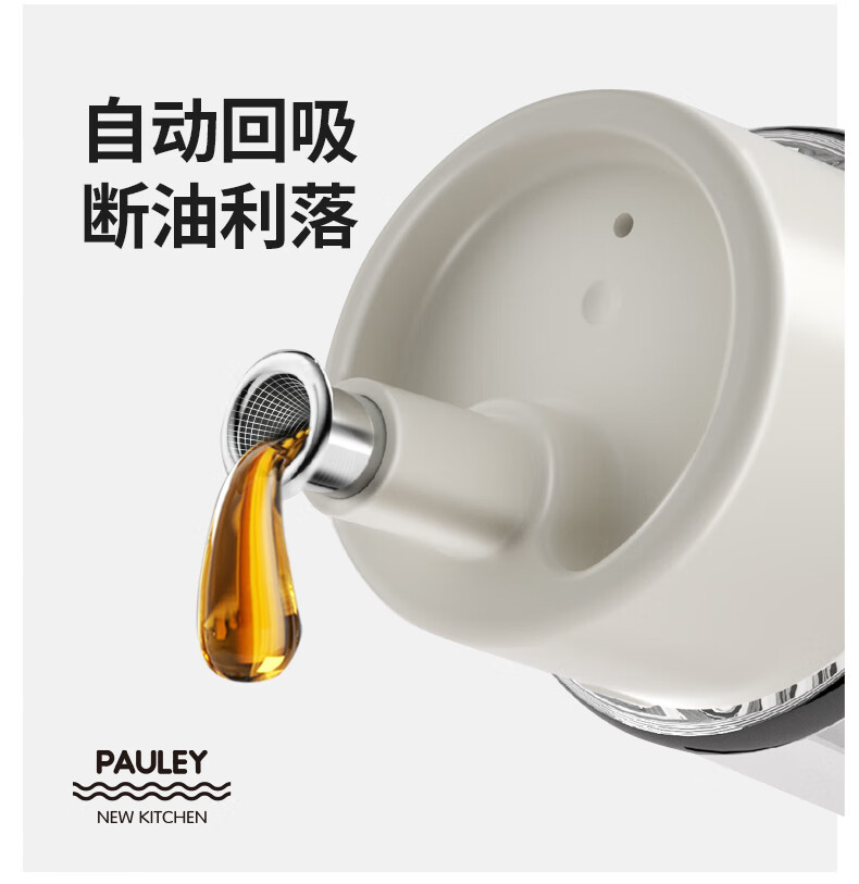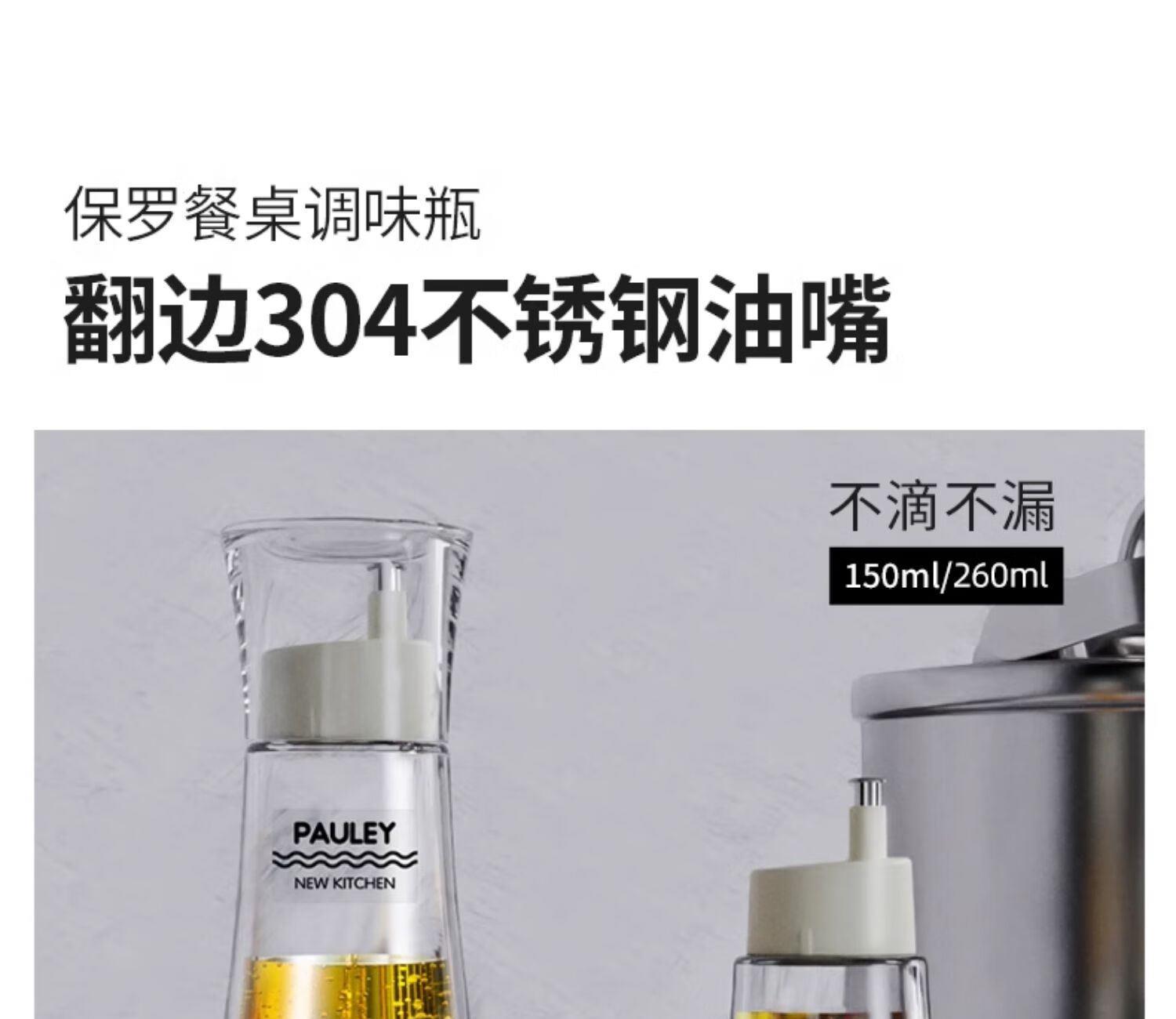 保罗餐桌调味瓶 透明外盖防尘防灰,安全玻璃材质 翻边304不锈钢油嘴 防止滴挂,自动回吸,断油利落 安全无异味 可视调味, 无铅玻璃/安全耐用 随心添加油量,螺纹瓶口/密封性能好 硅胶圈安全密封,不易洒漏/随心放置/调味储存更放心 加厚底部 稳固耐用,一体成型/小巧精致/平稳放置不易倒